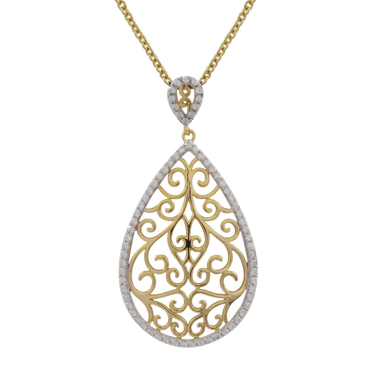 Sterling Silver Two Tone 26X40mm Filigree Teardrop Pendant With White CZ Border- 2"