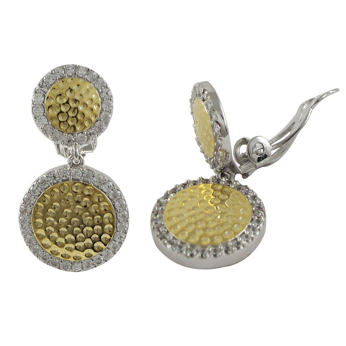 Sterling Silver Two Tone Hammered CZ Clip Earrings-1.1"