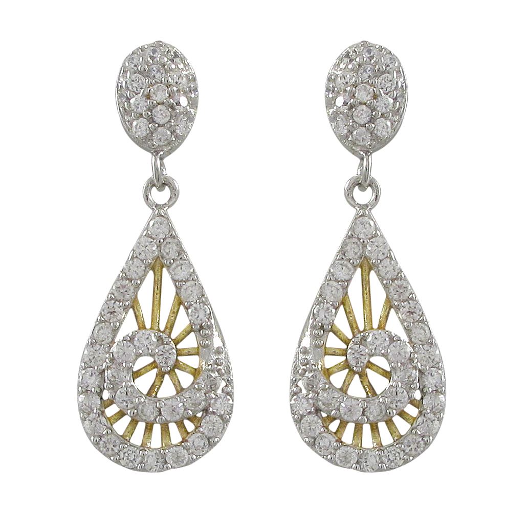 Sterling Silver Two Tone Teardrop CZ Post Earrings -1.14"