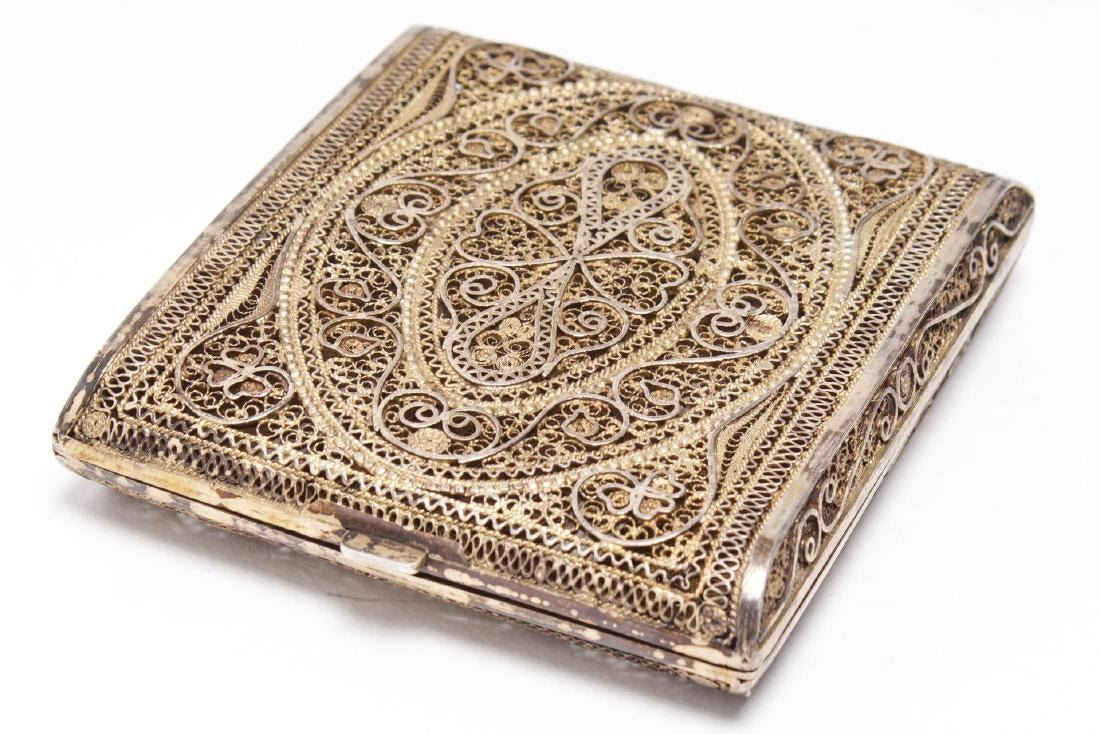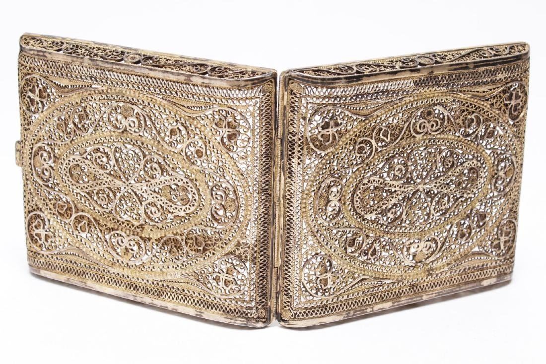 Sterling silver and vermeil filigree antique cigarette case, possibly Austrian, with delicate scrollwork, hearts, and other imagery the exterior with partial vermeil gold-wash, the interior vermeil. 3" H X 3.5" W. Approx. 3.5 ozt.