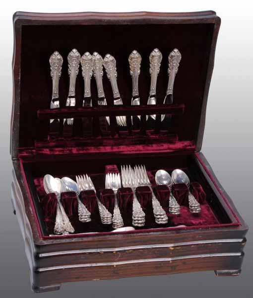 Description Set includes 41 pieces. Contains eight knives, 16 teaspoons, eight forks, eight salad forks, and one serving spoon. Includes a wooden velvet lined case for all pieces. Condition (Excellent).