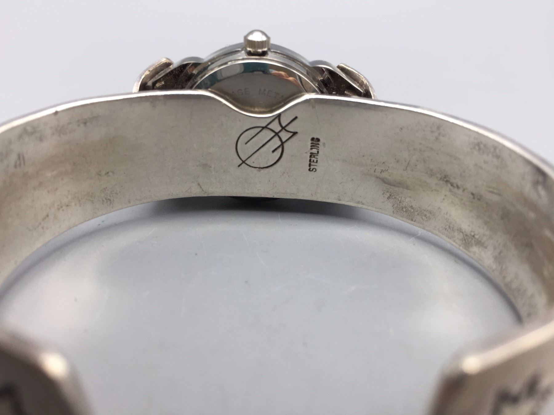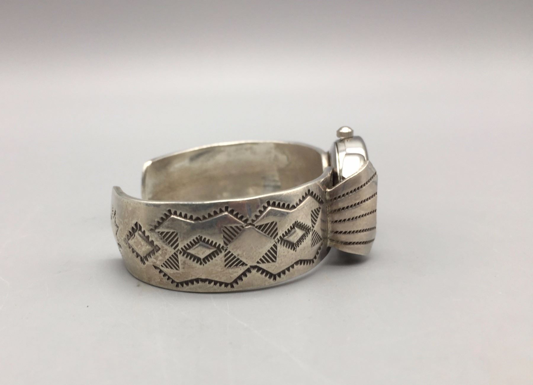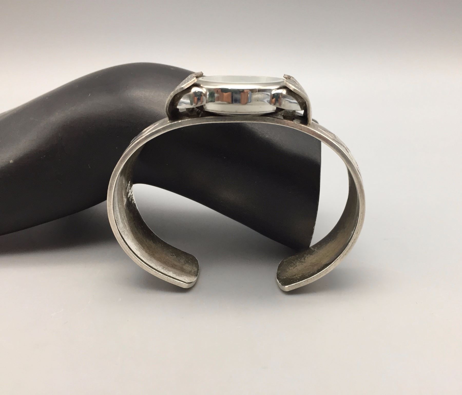 Description: Sterling silver watch bracelet. Maker: Hallmarked, unable to determine maker. Approx. Age: Vintage. Size: Inside circumference measures approx. 5 3/8“ with a 7/8” gap (making this bracelet fit about a 5 1/4” wrist). It is 1” wide across the face and weighs 54.3 g. Condition: Good for its age, normal wear expected. Please look closely at the pictures - they are an important part of our description. Shipping: There will be a $5 handling / packaging fee for shipping this lot. The actual cost of postage will be added on top of that.