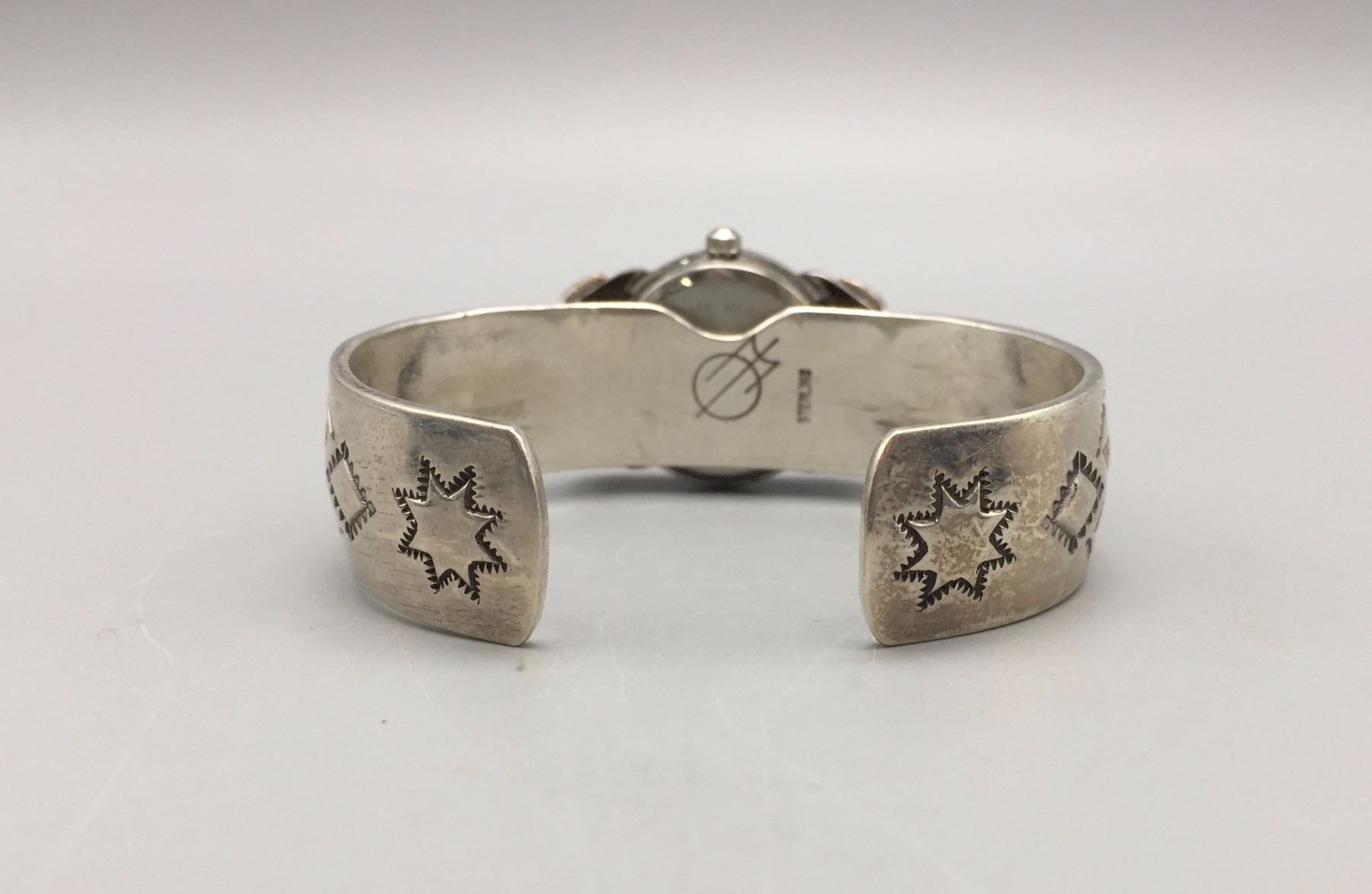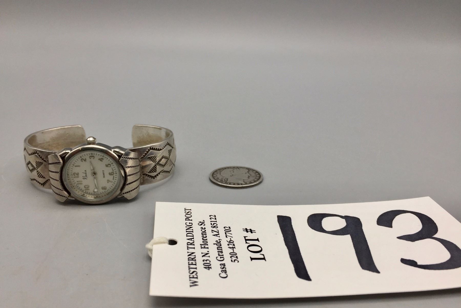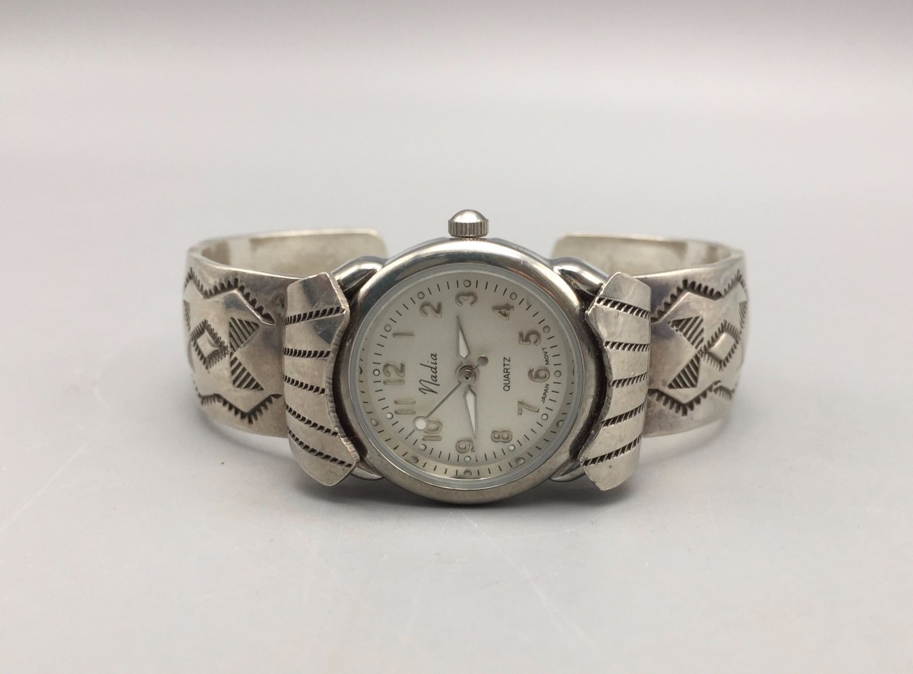 Description: Sterling silver watch bracelet. Maker: Hallmarked, unable to determine maker. Approx. Age: Vintage. Size: Inside circumference measures approx. 5 3/8“ with a 7/8” gap (making this bracelet fit about a 5 1/4” wrist). It is 1” wide across the face and weighs 54.3 g. Condition: Good for its age, normal wear expected. Please look closely at the pictures - they are an important part of our description. Shipping: There will be a $5 handling / packaging fee for shipping this lot. The actual cost of postage will be added on top of that.