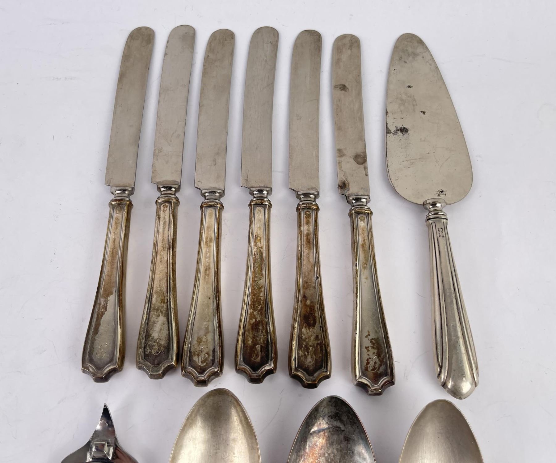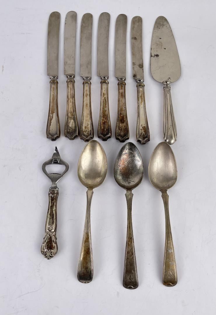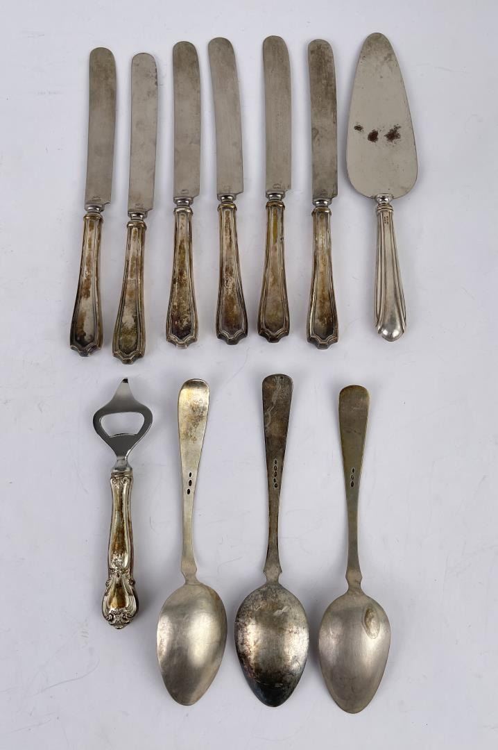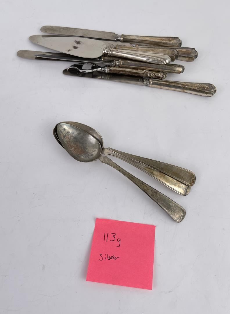 Nice grouping. Sterling weighted handle and Coin Silver Spoons. Weight of coin silver spoons alone is 113 grams.