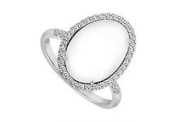 A beautifully prong-set large oval white agate in the center & is surrounded by brilliant-cut round diamonds. Other smaller round white CZs adorn both sides. This perfect design ring is made in rhodium .925 sterling silver & has a total gem weight (TGW) of 16.00 carats.