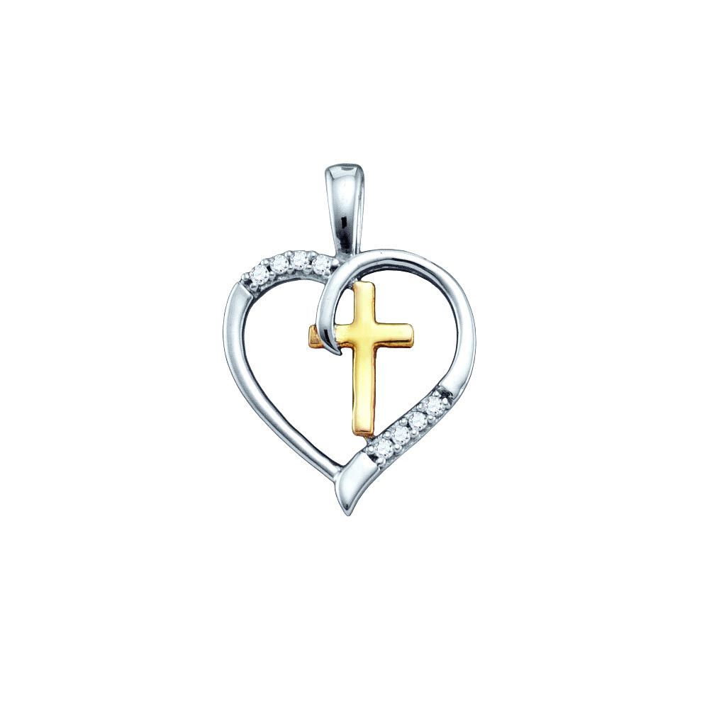 Sterling Silver Womens Round Diamond Heart & Cross Two- **|**|** Sterling Silver Womens Round Diamond Heart & Cross Two-tone Pendant 1/20 Cttw