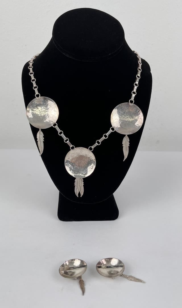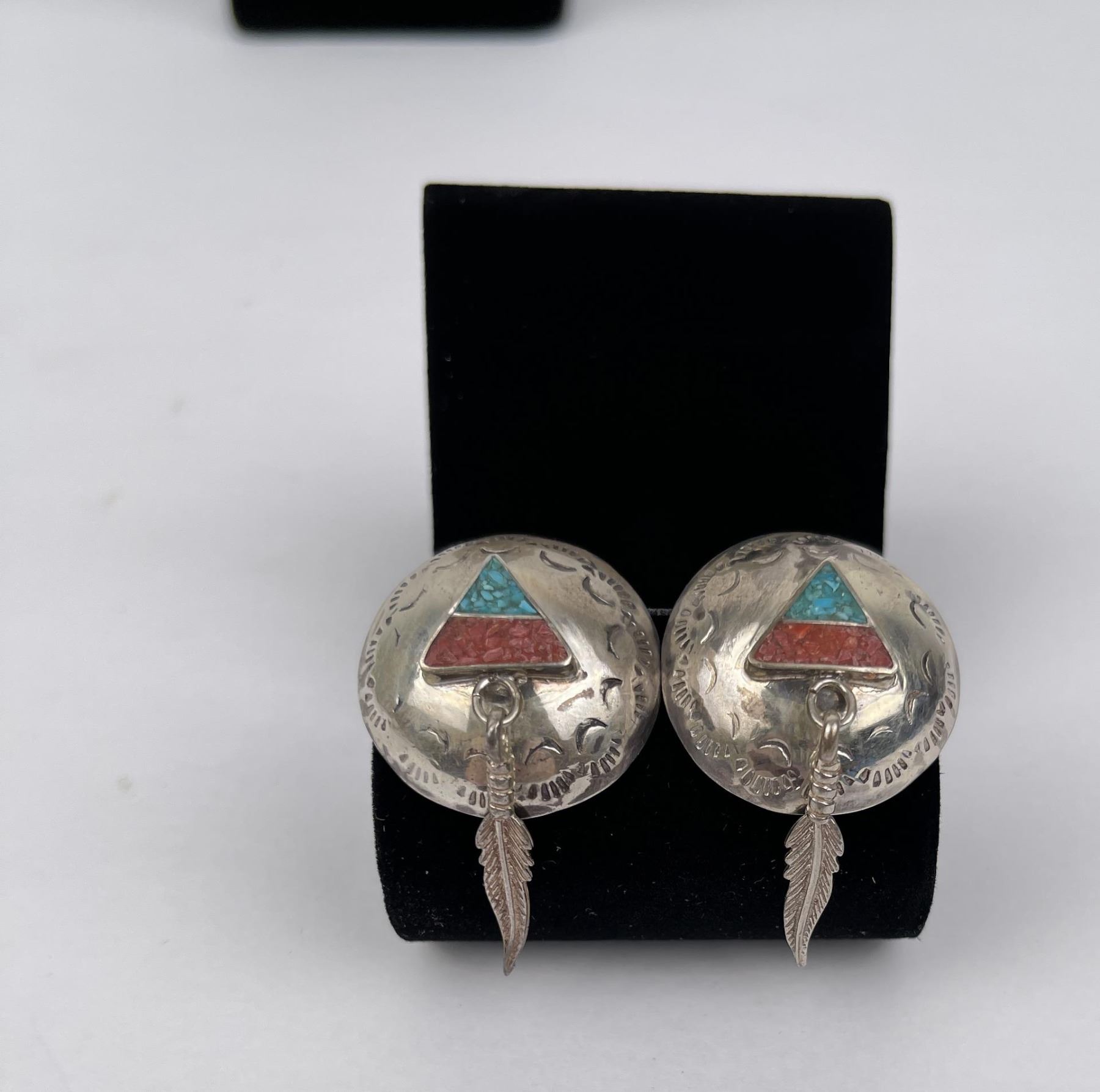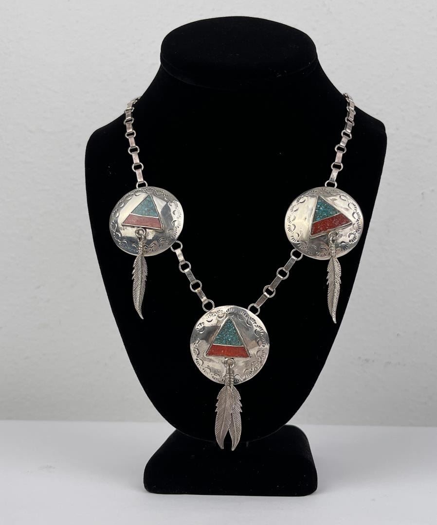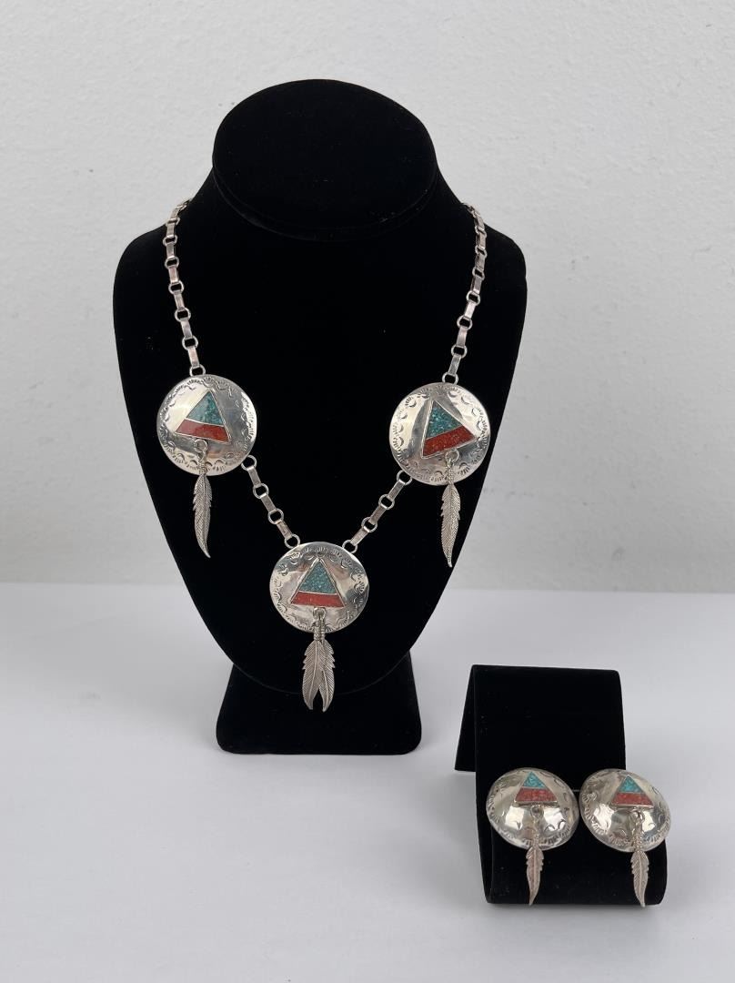 Necklace and earring set. Inlaid with turquoise and coral. Sterling silver.