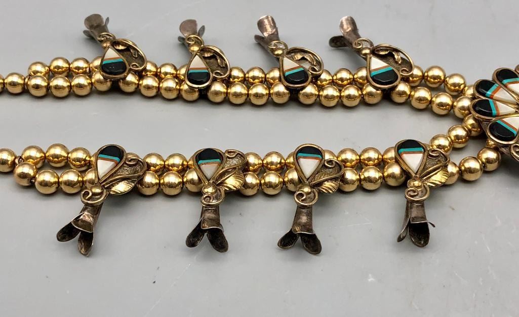 For sale in this lot is a sterling silver and 12k gold filled inlay squash blossom necklace. This is a great, delicate necklace with tear drop inlay settings of turquoise, coral, onyx and mother of pearl, accented with elegant floral leaf applique. It is strung on foxtail chain and stamped as sterling and 12k gold filled. MAKER: Unmarked. APPROX AGE: Vintage. SIZE: Measures 23 inches end to end. Pendant measures 1-1/2 inches long X 1-3/4 inches wide. Weighs 57.1 grams. CONDITION: Good for its age, normal wear expected. Please look closely at the pictures as they are an important part of our description and are hereby incorporated into the description, specifically with regards to condition. SHIPPING: There will be a $5 handling / packaging fee for shipping this lot. The actual cost of postage will be added on top of that. BUY IT NOW: If you would like to buy this item now, without waiting for the auction day to bid on it, we do offer this option (which is available up to 48 hours before the actual auction starts). The “Buy it Now†price is the high estimate of this lot (plus applicable fees and the Buyer's premium is discounted to 10% when using the Buy it Now option). If you would like to exercise this option, you must contact us by email (or phone as long as you talk to someone live). Reference this lot number and your intention to "Buy it Now."