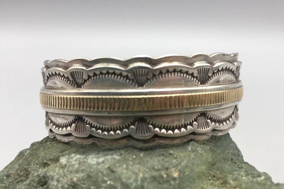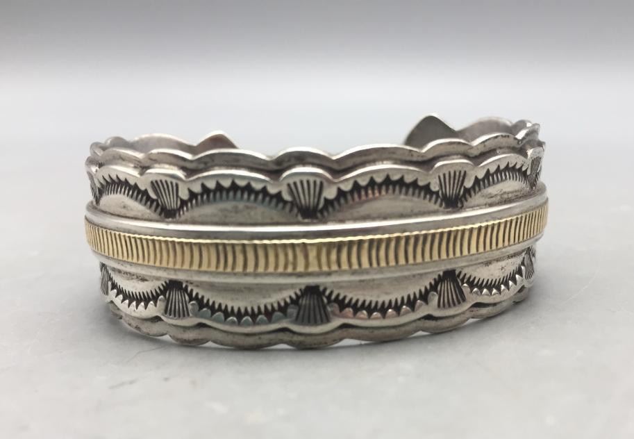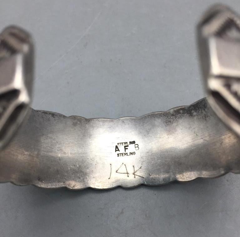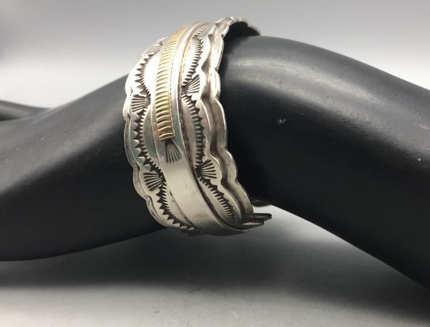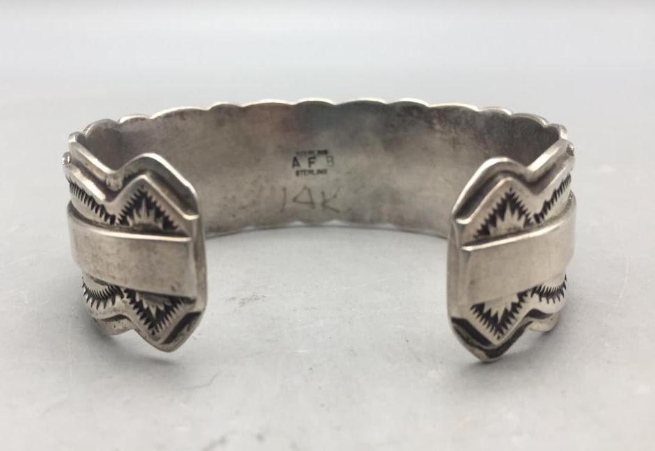 Description: Presented for sale in this lot is a sterling silver and 14k gold cuff bracelet. It has a nice hefty feel to it and has eye catching stamp work. Marked Sterling and 14K (in etched script). Maker: AFB, Arland F Ben (1962-; Navajo). Active since 1990s. Approx. Age: Fairly Modern. Size: Inside circumference measures 5-1/4 inches long. Opening is an additional 1 inch, fitting a 6-1/4 inch wrist. Width is 7/8 inches. Weighs 62.2 grams. Condition: Good for its age, normal wear expected. Please look closely at the pictures - they are an important part of our description. Shipping: There will be a $5 handling / packaging fee for shipping this lot. The actual cost of postage will be added on top of that.