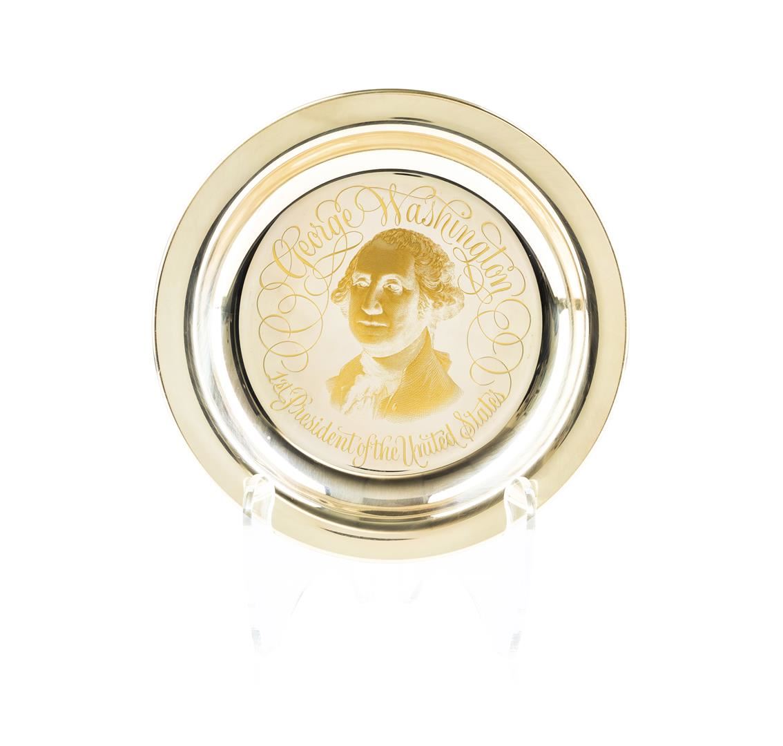 This is the "The George Washington Plate" issued by the White House Historical Association. 1972 Certificate #7114. The plate is in good vintage condition, measuring eight inches and weighing 177 grams of .925 sterling.