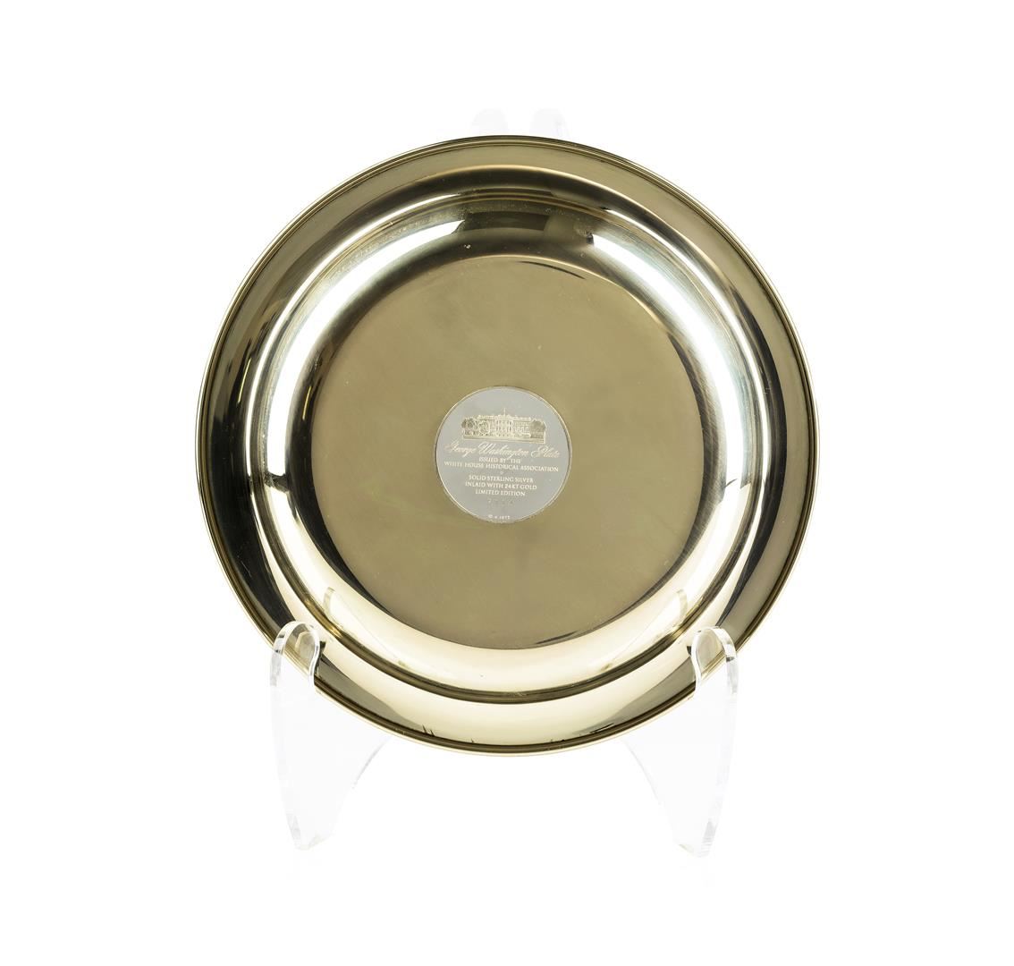 This is the "The George Washington Plate" issued by the White House Historical Association. 1972 Certificate #7114. The plate is in good vintage condition, measuring eight inches and weighing 177 grams of .925 sterling.