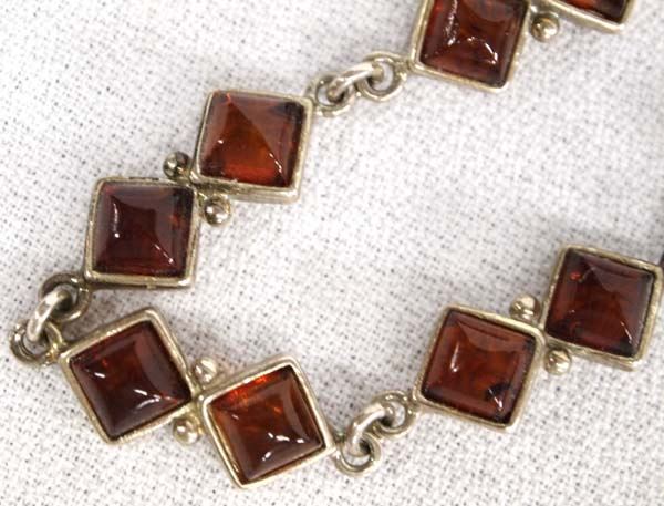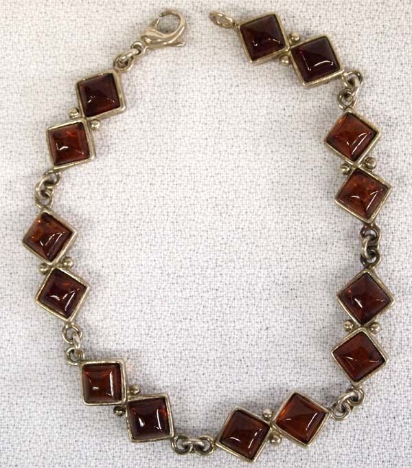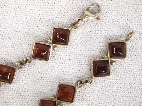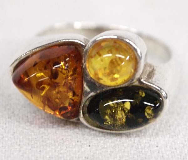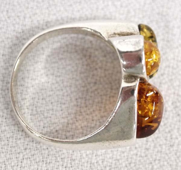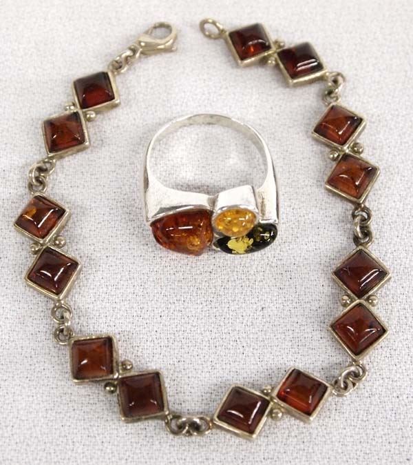 Sterling Silver and Amber Jewelry, both are sterling silver, the ring has 3 amber cabochons including green amber size 9.5, measures 1'' across, the link bracelet measures 7.75''