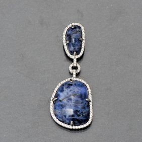 A sterling and blue stone pendant. This pendant features two graduated baroque shaped blue stones framed by white synthetic gemstones. Marked 925. This item is accompanied with a certificate of authenticity and appraisal.