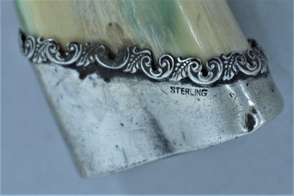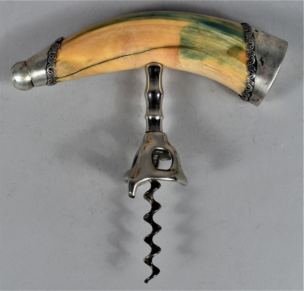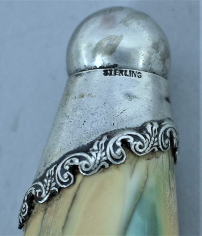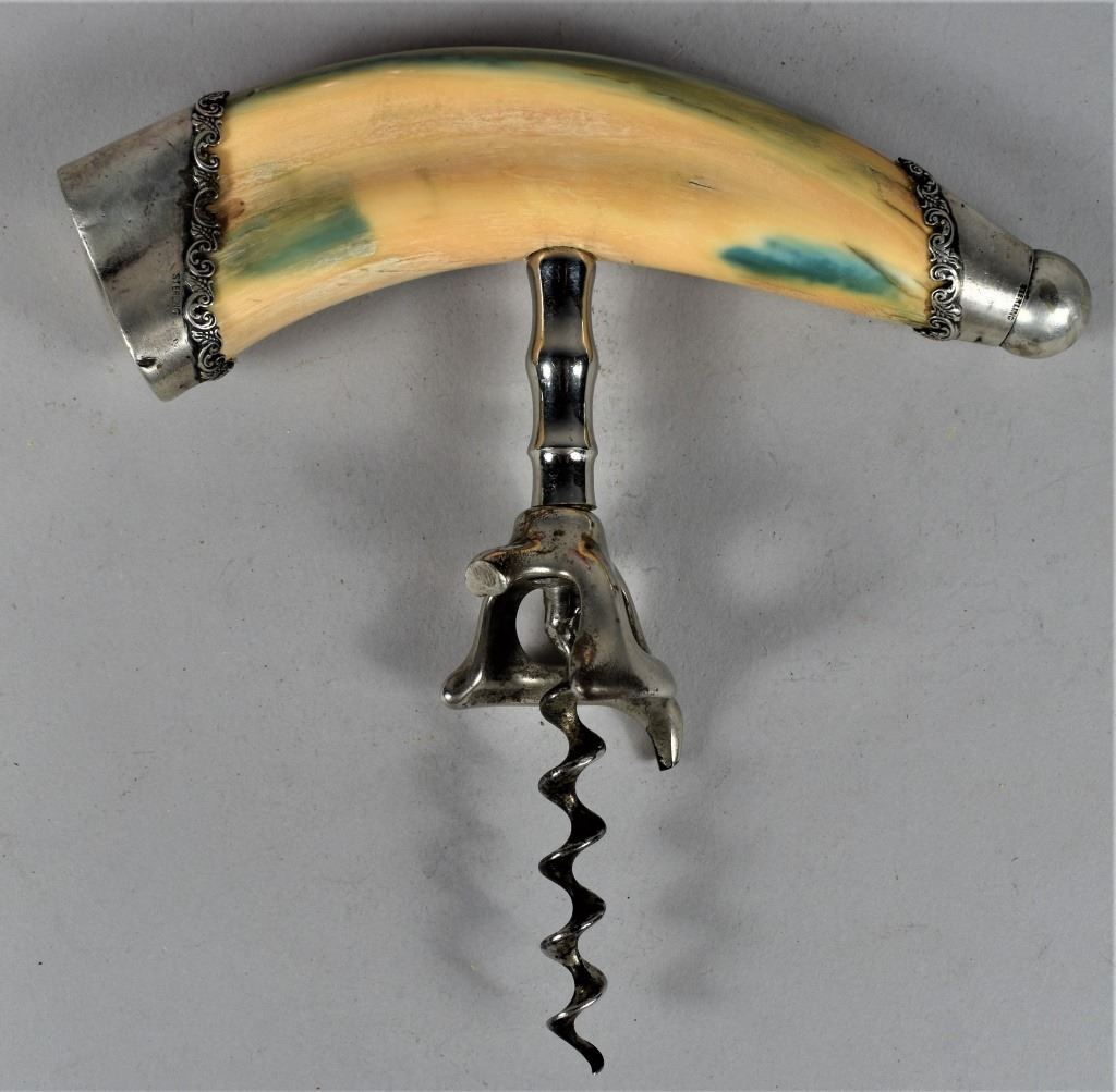 Sterling Silver and Boar's Tusk Cork Screw. Sterling end caps with petite filigree trimmed edges. 5 3/4 inches across.