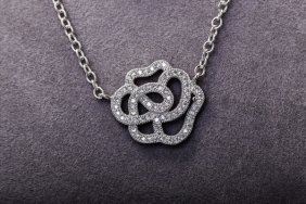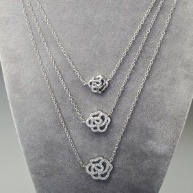 A sterling silver layered necklace featuring three graduated chain link strands, each with a rose pendant in the center. Two pendants are encrusted with cubic zirconia, the third is solid silver. Clasp Marked S 925. This item is accompanied with a certificate of authenticity.