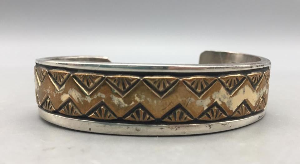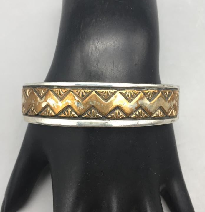 Description: Presented for sale in this lot is a sterling silver and gold fill bracelet. It has nice stamp work on both sides of the bracelet. Marked sterling and 12KGF. Maker: Hallmarked with what looks to be a 4 claw bear paw. Approx. Age: Vintage. Size: Inside circumference measures 5-7/8 inches long. Opening is an additional 1-3/8 inch, fitting a 6-1/4 inch wrist. Width is 5/8 inches. Weighs 83.2 grams. Condition: Good for its age, normal wear expected. Please look closely at the pictures - they are an important part of our description. Shipping: There will be a $5 handling / packaging fee for shipping this lot. The actual cost of postage will be added on top of that.