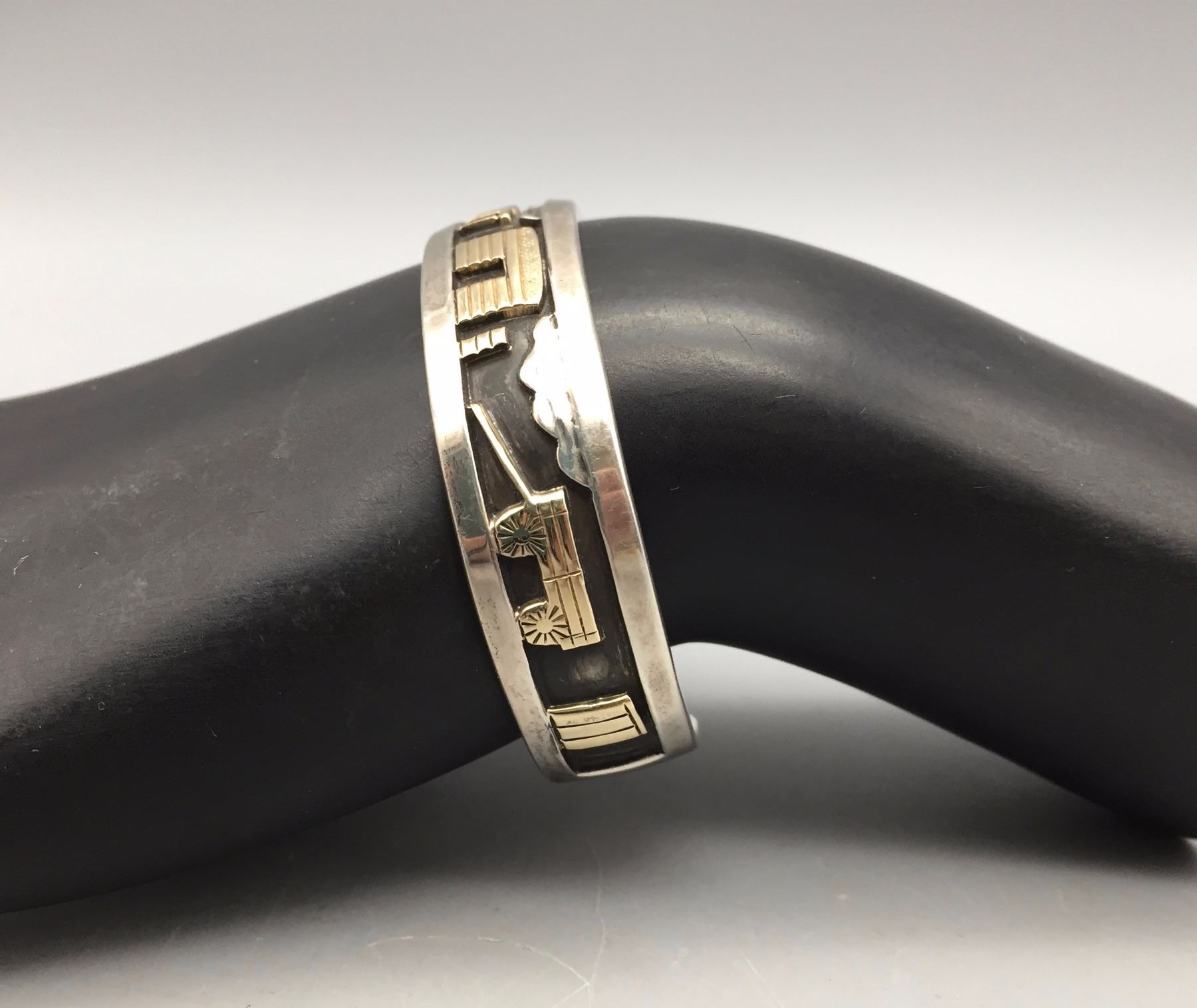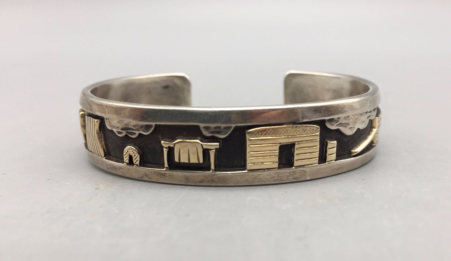 Description: Nice, sterling silver and gold storyteller bracelet. Marked as 14K gold and sterling silver. Maker: Hallmarked RH Begay. Roland Hogan Begay, Navajo. Approx. Age: Fairly modern. Size: Measures 5-3/8” with a 7/8” opening (fits a 6-1/4” wrist). Is a 1/2” wide and weighs 28.8 grams. Condition: Good for its age, normal wear expected. Please look closely at the pictures - they are an important part of our description. Shipping: There will be a $5 handling / packaging fee for shipping this lot. The actual cost of postage will be added on top of that.