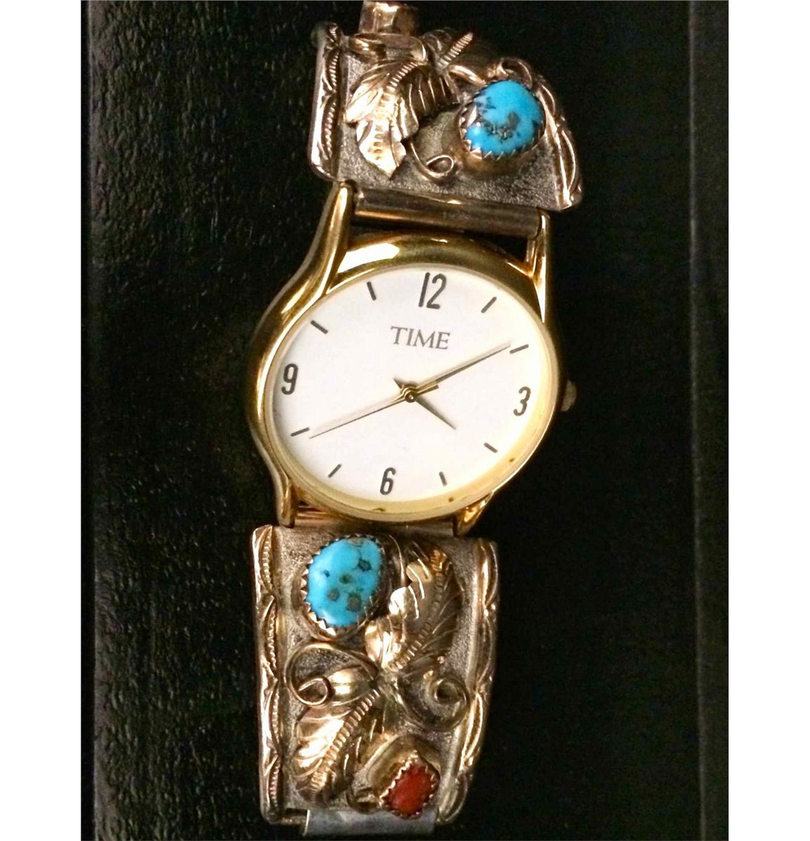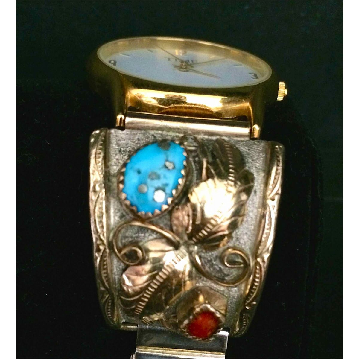 Beautiful Native American style watch tips on a stretch watch band with a working watch face. Marked Sterling and 1/20 12 KGF on reverse.