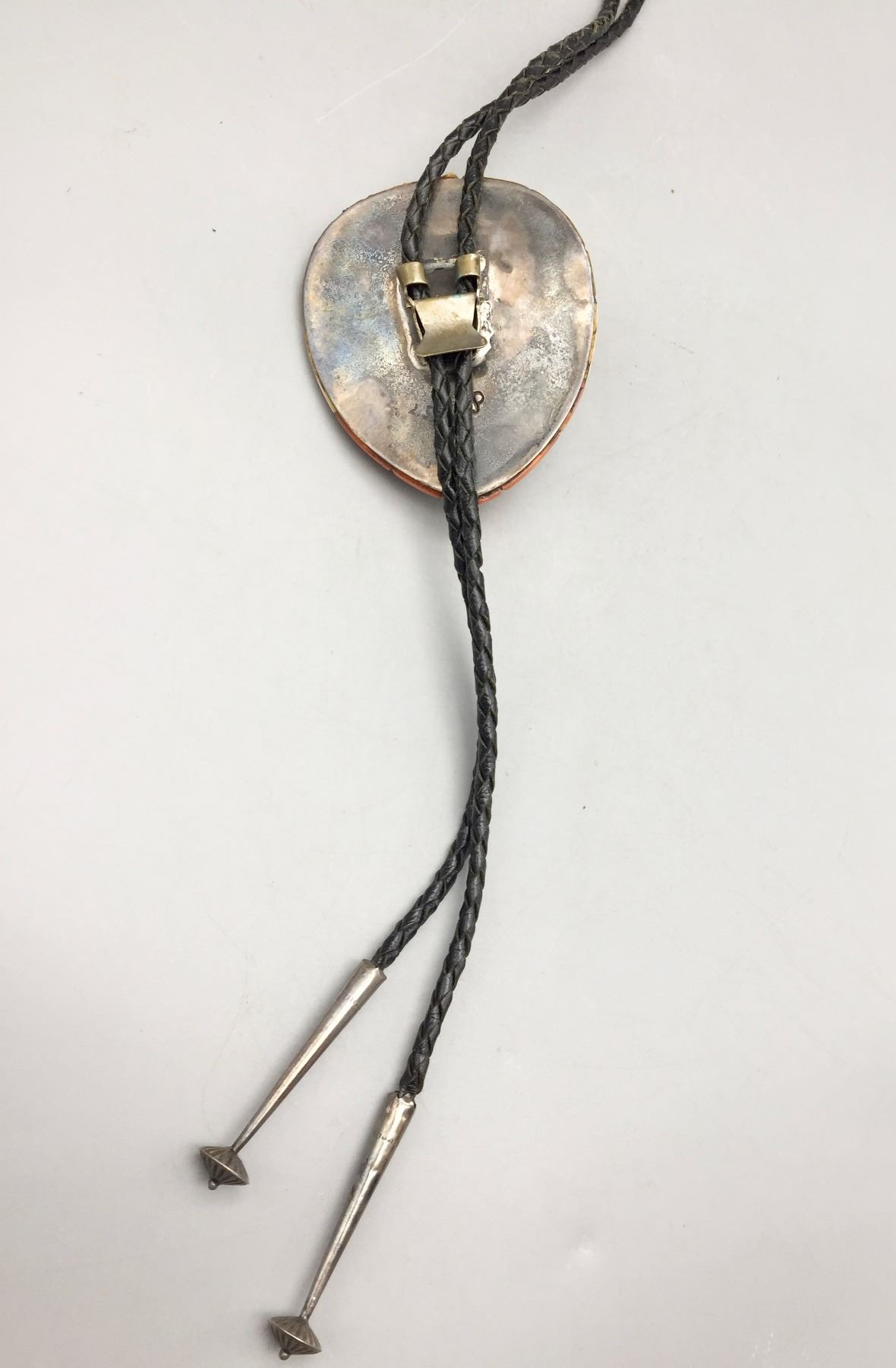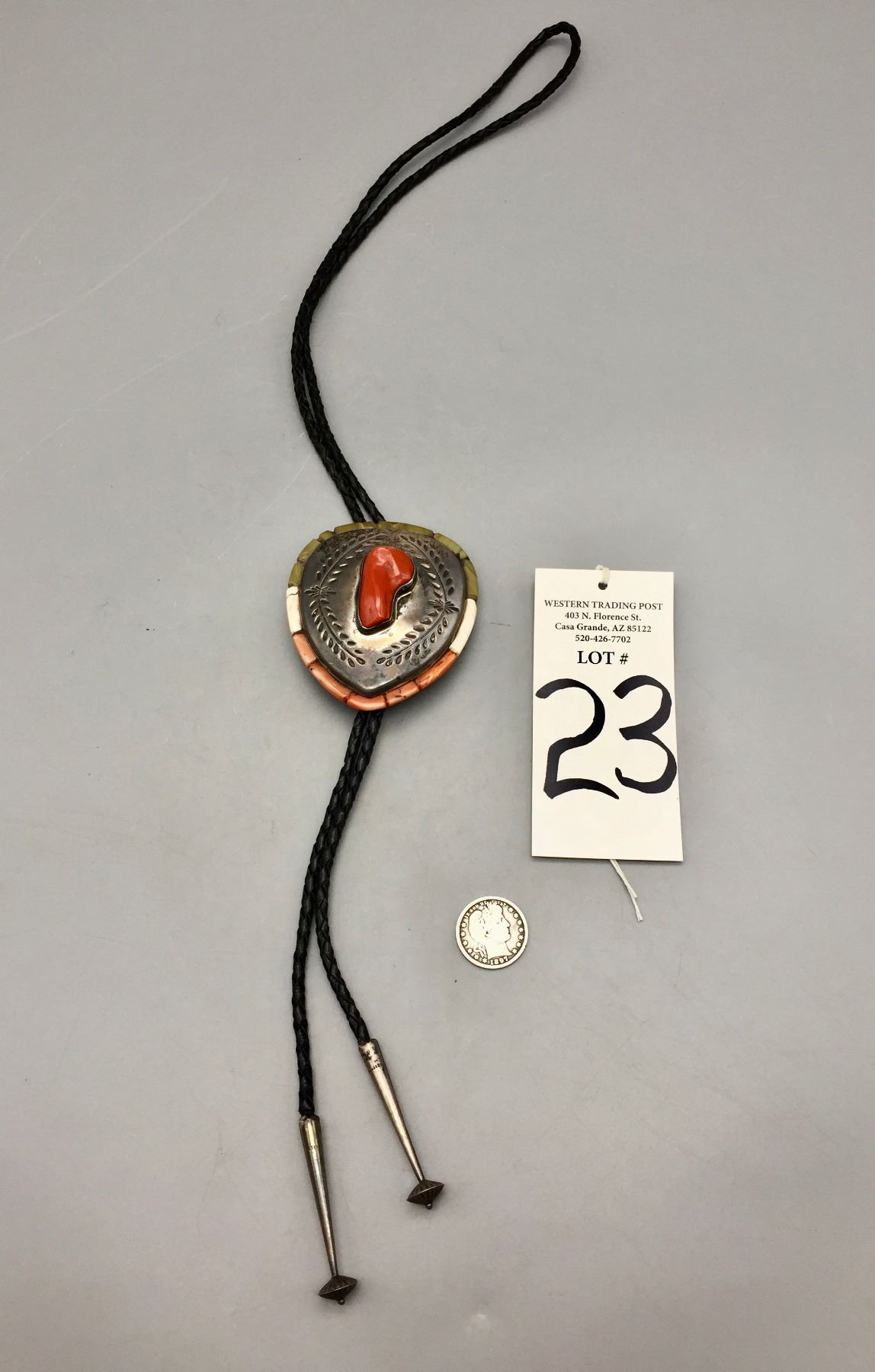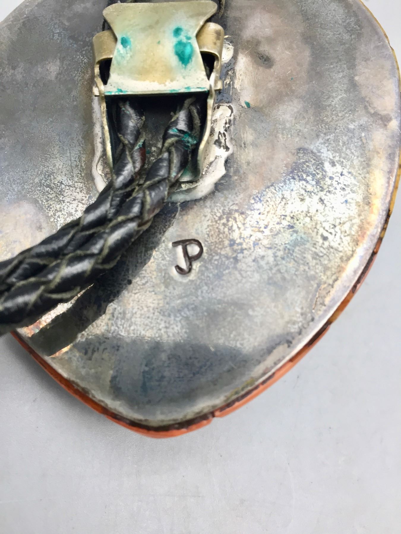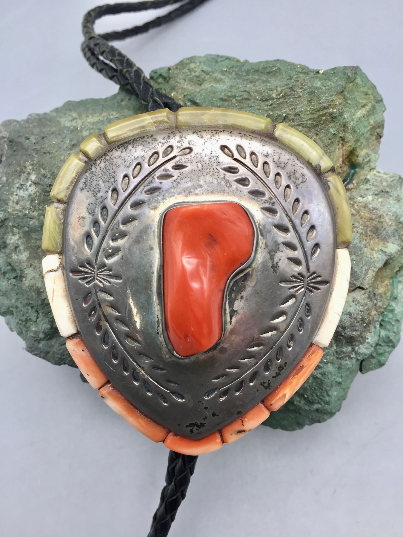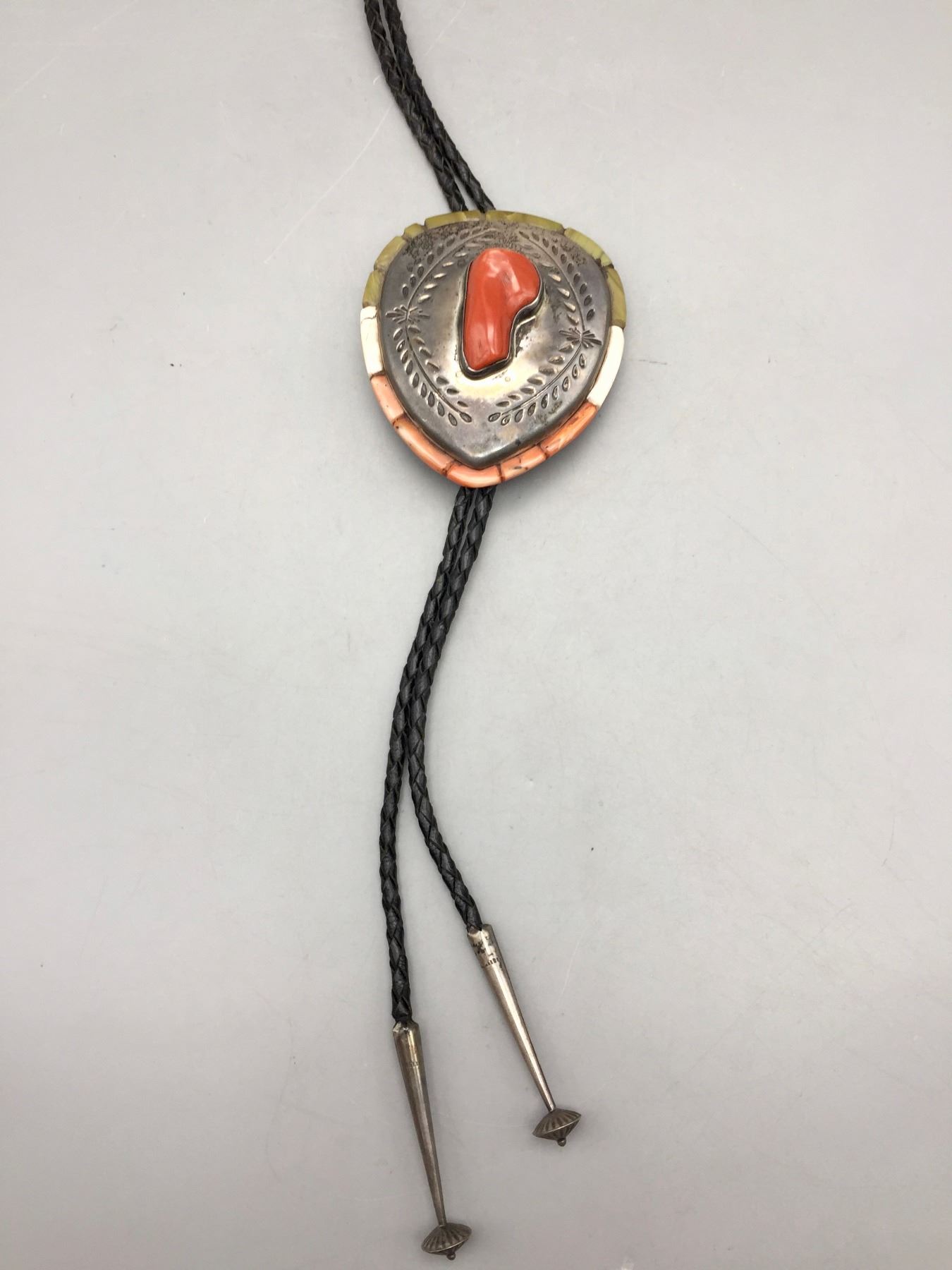 Description: This lot features a multi stone inlay bolo with a coral cabochon, all surrounded by nicely stamped sterling silver. Maker: Hallmarked JP (conjoined). Approx. Age: Vintage. Size: Fits a 40” neck. Slide measures 2-7/8” w x 3-1/8”. Weighs 103.9 grams. Condition: Good for its age, normal wear expected. Please look closely at the pictures - they are an important part of our description. Shipping: There will be a $5 handling / packaging fee for shipping this lot. The actual cost of postage will be added on top of that.