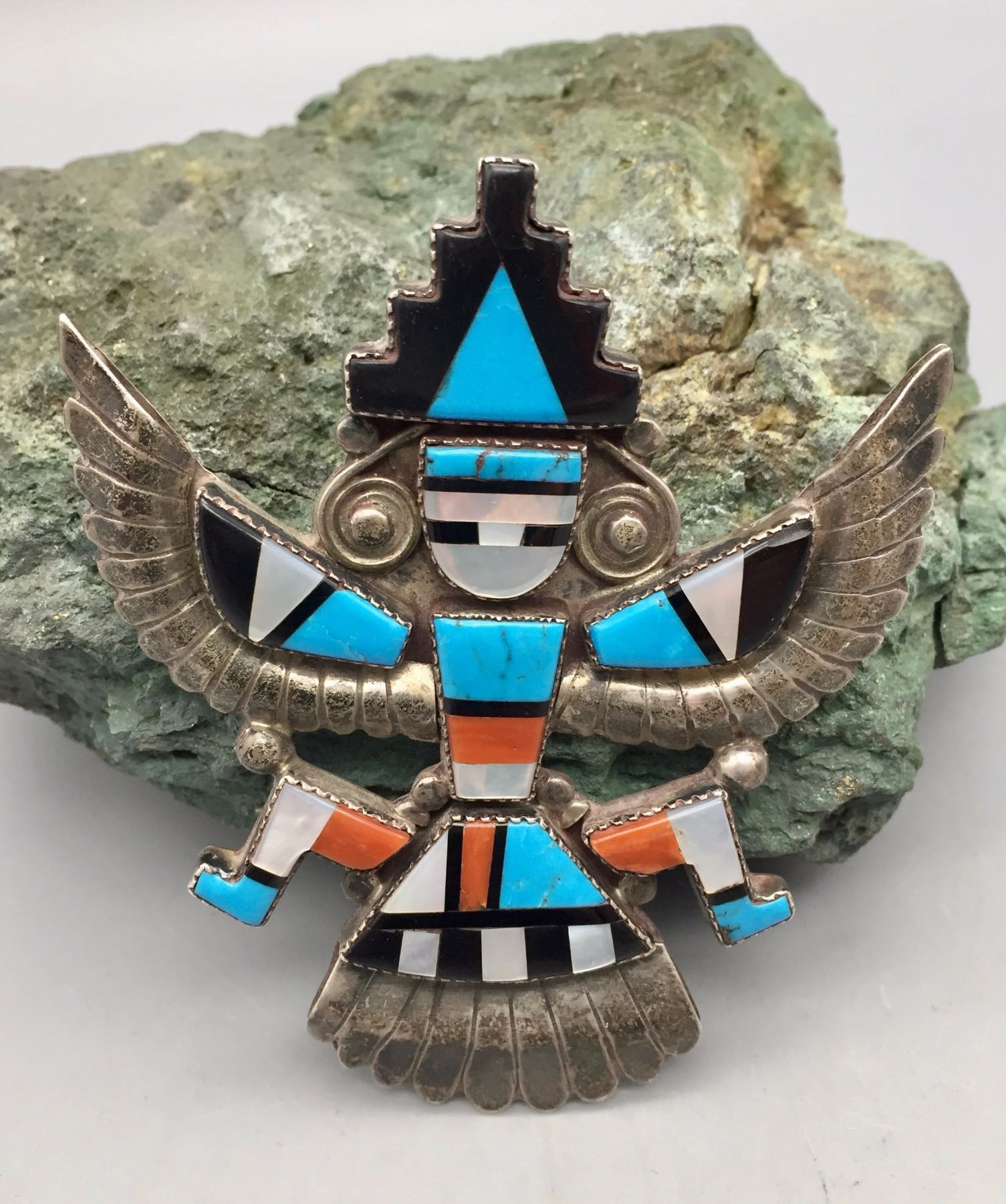 Description: Vibrant, sterling silver knifewing pin/pendant, featuring a multi-stone inlay design. Created by, Alonzo Hustito. Tested as sterling silver. Maker: Hallmarked A.H. in script. Alonzo Hustito (1910 - 1990), Zuni. Approx. Age: Circa 1970s. Size: Measures 2-3/4”w x 3-1/4”h. Weighs 34 grams. Condition: Good for its age, normal wear expected. Please look closely at the pictures - they are an important part of our description. Shipping: There will be a $5 handling / packaging fee for shipping this lot. The actual cost of postage will be added on top of that.