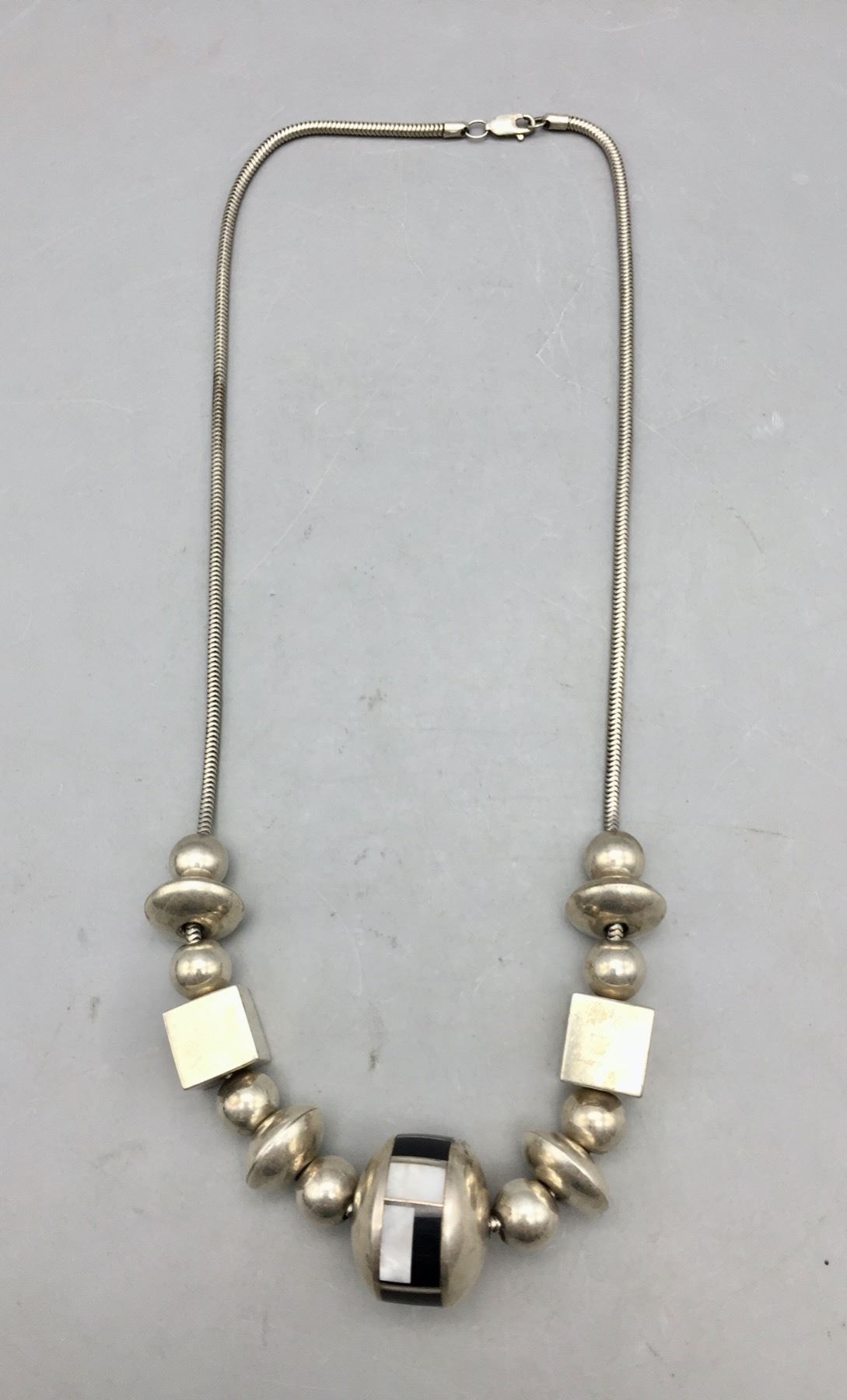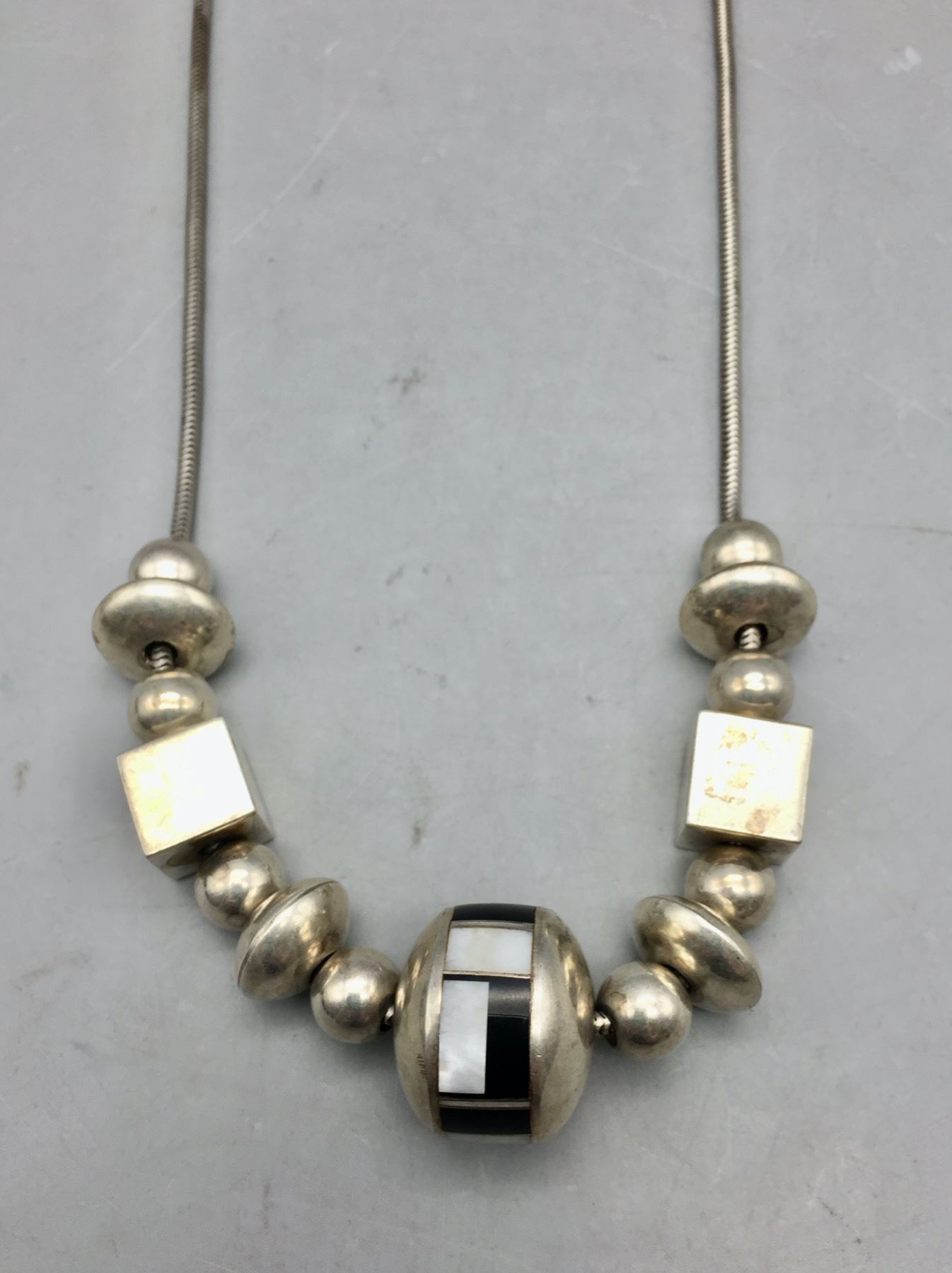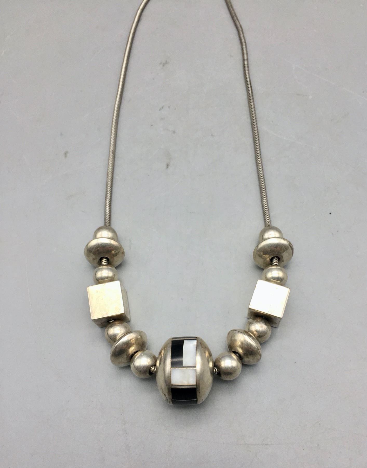 Description: Presented for sale in this lot is a unique sterling silver and inlay necklace with an assortment of different size and shaped beads. It has a large center bead inlaid with onyx and mother of pearl. Maker: Unknown. Approx. Age: Fairly modern. Size: Fits a 18 inch neck. Weighs 56.6 grams. Condition: Good for its age, normal wear expected. Please look closely at the pictures - they are an important part of our description. Shipping: There will be a $5 handling, packaging fee for shipping this lot. The actual cost of postage will be added on top of that.