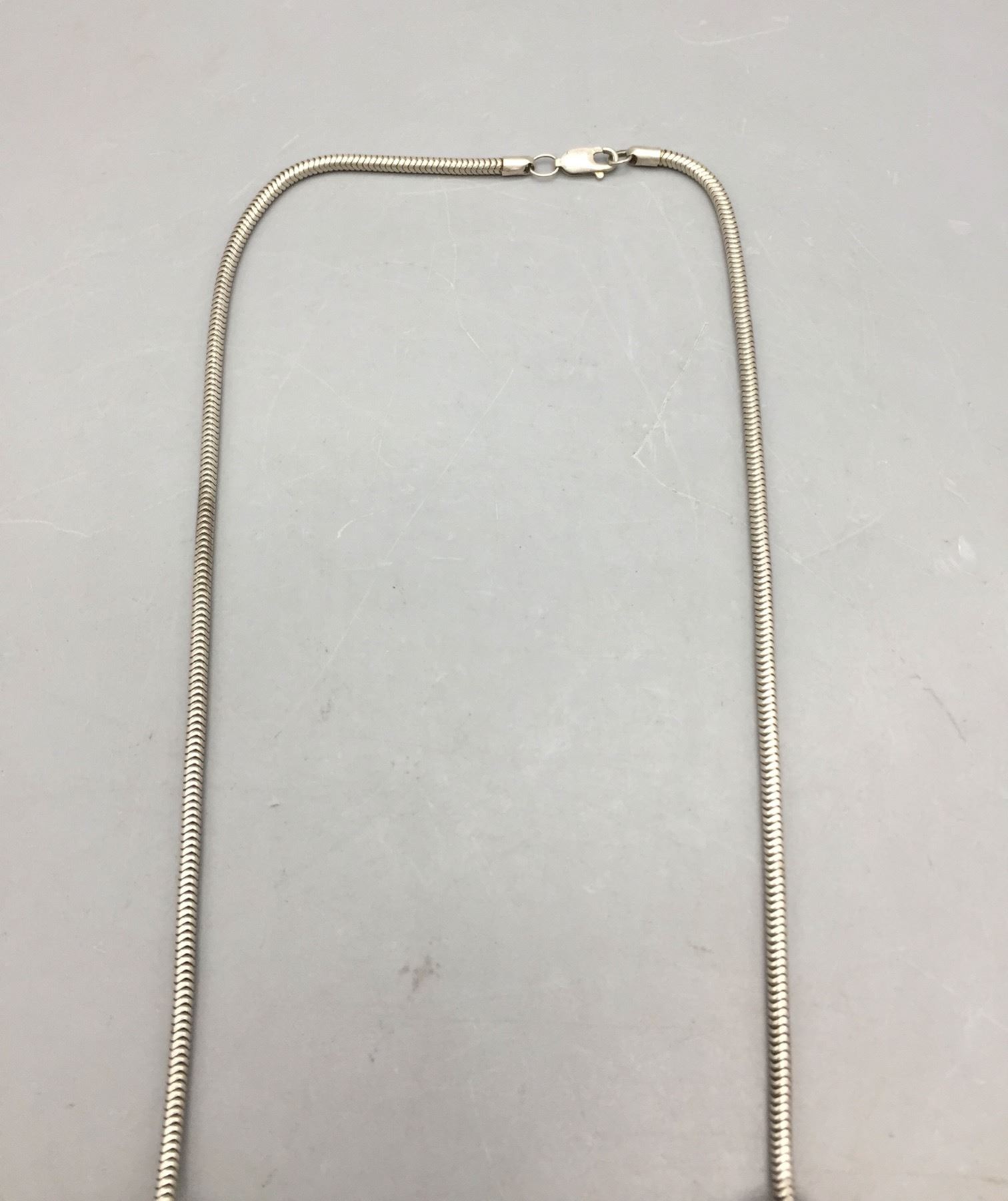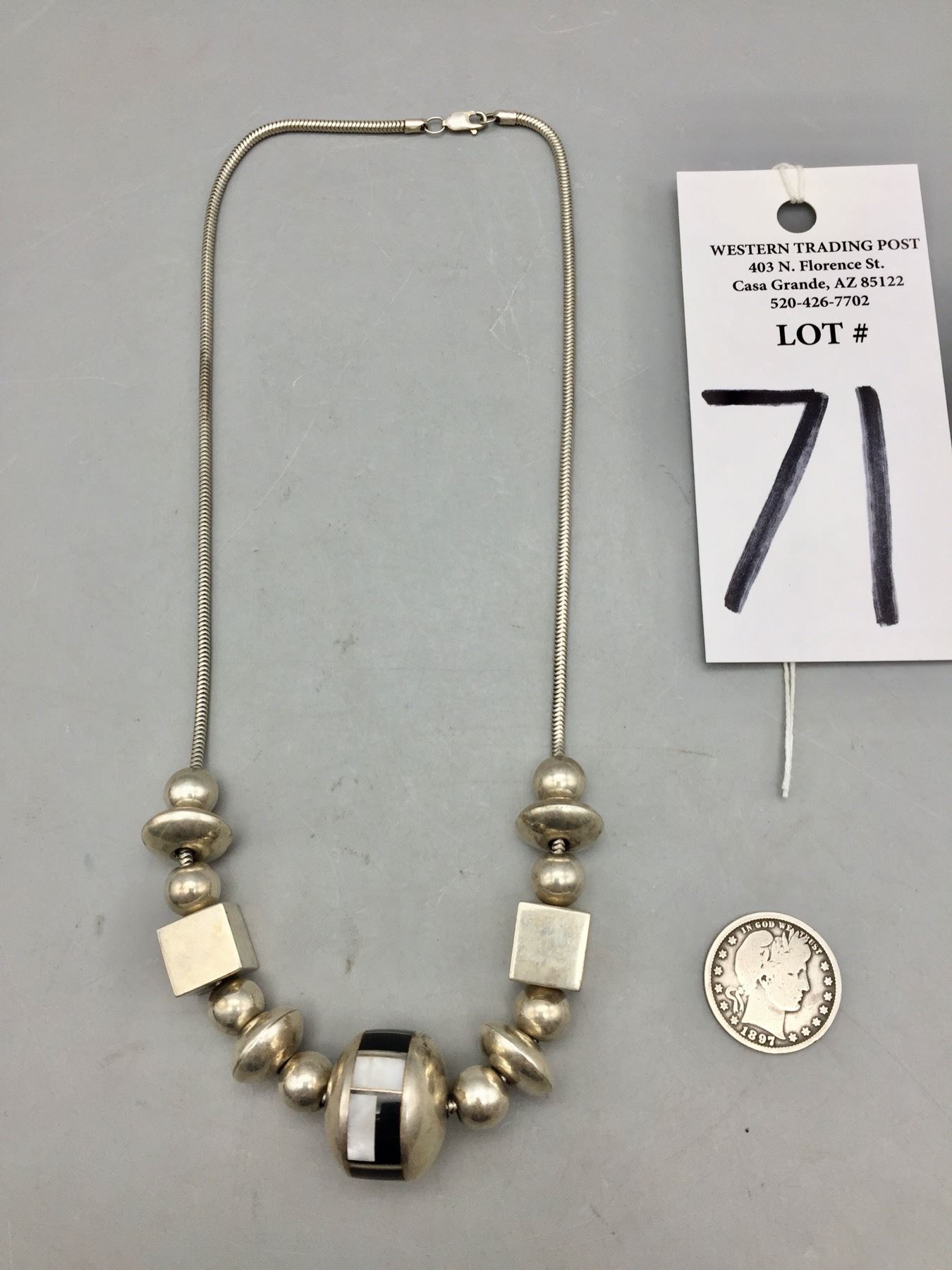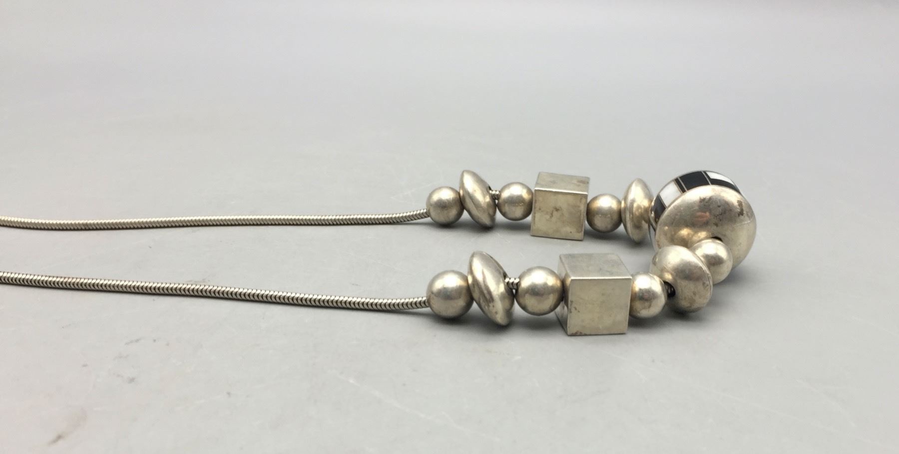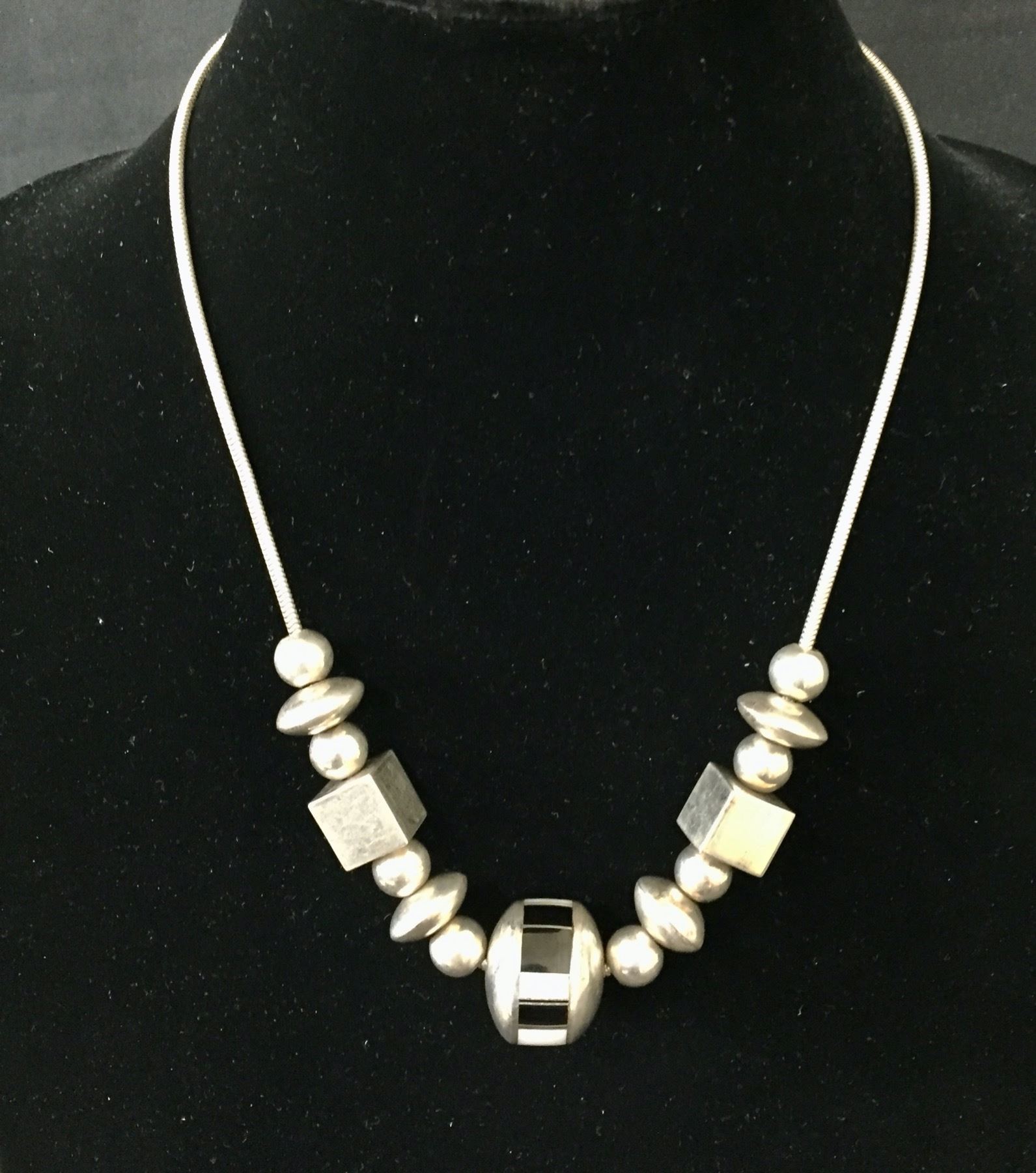 Description: Presented for sale in this lot is a unique sterling silver and inlay necklace with an assortment of different size and shaped beads. It has a large center bead inlaid with onyx and mother of pearl. Maker: Unknown. Approx. Age: Fairly modern. Size: Fits a 18 inch neck. Weighs 56.6 grams. Condition: Good for its age, normal wear expected. Please look closely at the pictures - they are an important part of our description. Shipping: There will be a $5 handling, packaging fee for shipping this lot. The actual cost of postage will be added on top of that.