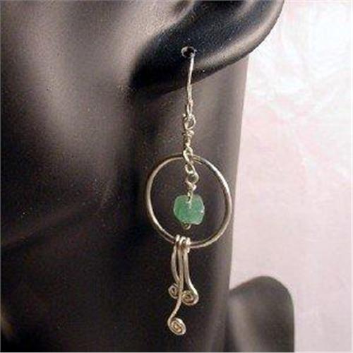 Sterling silver, with a piece of jade suspended within a ring. The three drops suspended from the ring, and the silver wire underneath the jade are in the curled shape of the New Zealand motif of the Koru (tip of the silver fern frond). Drop from the ear measures 6.5cm (2.1/2 inches).