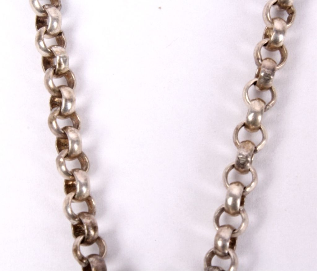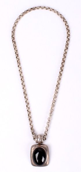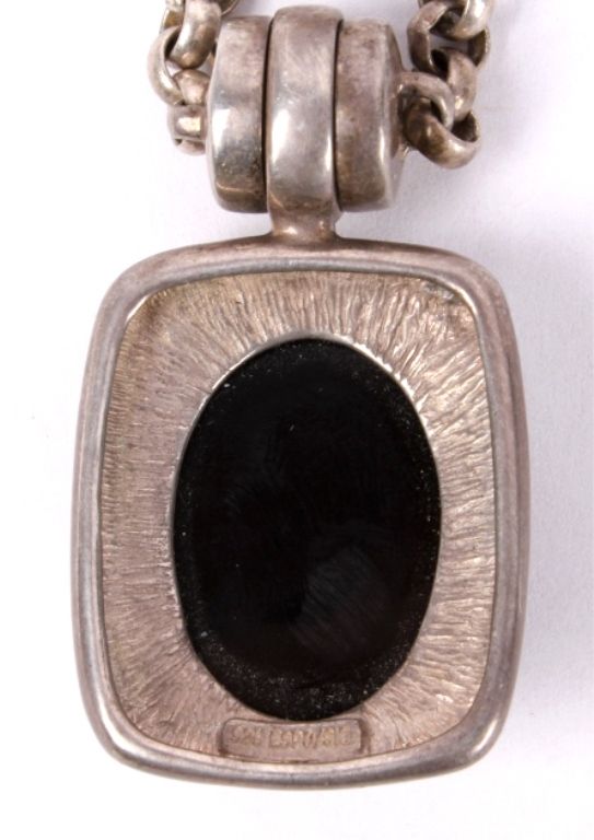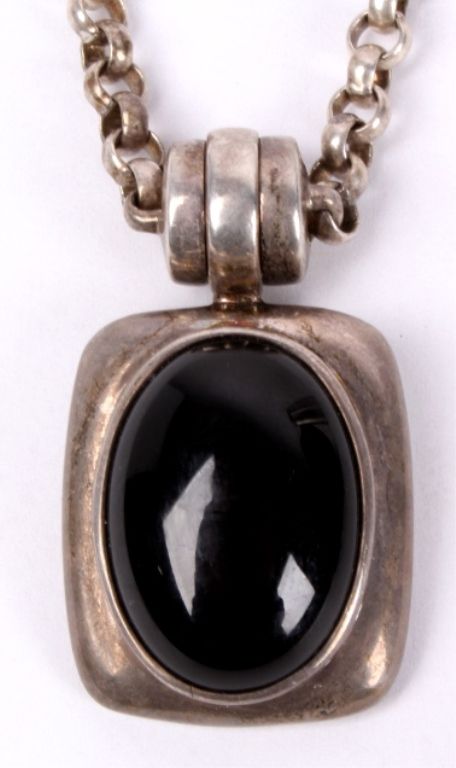 This lot features a sterling silver and jet necklace. The jet stone shows incredible luster and is free of inclusions. The pendant measures .75" x 1" and the chain is 16".