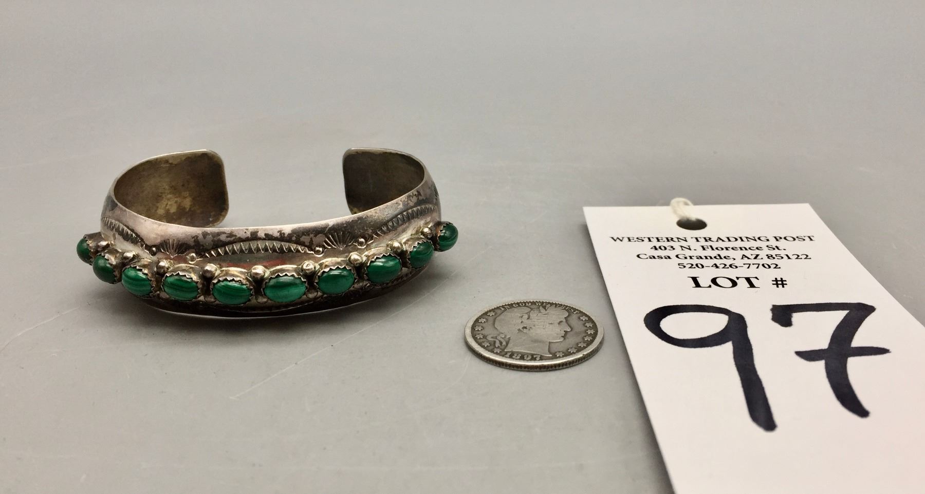Description: Sterling silver bracelet set with 10 malachite cabochons. Tested as sterling silver. Maker: Unknown. Approx. Age: Vintage. Size: Length 6”, Opening 1” (fits a 7” wrist) width 3/4”. Weighs 23.5 grams. Condition: Good for its age, normal wear expected. Please look closely at the pictures - they are an important part of our description. Shipping: There will be a $5 handling / packaging fee for shipping this lot. The actual cost of postage will be added on top of that.