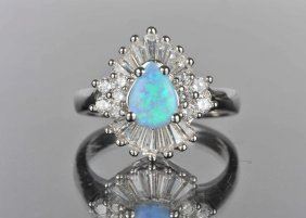 A sterling silver ring with pear cut opal stone in the center and cubic zirconia accents in a starburst pattern. Size 8, marked 925.  Size 6-8.  This item is accompanied with a certificate of authenticity.