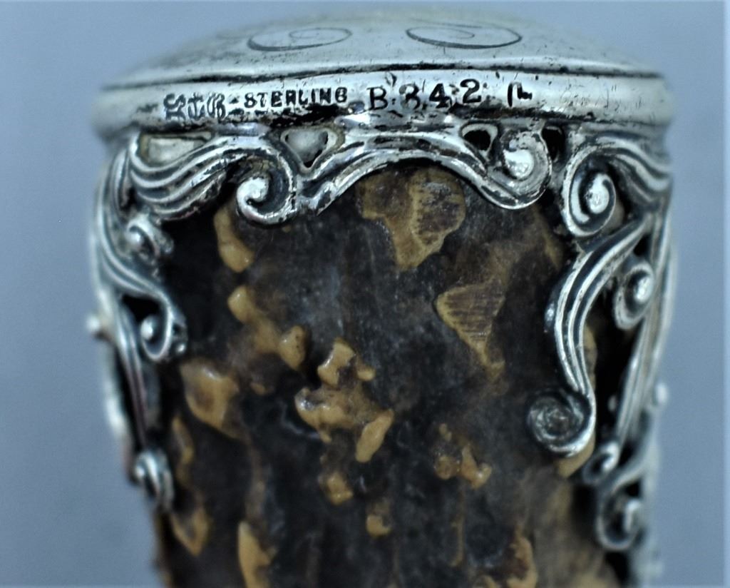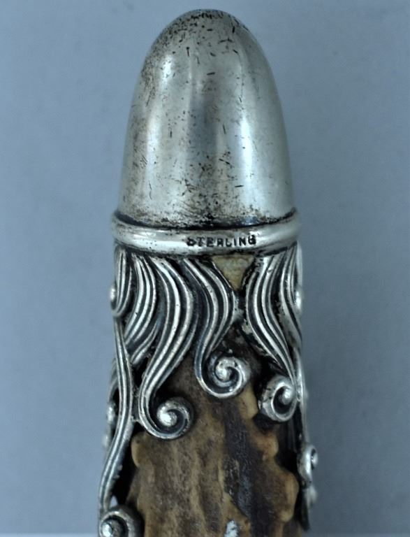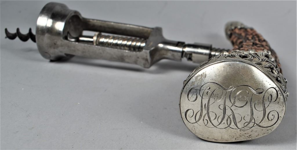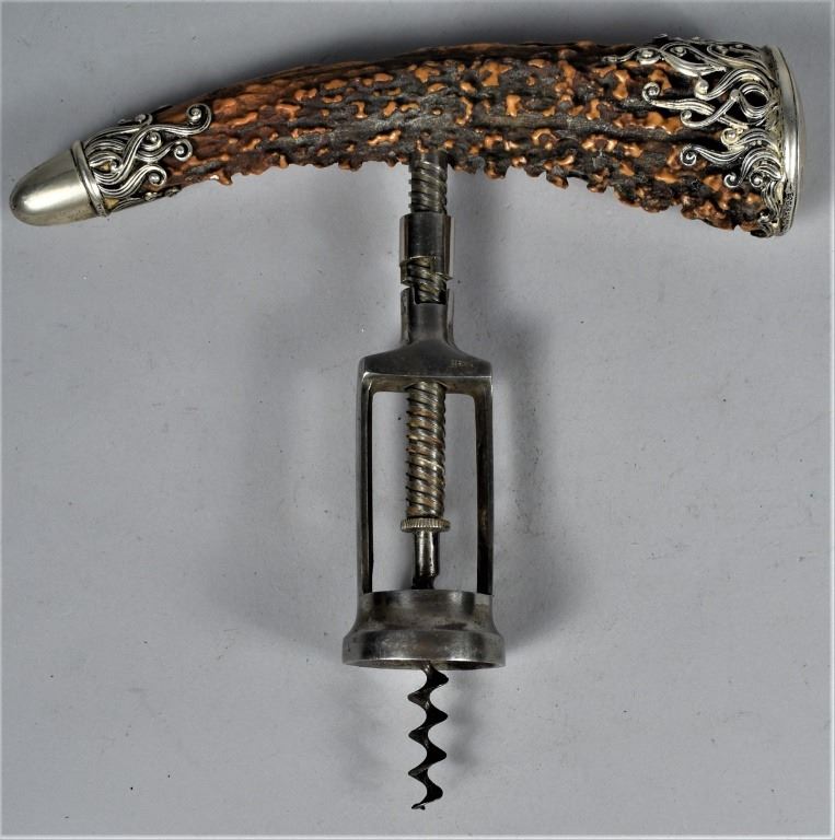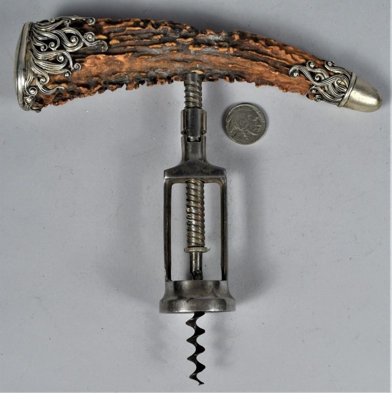 Sterling Silver and Stag Handle Cork Screw. High relief tendril decor caps, monogram HKL with hallmark(lion/anchor/G), sterling B 1738. 4 1/2 inches across. Sterling B 842. 7 inches across.