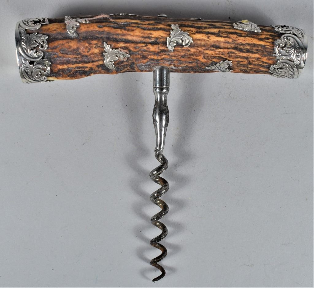 Sterling Silver and Stag Handle Cork Screw. Leaf decor on caps and applied around handle. Hallmark, lion/anchor/G) 7566 with crescent. 5 1/4 inches across.