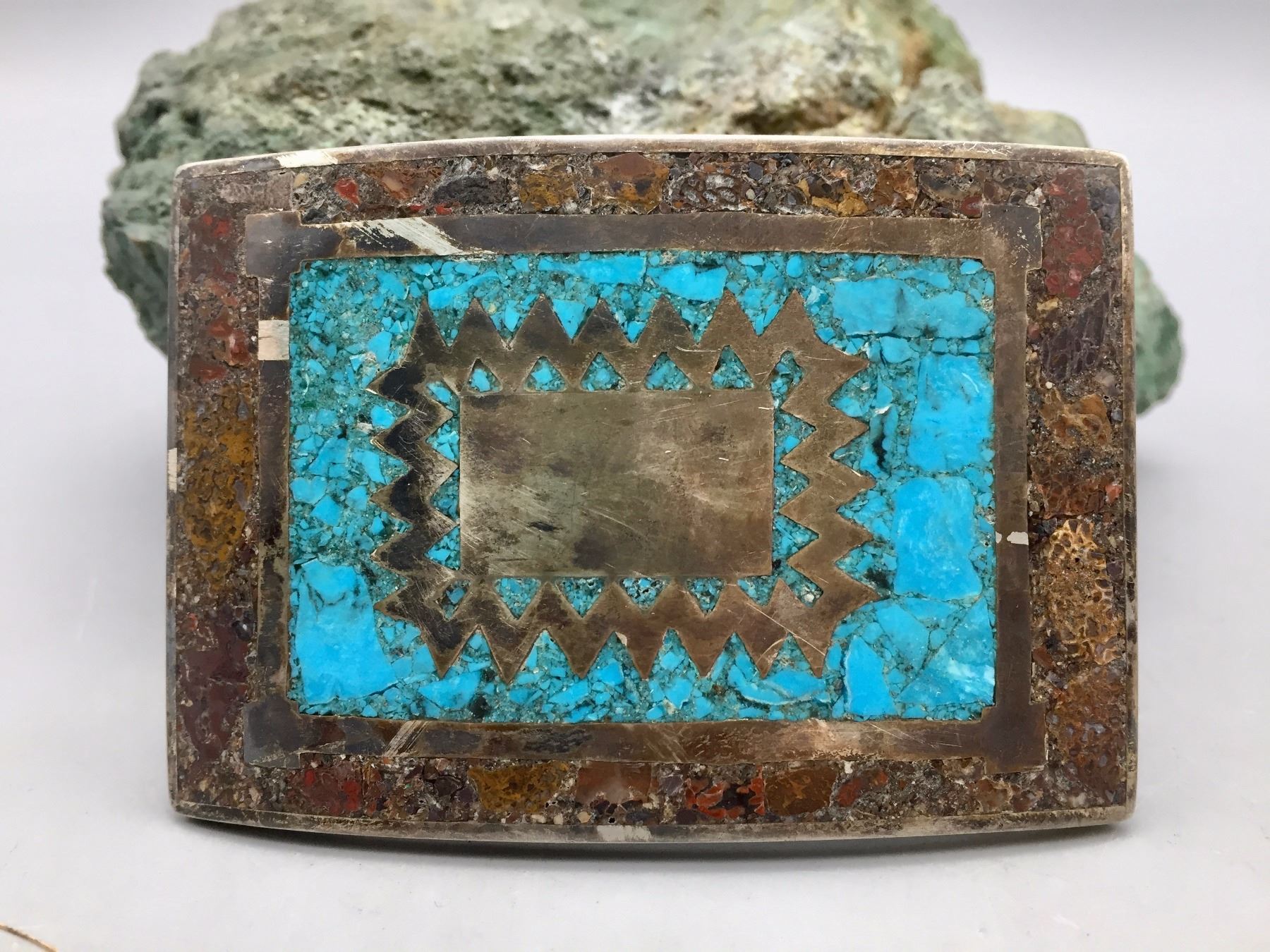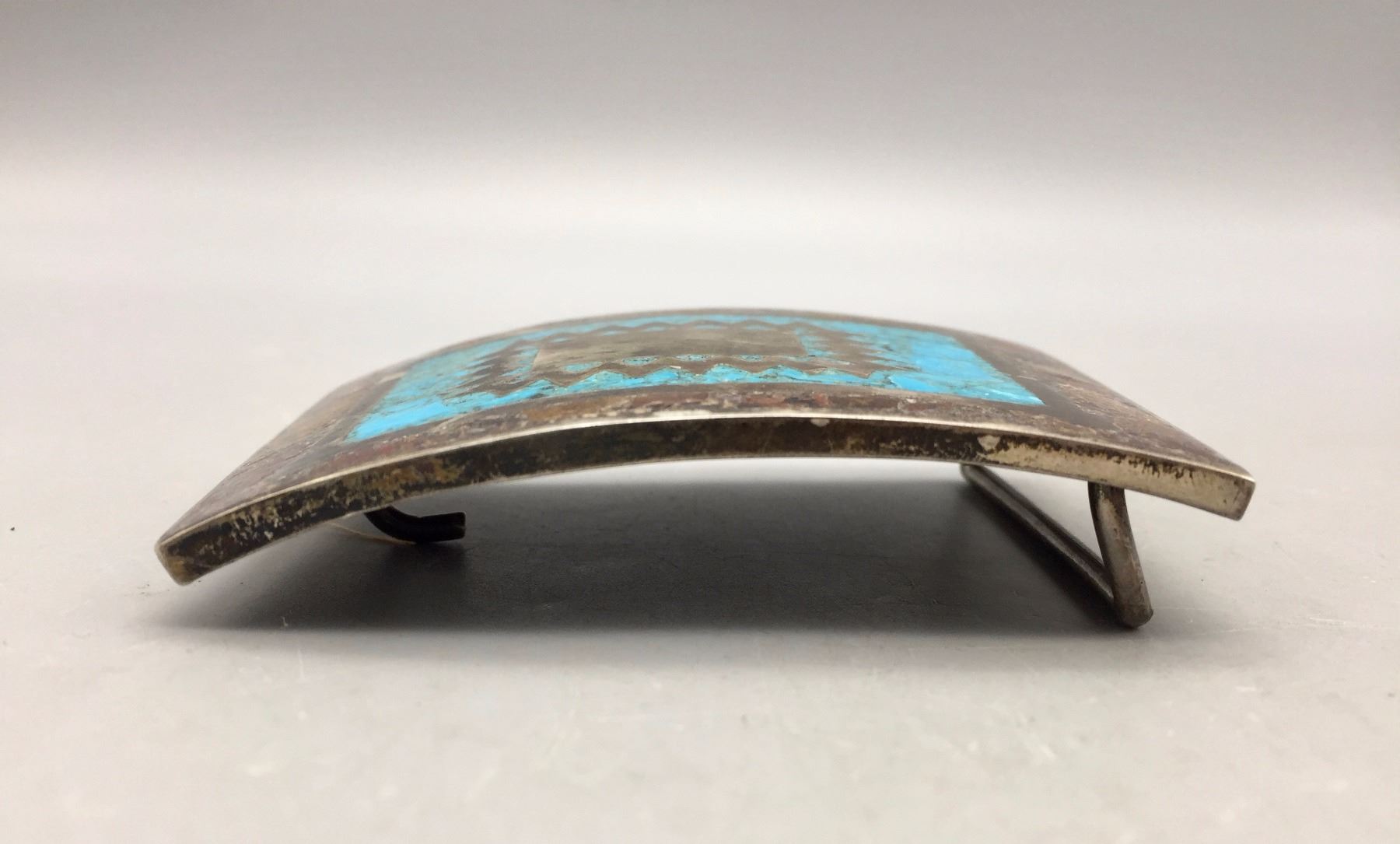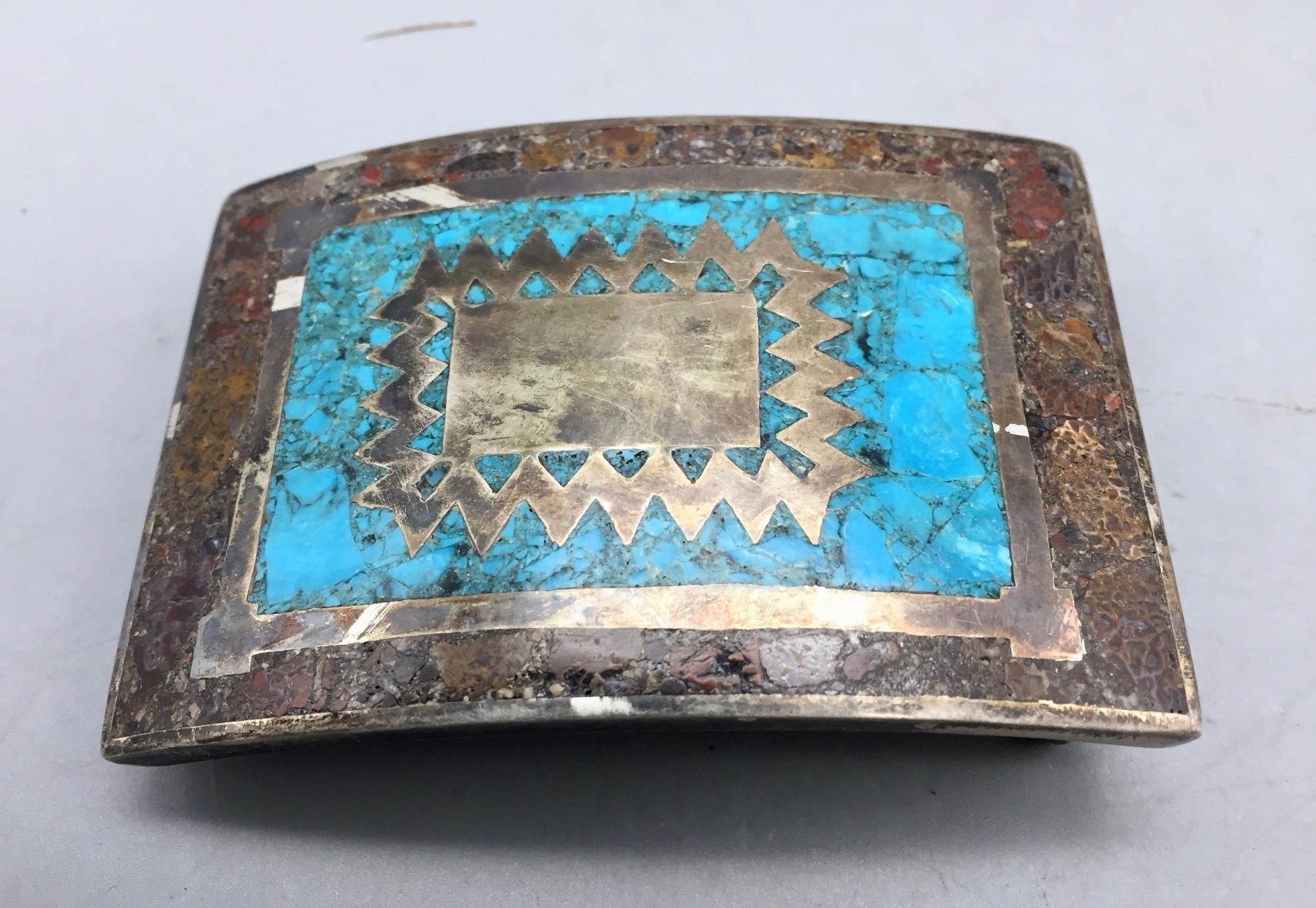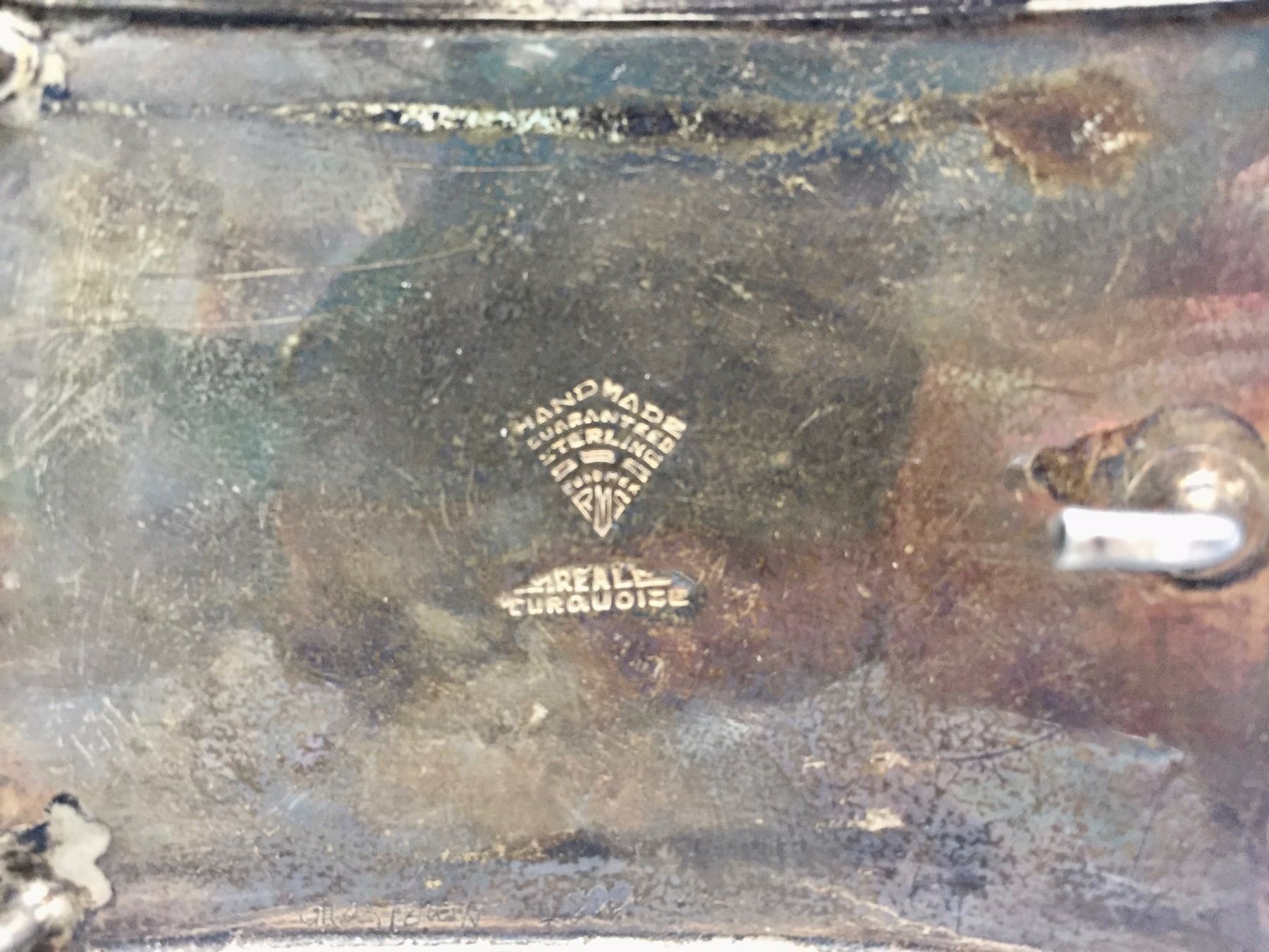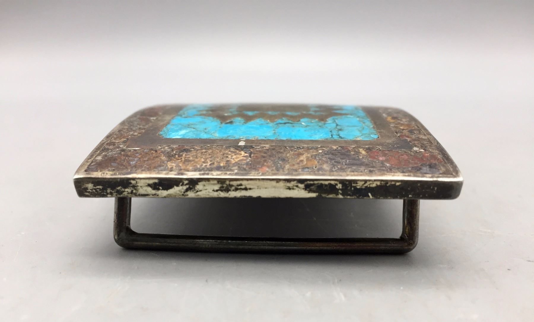 Description: A vintage sterling silver belt buckle featuring inlay turquoise. Maker: Signed RMS (Mexican Artist). Approx. Age: Circa 1960s. Size: 3”w x 2-1/8”h. Fits an approx. 1-5/8” belt. Condition: Good for its age, normal wear expected. Please look closely at the pictures - they are an important part of our description. Shipping: There will be a $5 handling / packaging fee for shipping this lot. The actual cost of postage will be added on top of that.