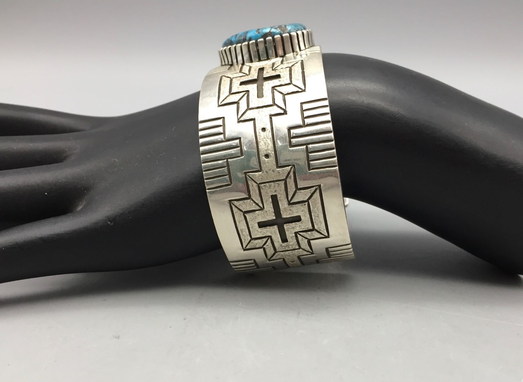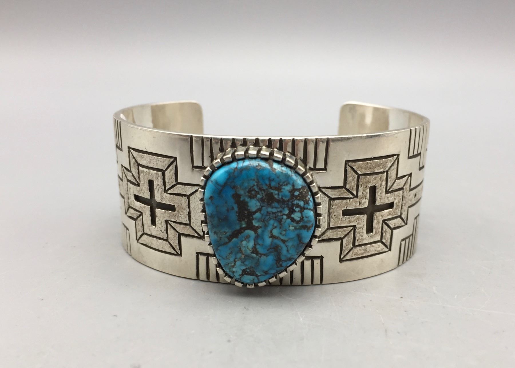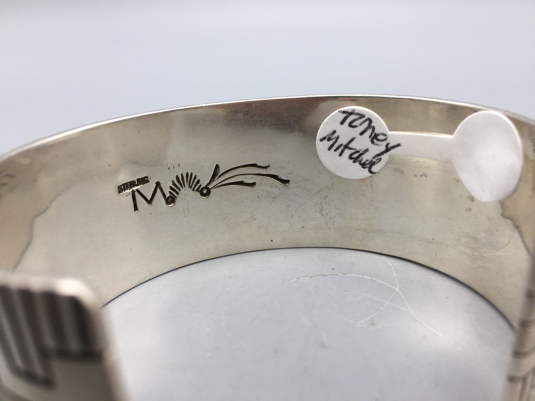 Description: Featured in this lot is a gorgeous sterling silver bracelet featuring a single turquoise cabochon with a beautiful black/brown matrix and handmade bezel surrounded by nice stamp work. Marked as sterling silver. Maker: Toney Mitchell, Navajo. Approx. Age: Contemporary. Size: Measures 5-7/8” with a 1-3/8” opening, (fits a 7-1/4” wrist). Weighs 77.1 grams. Condition: Good for its age, normal wear expected. Please look closely at the pictures - they are an important part of our description. Shipping: There will be a $5 handling / packaging fee for shipping this lot. The actual cost of postage will be added on top of that.