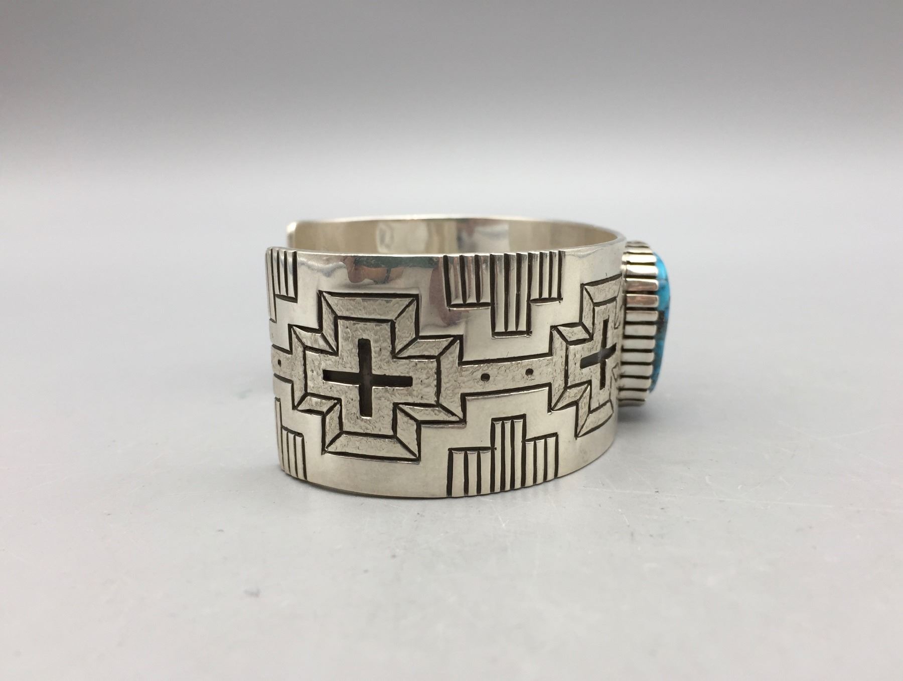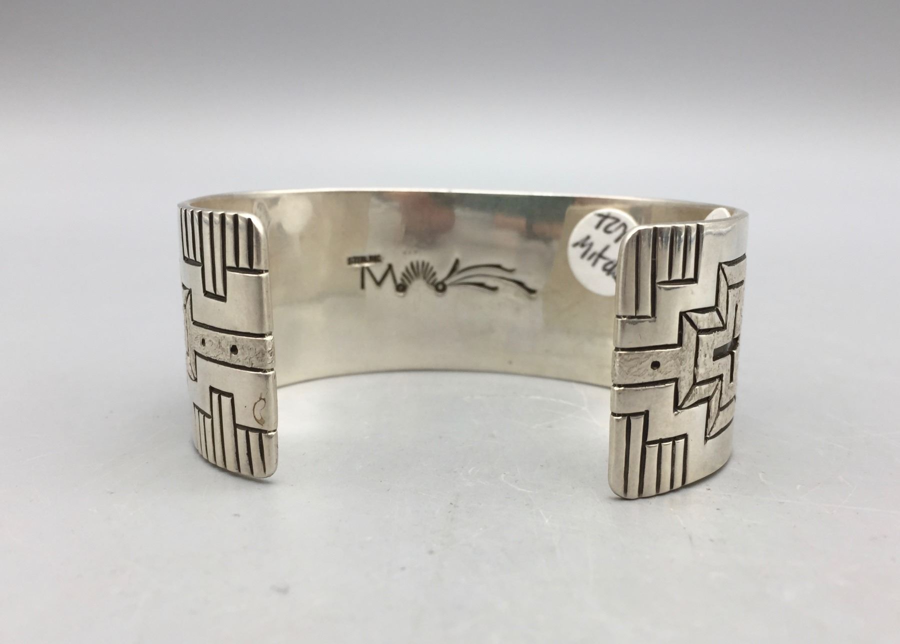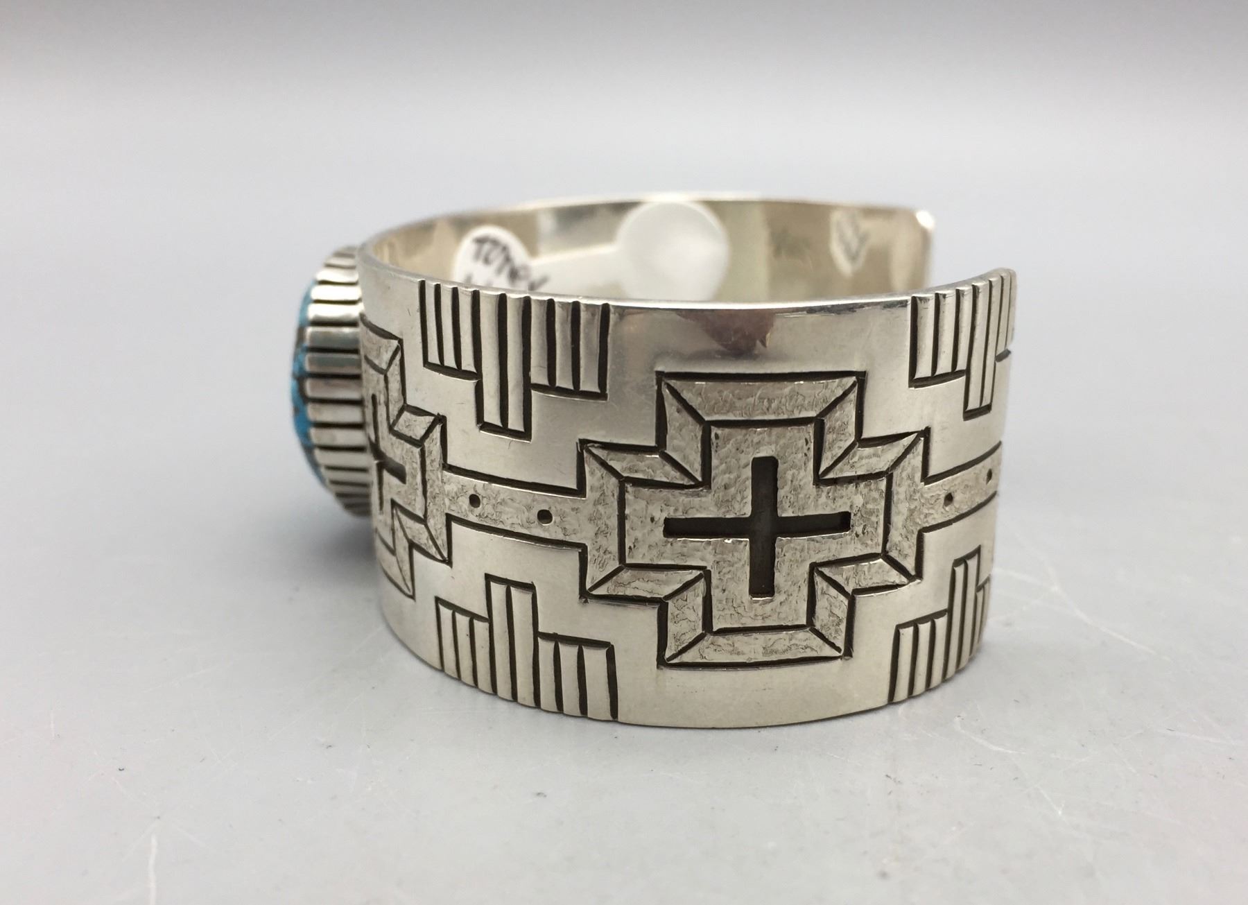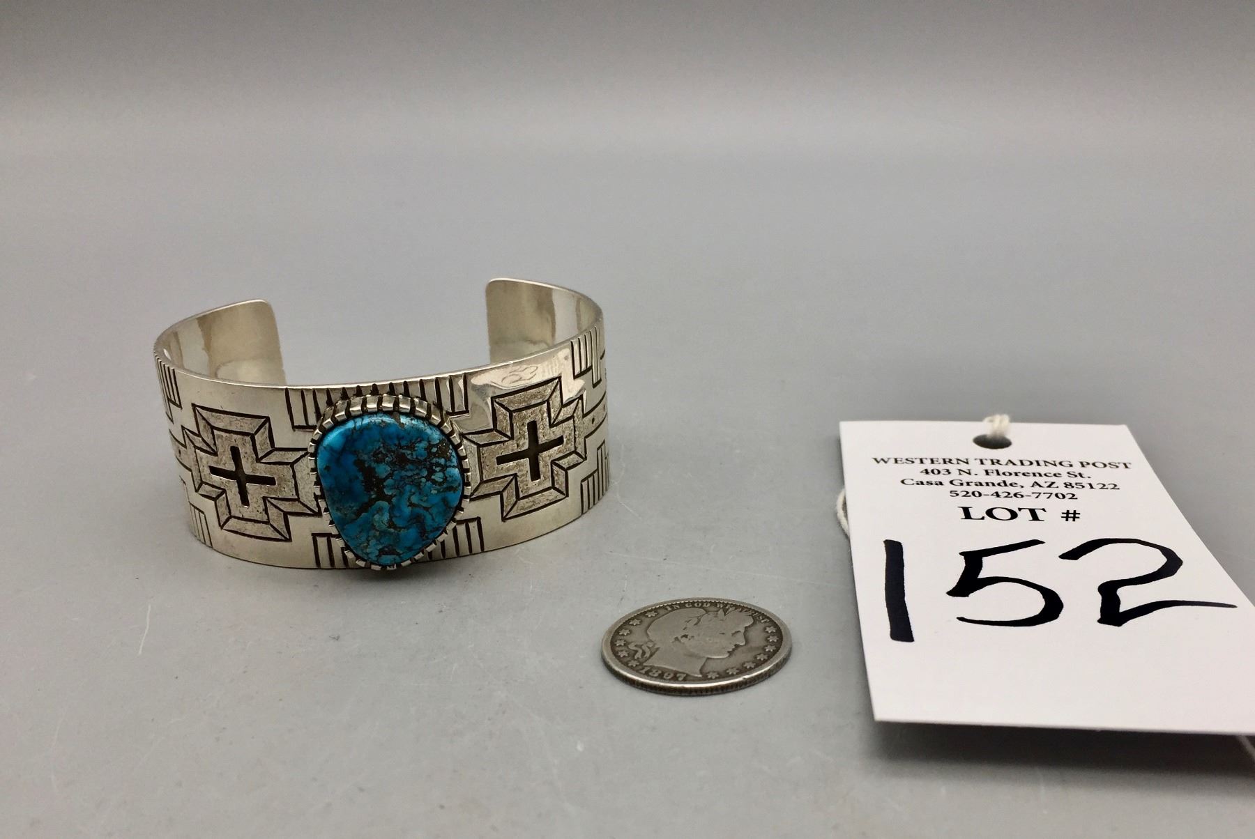 Description: Featured in this lot is a gorgeous sterling silver bracelet featuring a single turquoise cabochon with a beautiful black/brown matrix and handmade bezel surrounded by nice stamp work. Marked as sterling silver. Maker: Toney Mitchell, Navajo. Approx. Age: Contemporary. Size: Measures 5-7/8” with a 1-3/8” opening, (fits a 7-1/4” wrist). Weighs 77.1 grams. Condition: Good for its age, normal wear expected. Please look closely at the pictures - they are an important part of our description. Shipping: There will be a $5 handling / packaging fee for shipping this lot. The actual cost of postage will be added on top of that.