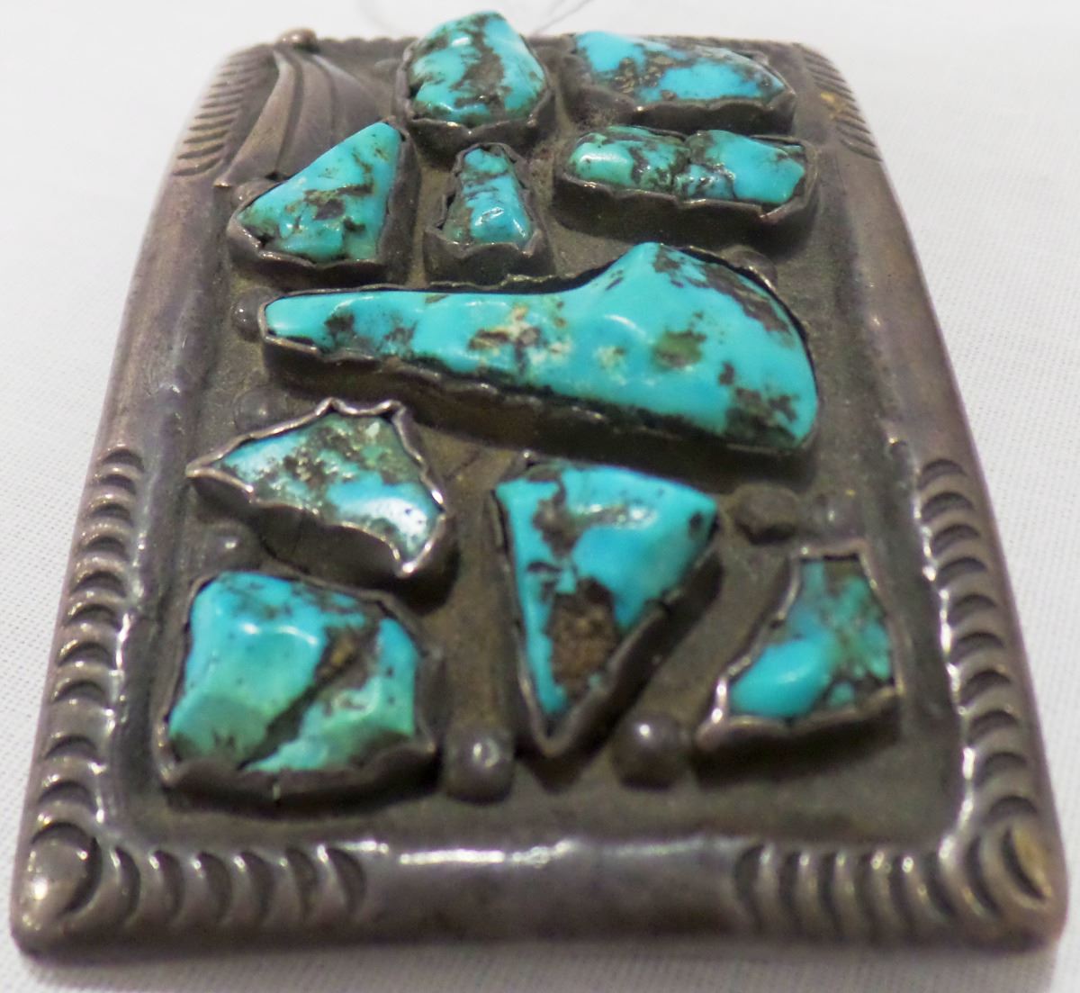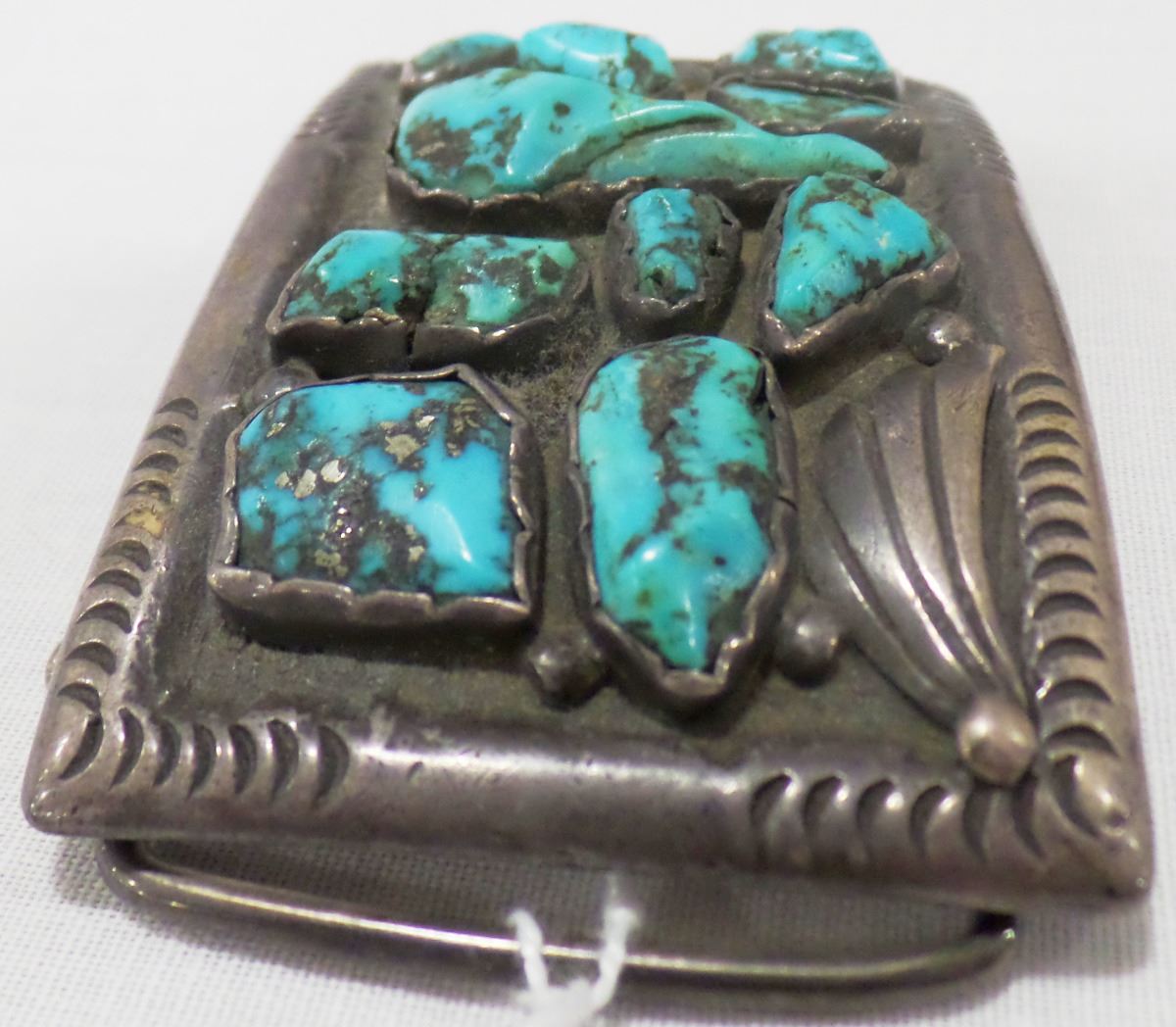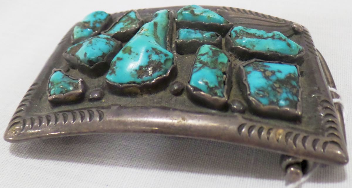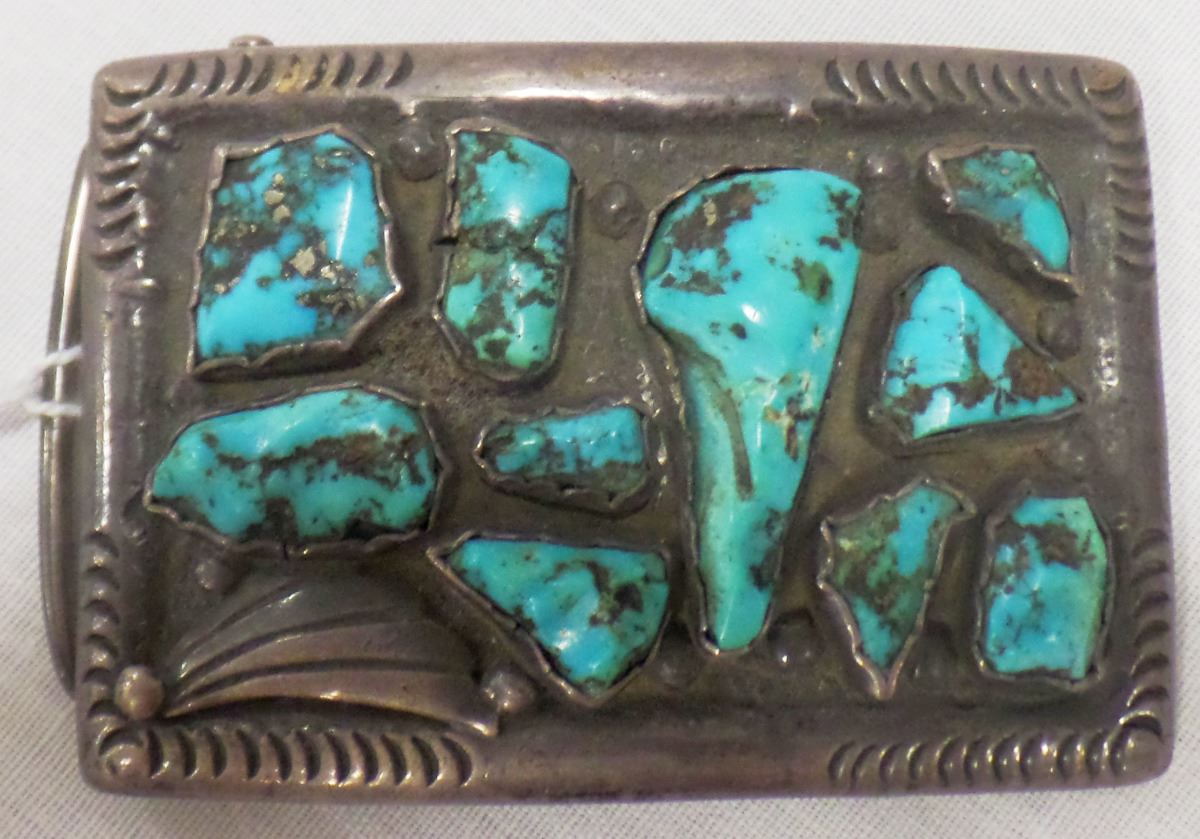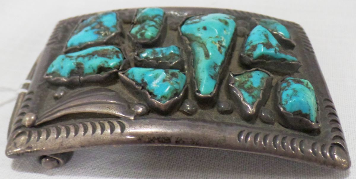 1920's Navajo Sterling Silver and turquoise Belt Buckle from the 1920's. This item measures 3 x 2 x 2 inches and is signed J.S. and marked by previous owner with personal identification. The Belt Buckle has nice hand engraving on edges and different shaped stones. See images. Item is 3 1/4 x 2 inches. Item weighs about 88 1/2 grams. Shipping: $15.50