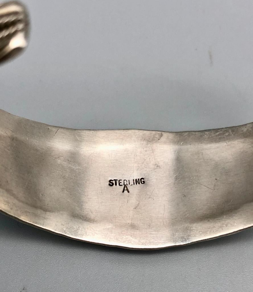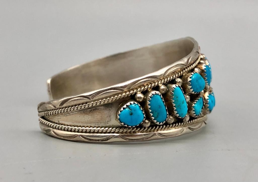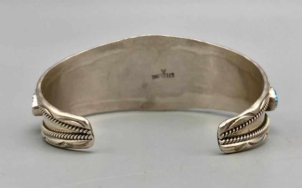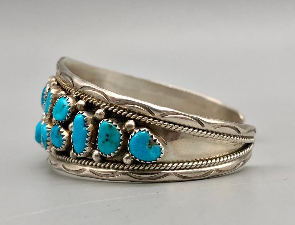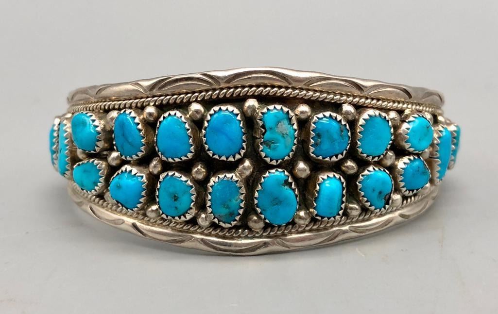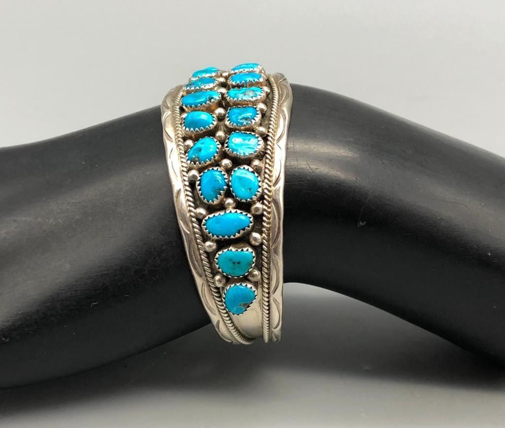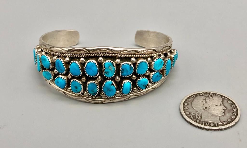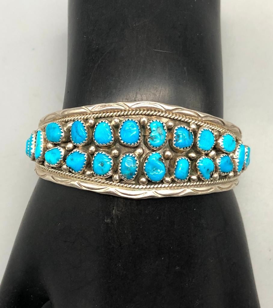 Offered for sale in this lot is a sterling silver and turquoise cluster bracelet. This is a gorgeous bracelet set with 22 turquoise cabochons with silver dot accents. It is on a wider cuff that has fine silver wire and stamped designs on the edge. It is stamped as sterling silver. MAKER: Hallmarked A. APPROX AGE: Circa 1980s-1990s. SIZE: Inside circumference measures 5-3/8 inches long. Opening is an additional 1-1/8 inch, fitting a 6-1/2 wrist. Width is 1 inch. Weighs 28.7 grams. CONDITION: Good for its age, normal wear expected. Please look closely at the pictures as they are an important part of our description and are hereby incorporated into the description, specifically with regards to condition. SHIPPING: There will be a $5 handling / packaging fee for shipping this lot. The actual cost of postage will be added on top of that. BUY IT NOW: If you would like to buy this item now, without waiting for the auction day to bid on it, we do offer this option (which is available up to 48 hours before the actual auction starts). The “Buy it Now†price is the high estimate of this lot (plus applicable fees and the Buyer's premium is discounted to 10% when using the Buy it Now option). If you would like to exercise this option, you must contact us by email (or phone as long as you talk to someone live). Reference this lot number and your intention to "Buy it Now."