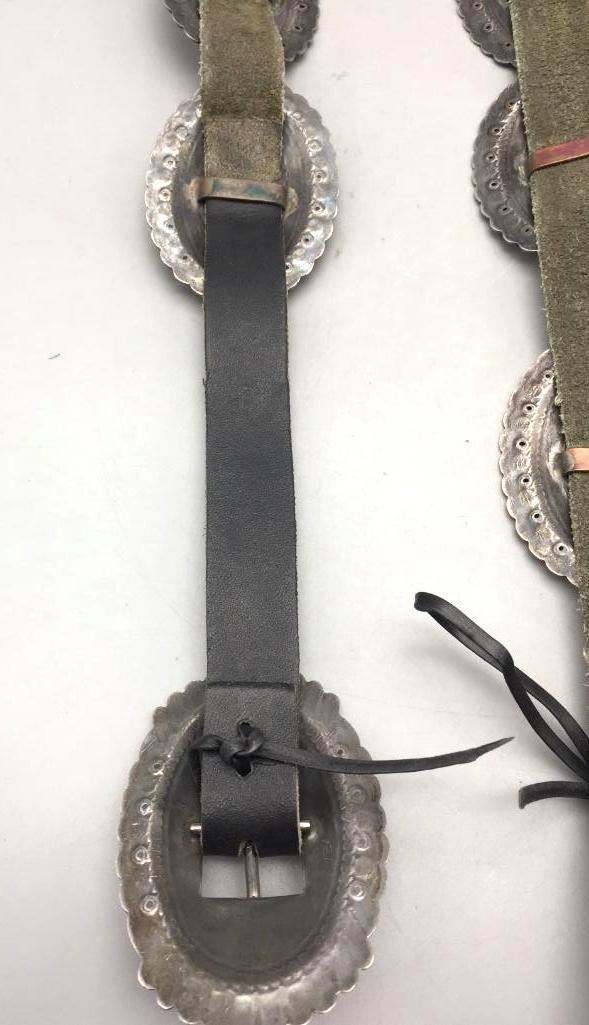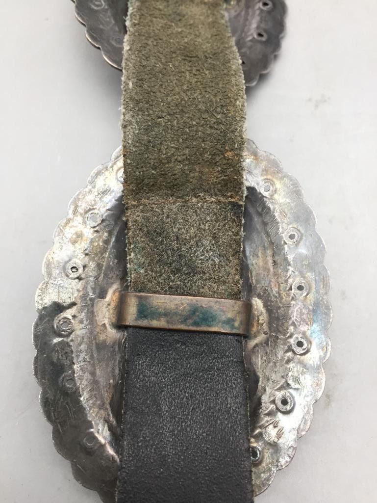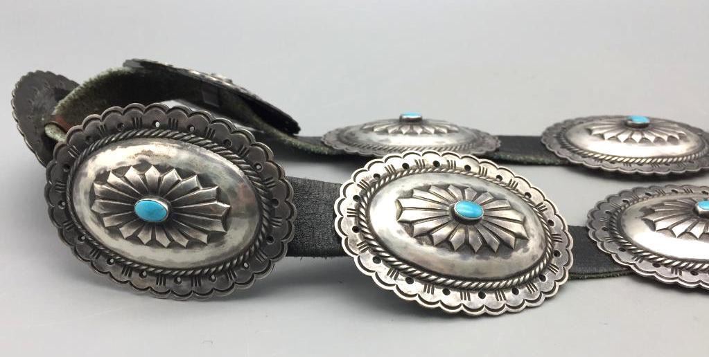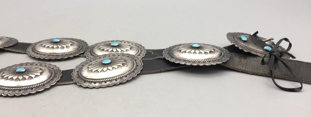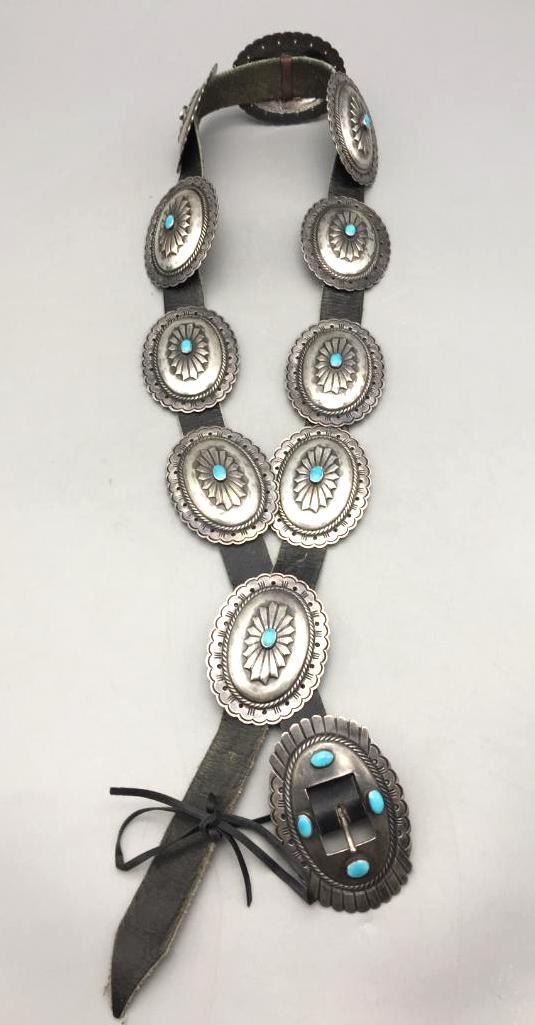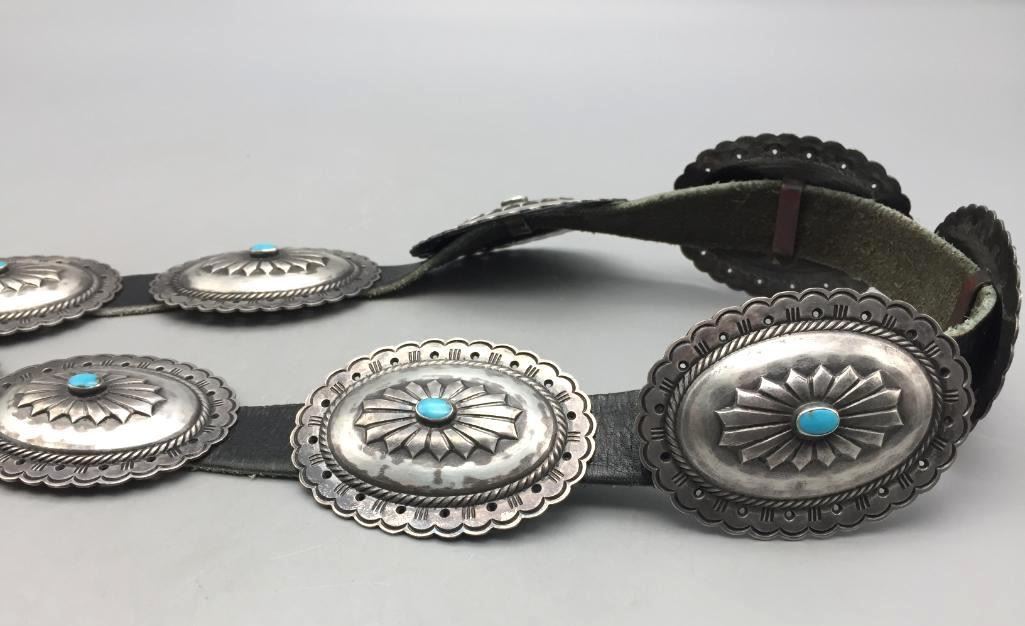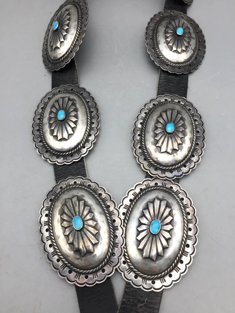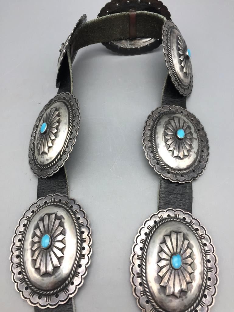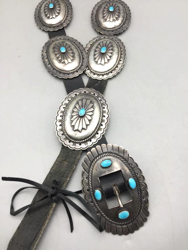 For your consideration we offer this nice, older, sterling silver concho belt. Each concho features a single turquoise stone and four stones on the buckle. Maker: Unmarked. Approx. Age: Vintage. Size: Belt measures 40" long. Buckles measures 3" x 2". Conchos measure 2-3/4" x 2". Weighs 294.3 grams. Condition: Good for its age, normal wear expected. Please look closely at the pictures - they are an important part of our description. Shipping: There will be a $5 handling, packaging fee for shipping this lot. The actual cost of postage will be added on top of that.