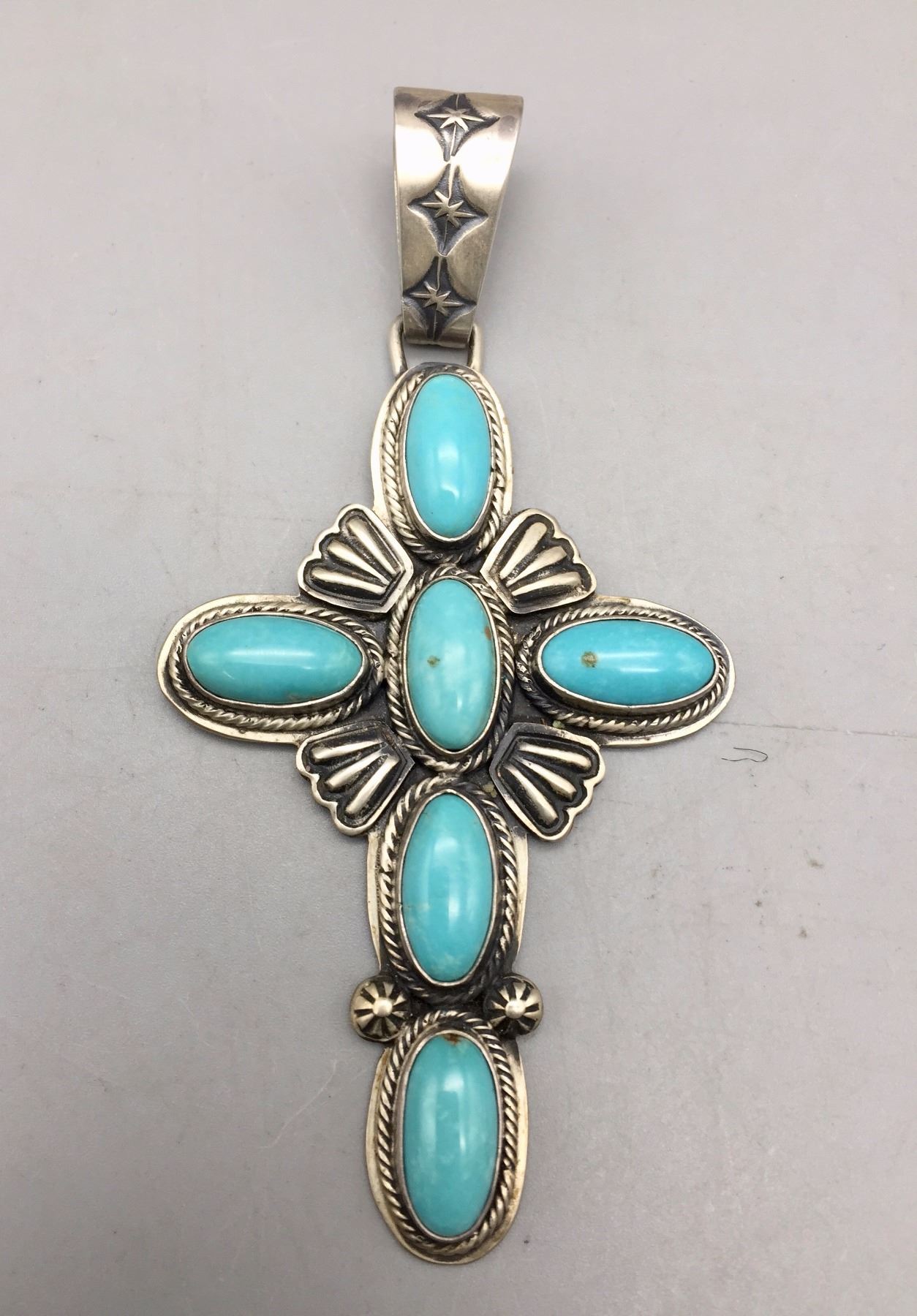 Description: Sterling silver and turquoise stone cross pendant. Maker: Hallmarked, but unable to read clearly. Approx. Age: Fairly modern. Size: 3 1/2” l x 1 3/4” w. Weighs 26.8 g. Condition: Good for its age, normal wear expected. Please look closely at the pictures - they are an important part of our description. Shipping: There will be a $5 handling / packaging fee for shipping this lot. The actual cost of postage will be added on top of that.