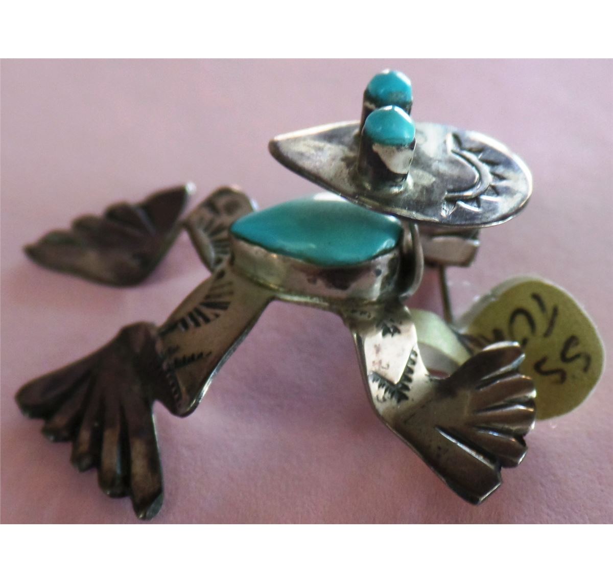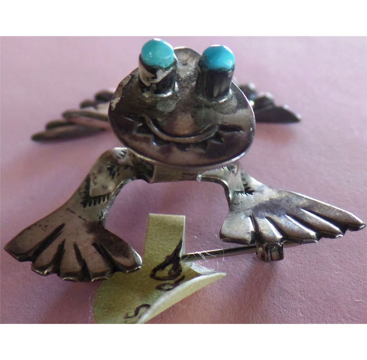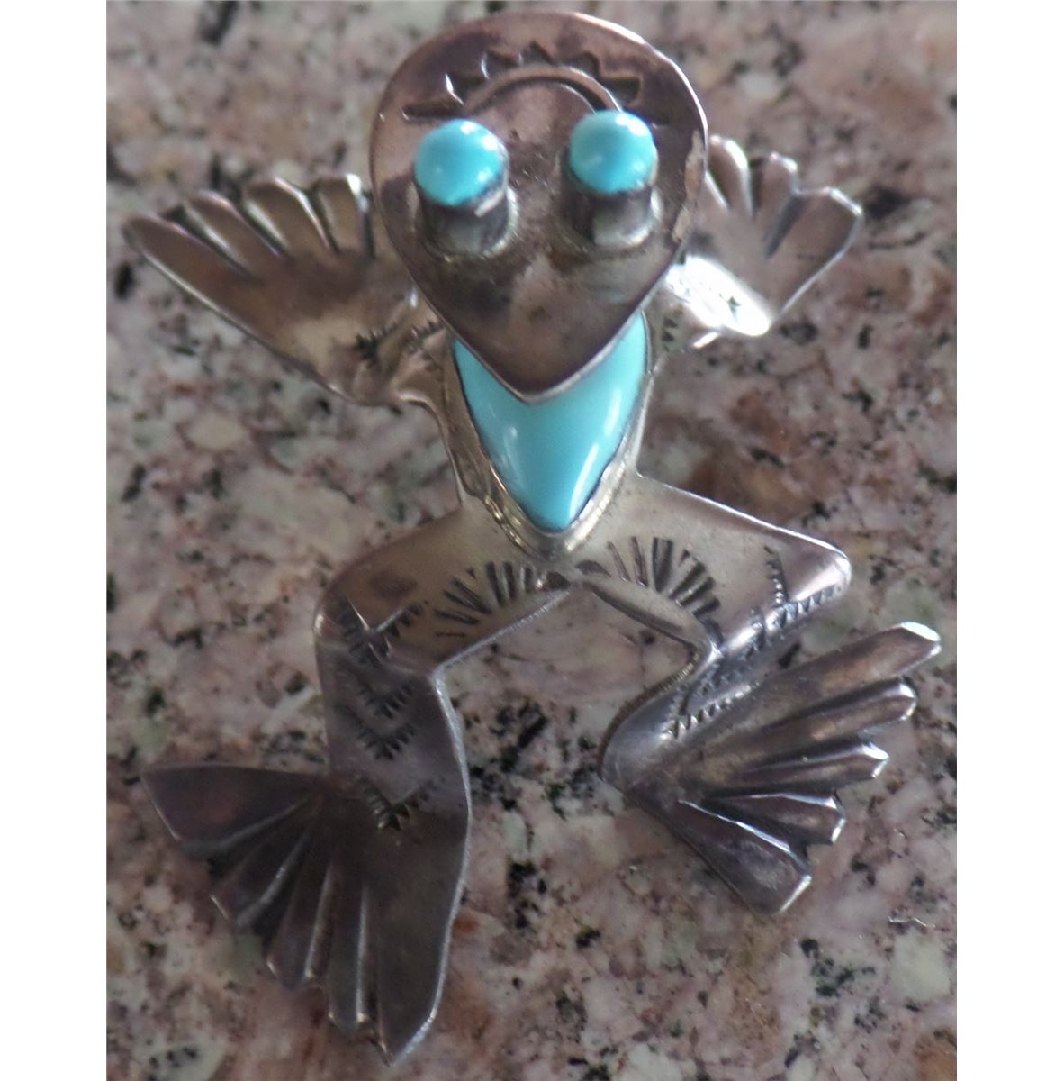 Great old Sterling Silver with turquoise eyes and body frog pin. This pin has a pop up style as it doesn't sit flat on the item. It is signed RT IHMSS. Please see pictures. This item weighs 7.5 grams and measures approximately 1 3/4 x 1 5/8 x3/4 inches. Shipping: $14.00