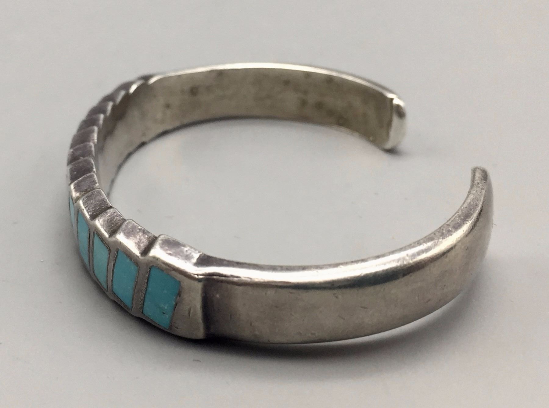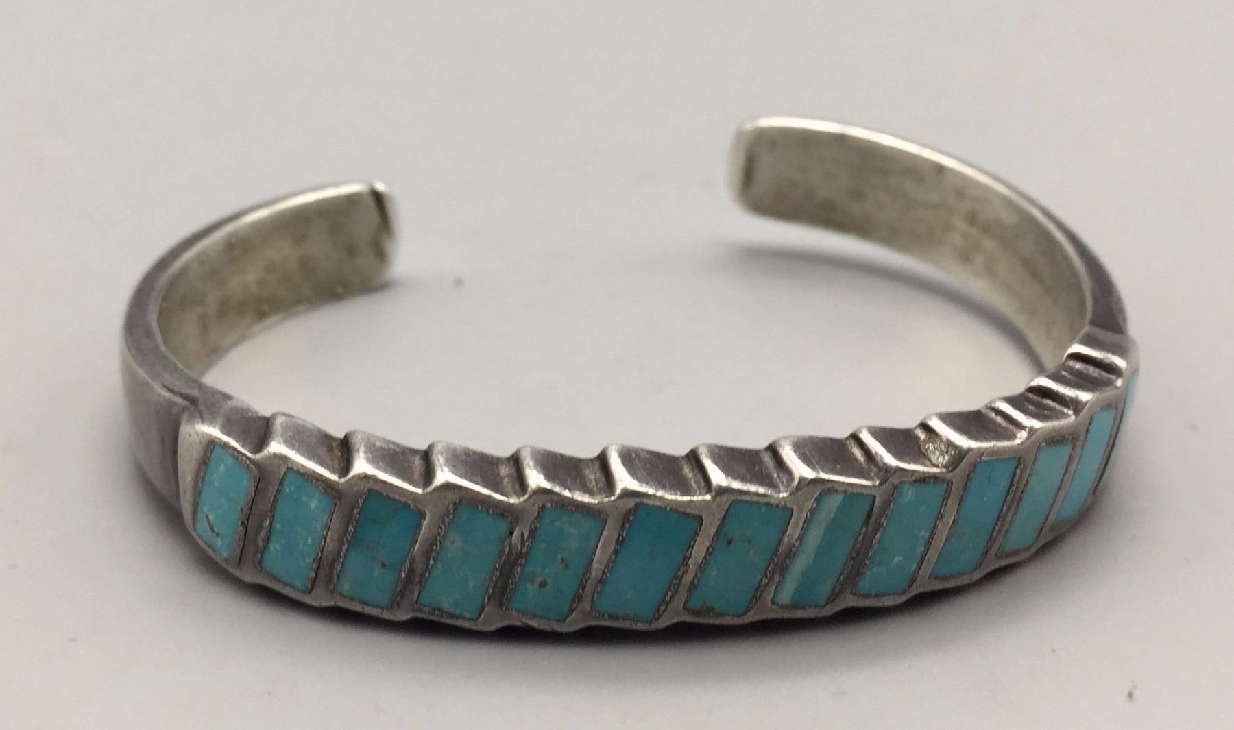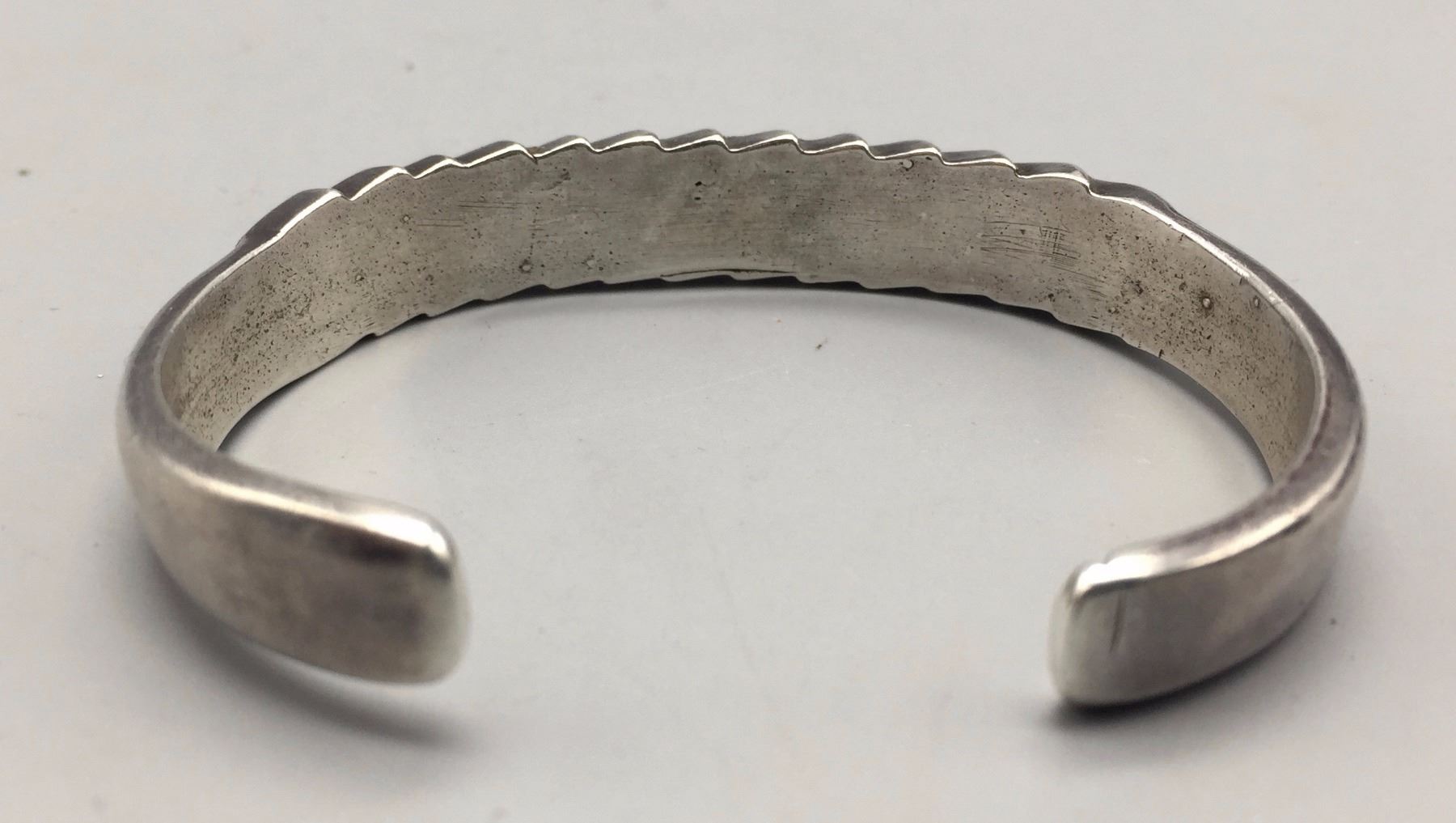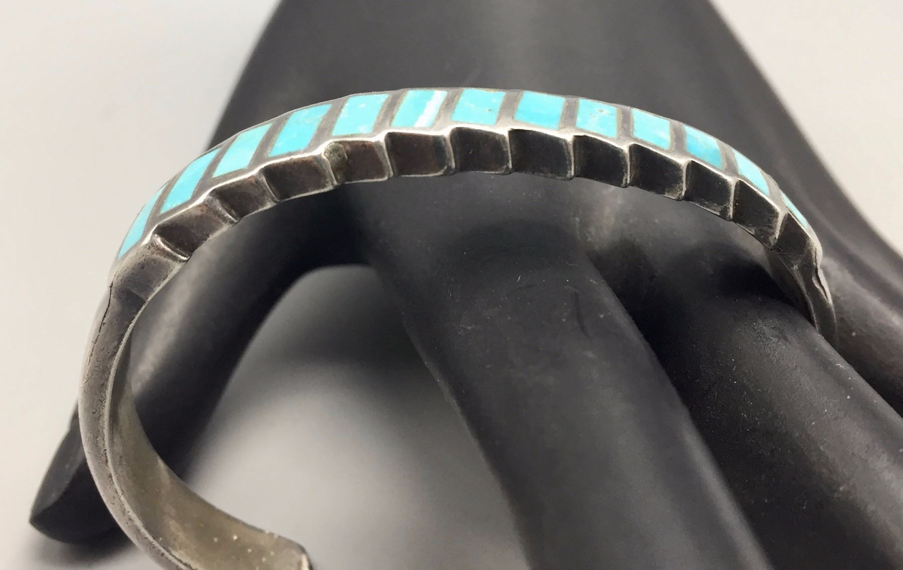 Maker: Unmarked, but Navajo or Zuni in style. Approx. Age: Circa 1970s. Size: Inside circumference of bracelet is 5 1/2” plus it has a 1” opening (making it fit a 6 1/8” wrist). Bracelet is 3/8” at it’s widest point and weighs 26.0 g. Additional Info: Cuff bracelet features nice turquoise inlay. Tested as sterling silver. Condition: Good. Normal wear expected. Please look closely at the pictures - they are an important part of our description. Shipping: There will be a $5 handling / packaging fee for shipping this lot. The actual cost of postage will be added on top of that.