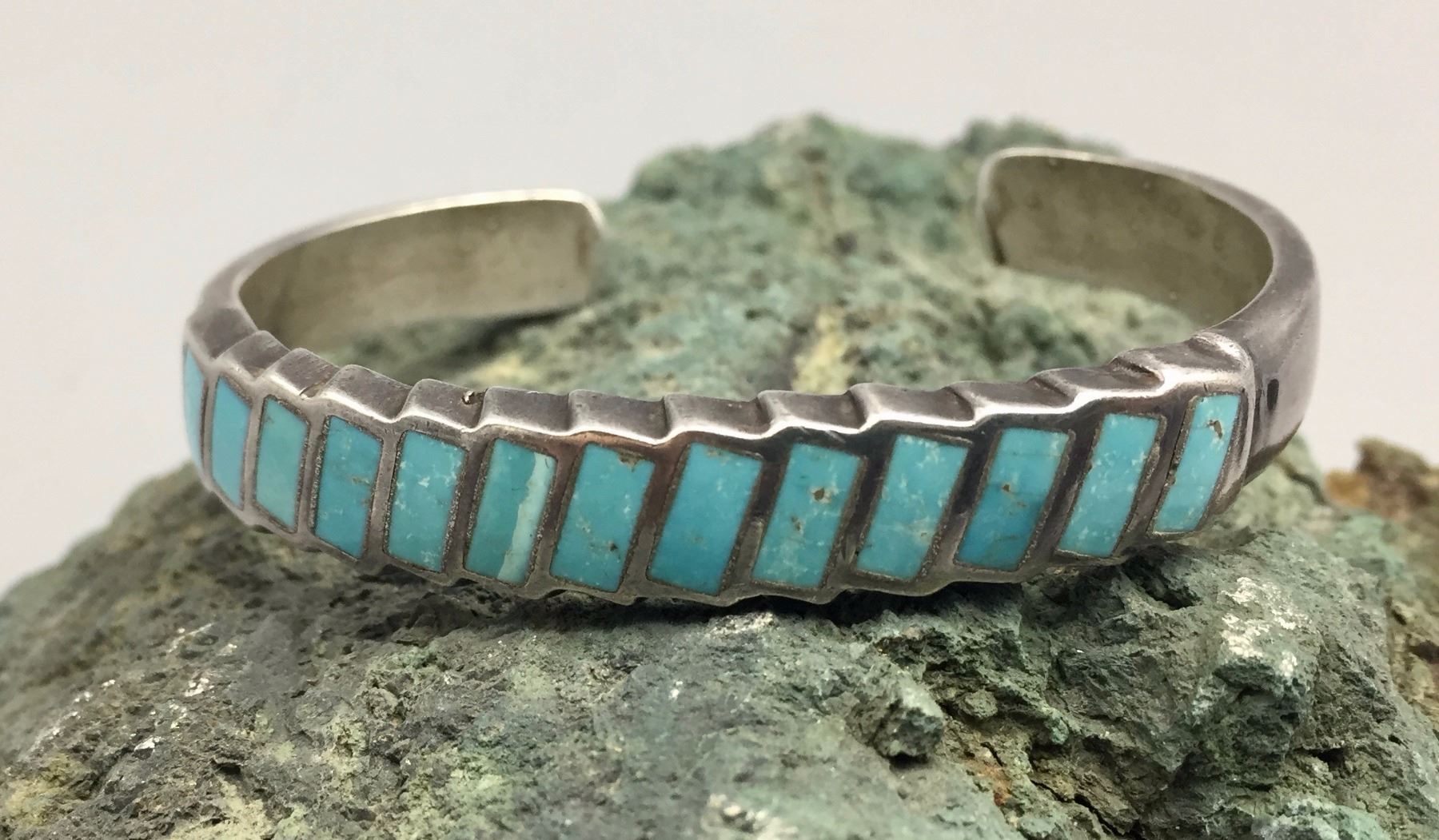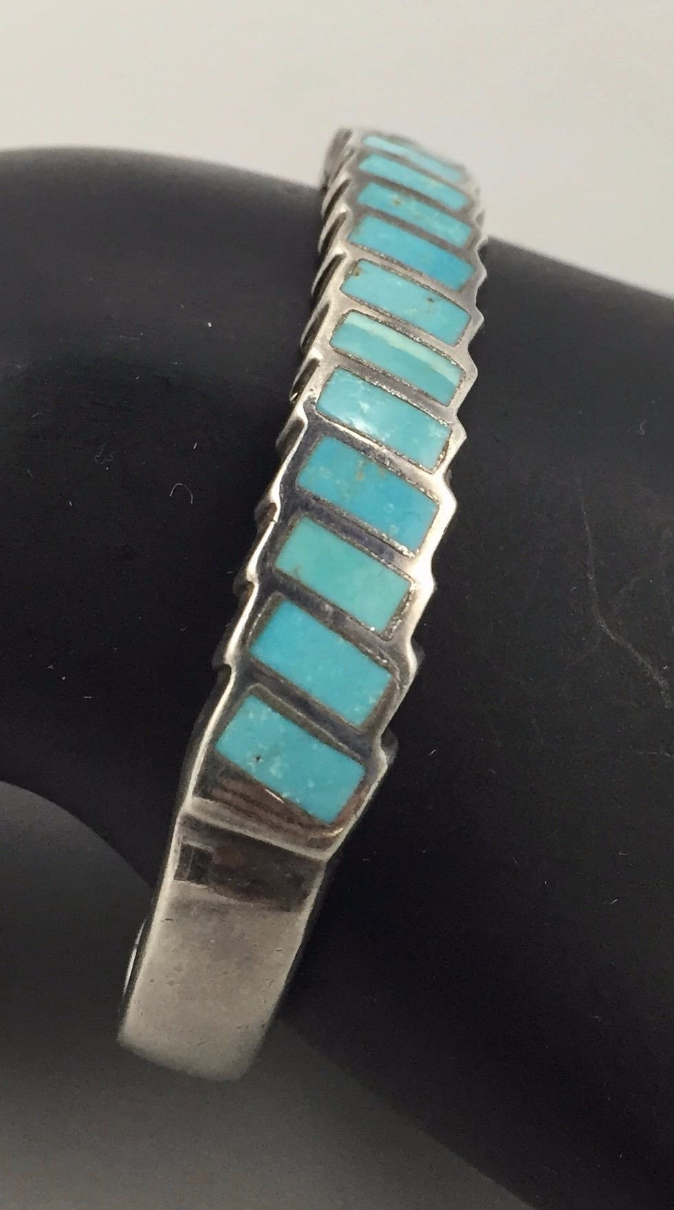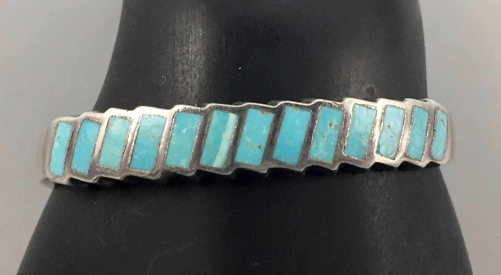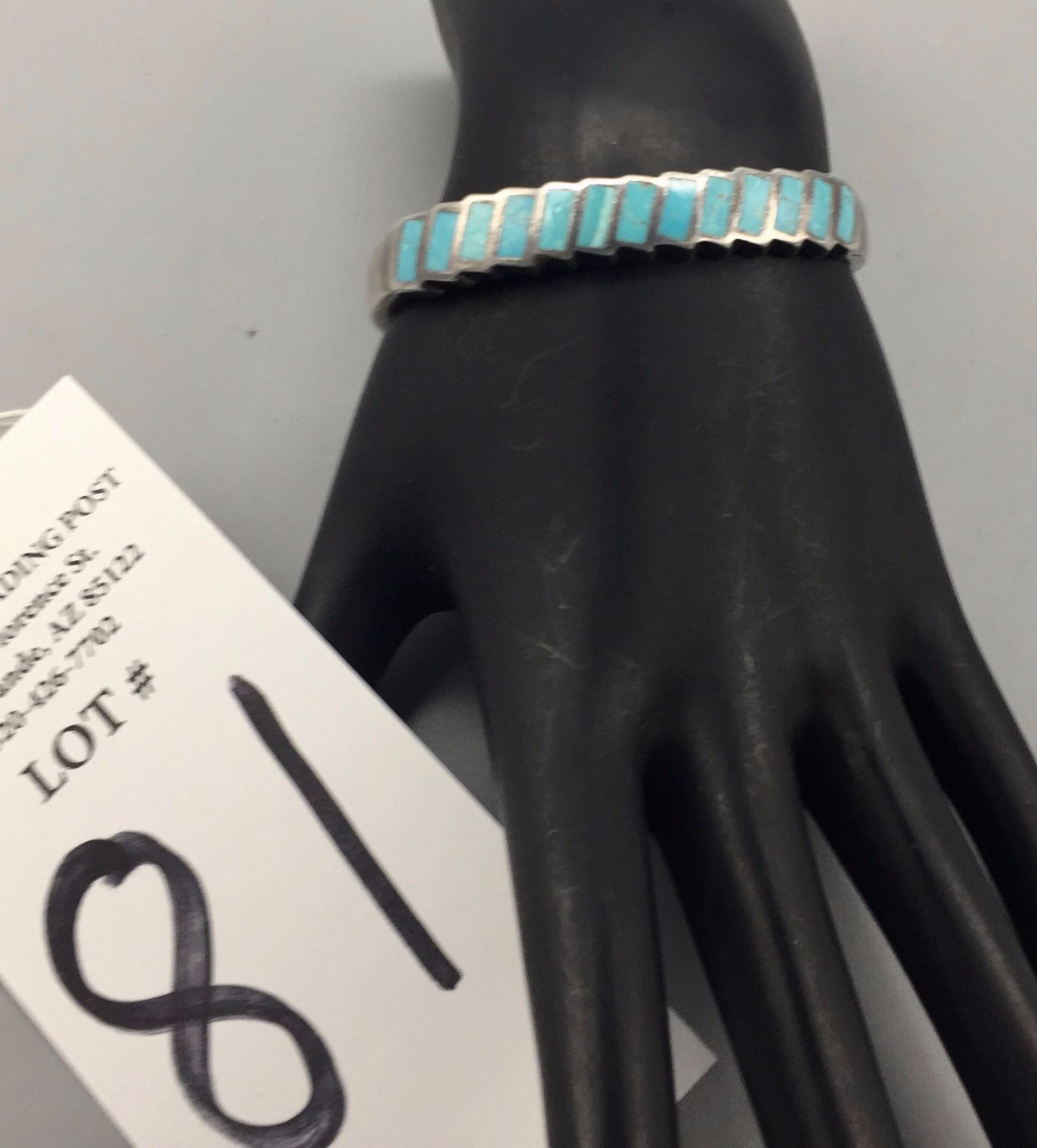 Maker: Unmarked, but Navajo or Zuni in style. Approx. Age: Circa 1970s. Size: Inside circumference of bracelet is 5 1/2” plus it has a 1” opening (making it fit a 6 1/8” wrist). Bracelet is 3/8” at it’s widest point and weighs 26.0 g. Additional Info: Cuff bracelet features nice turquoise inlay. Tested as sterling silver. Condition: Good. Normal wear expected. Please look closely at the pictures - they are an important part of our description. Shipping: There will be a $5 handling / packaging fee for shipping this lot. The actual cost of postage will be added on top of that.