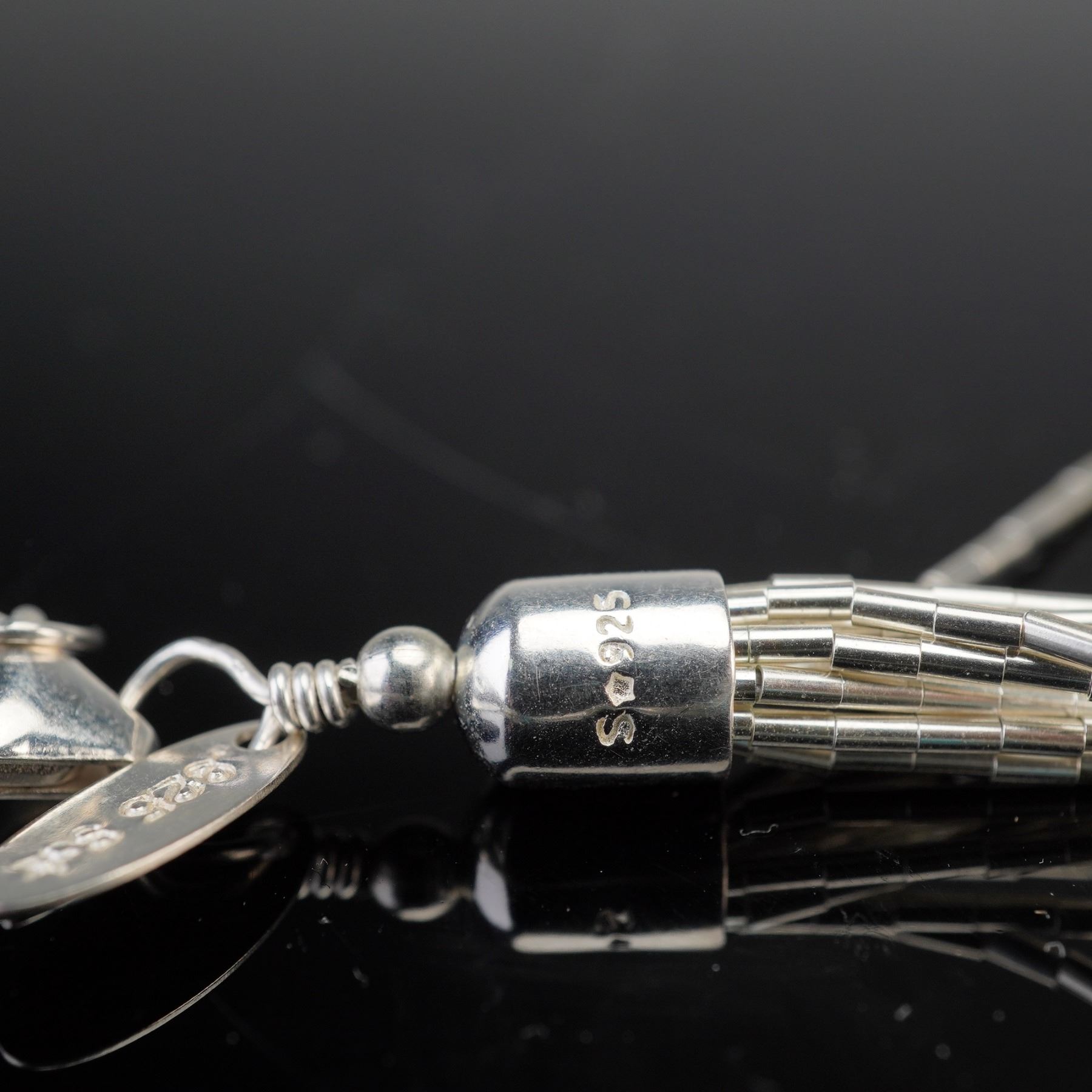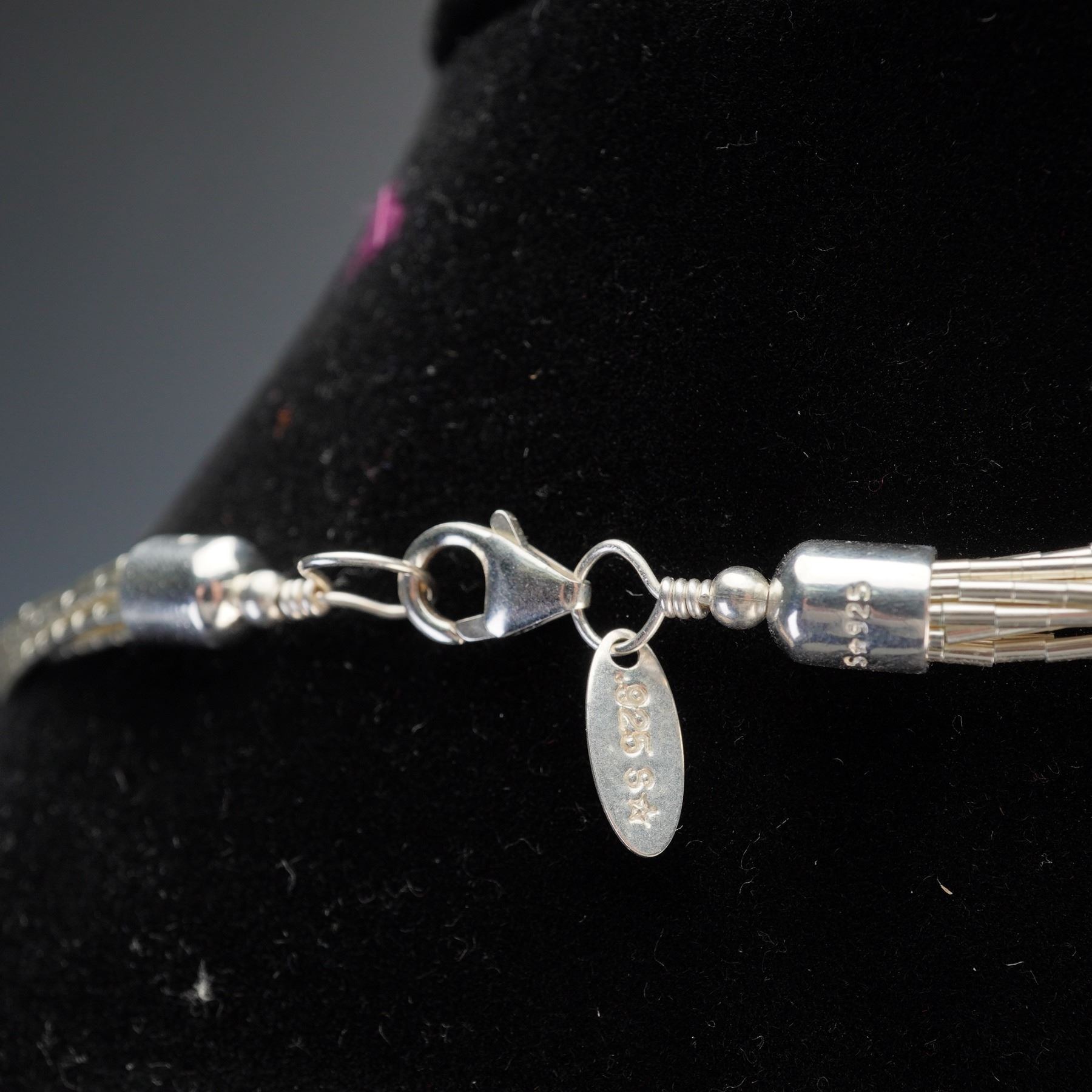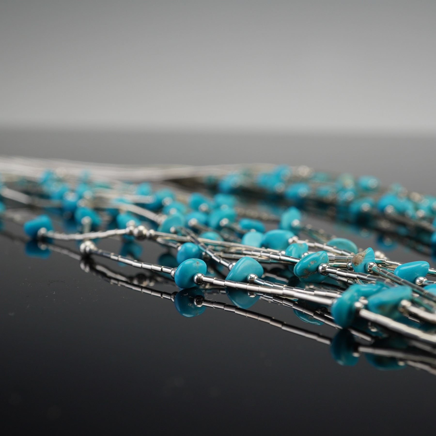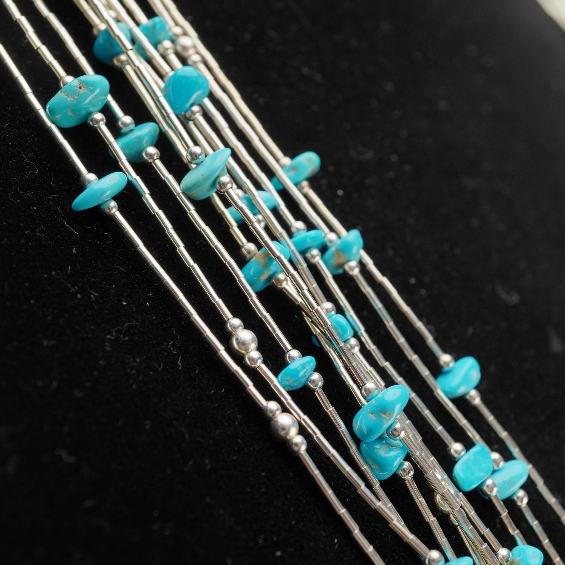 Multi-strand necklace composed of fine sterling silver tubular links and spherical beads, accented with turquoise nugget beads throughout. The clasp and end caps are stamped 925 S with star hallmark. Designed with fluid drape and layered structure that highlights the turquoise stones against polished silver tones. Weight (including stones): 50.2 g.