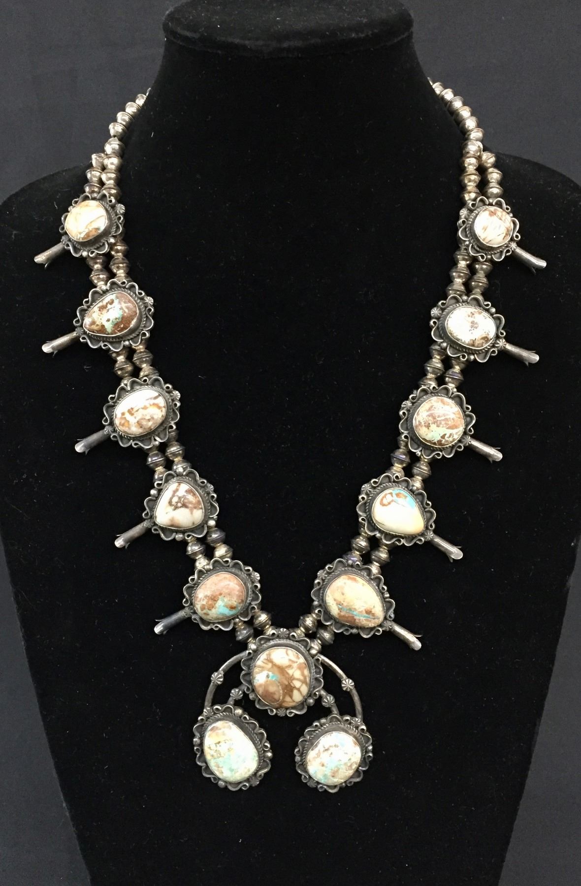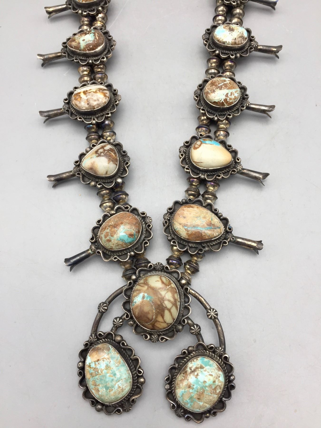 Description: For sale in this lot is a nice sterling silver and turquoise, squash blossom necklace. This necklace features nice turquoise cabochons with a brownish matrix. The naja has three stones, all surrounded by hand crafted sterling silver. Maker: Hallmarked B. Jimenez. Approx. Age: Vintage. Size: Fits a 22” neck. Naja measures 2-5/8”w x 2-1/2” tall. Weighs 195.8 grams. Condition: Good for its age, normal wear expected. Please look closely at the pictures - they are an important part of our description. Shipping: There will be a $5 handling / packaging fee for shipping this lot. The actual cost of postage will be added on top of that.