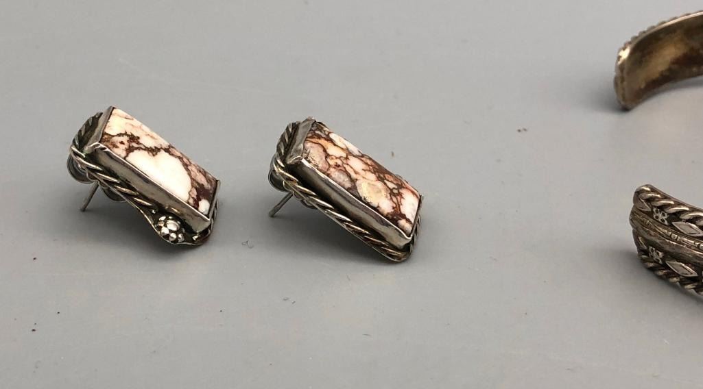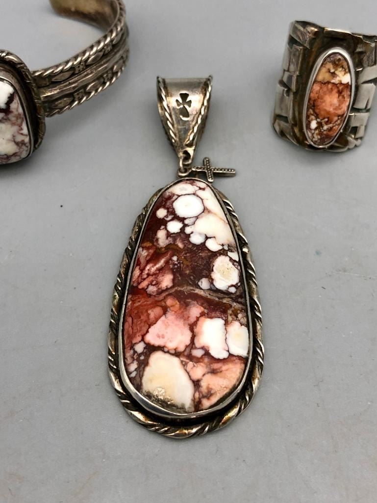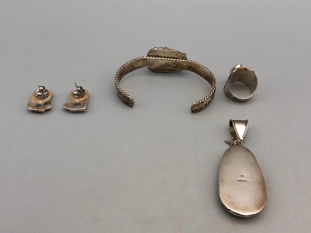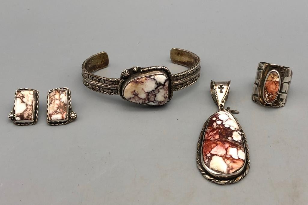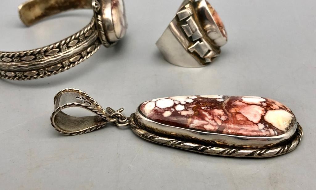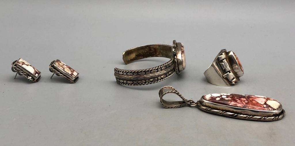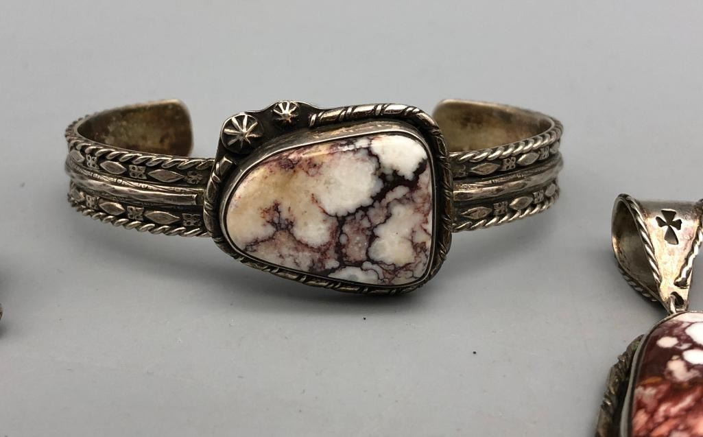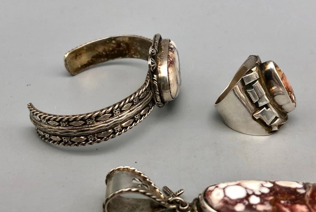 Offered for sale in this lot is a sterling silver and wild-horse four piece set. This set includes a bracelet, ring, earrings, and a pendant that all go very nicely together. Wild Horse is white magnesite with brown mottling and is a semiprecious stone. All are stamped as sterling. Maker: Hallmarked JB on all. Approx. Age: Fairly Modern. Size: Bracelet is 5-1/4 inches, opening is an additional 1-1/2 inch, fitting a 6-3/4 inch wrist. Pendant is 3 inches long X 1 inch wide. Ring is a size 8. Earrings are 7/8 inches long X 5/8 inch wide. Weighs 76.7 grams. Condition: Good for their age, normal wear expected. Please look closely at the pictures - they are an important part of our description. Shipping: There will be a $5 handling / packaging fee for shipping this lot. The actual cost of postage will be added on top of that. BUY IT NOW: If you would like to buy this item now without waiting for the auction to end (this option is only available up to 48 hours before the auction starts to close), the “Buy it Now” price is the high estimate of this lot. If you would like to end the auction early and pay the high estimate (plus applicable fees), please contact us by phone or email and reference this lot number.