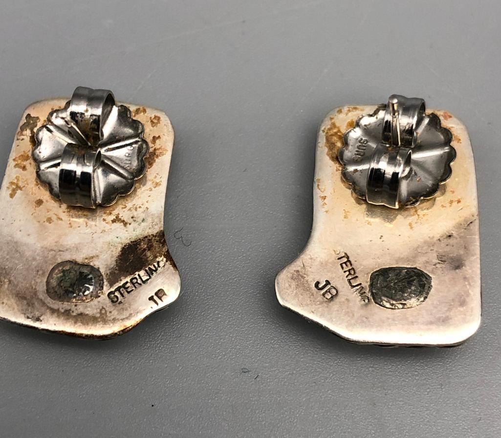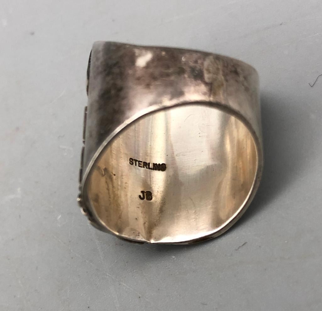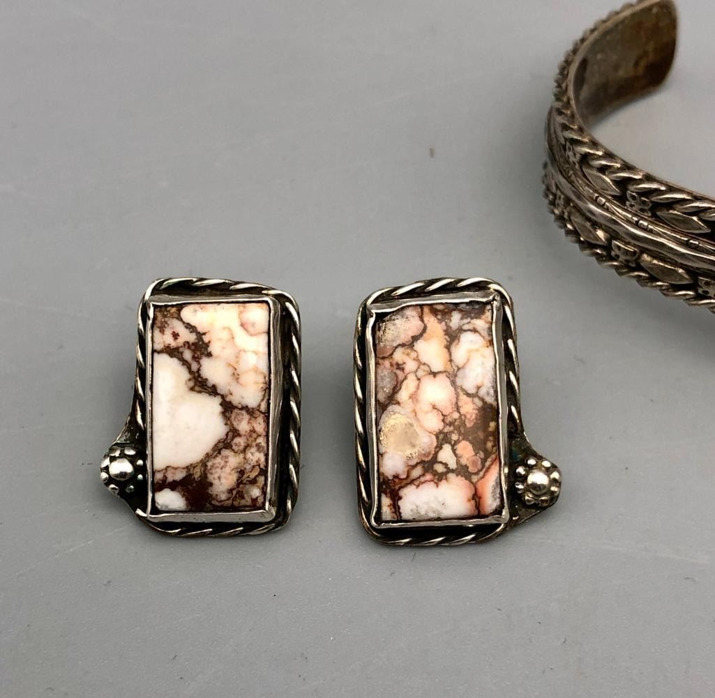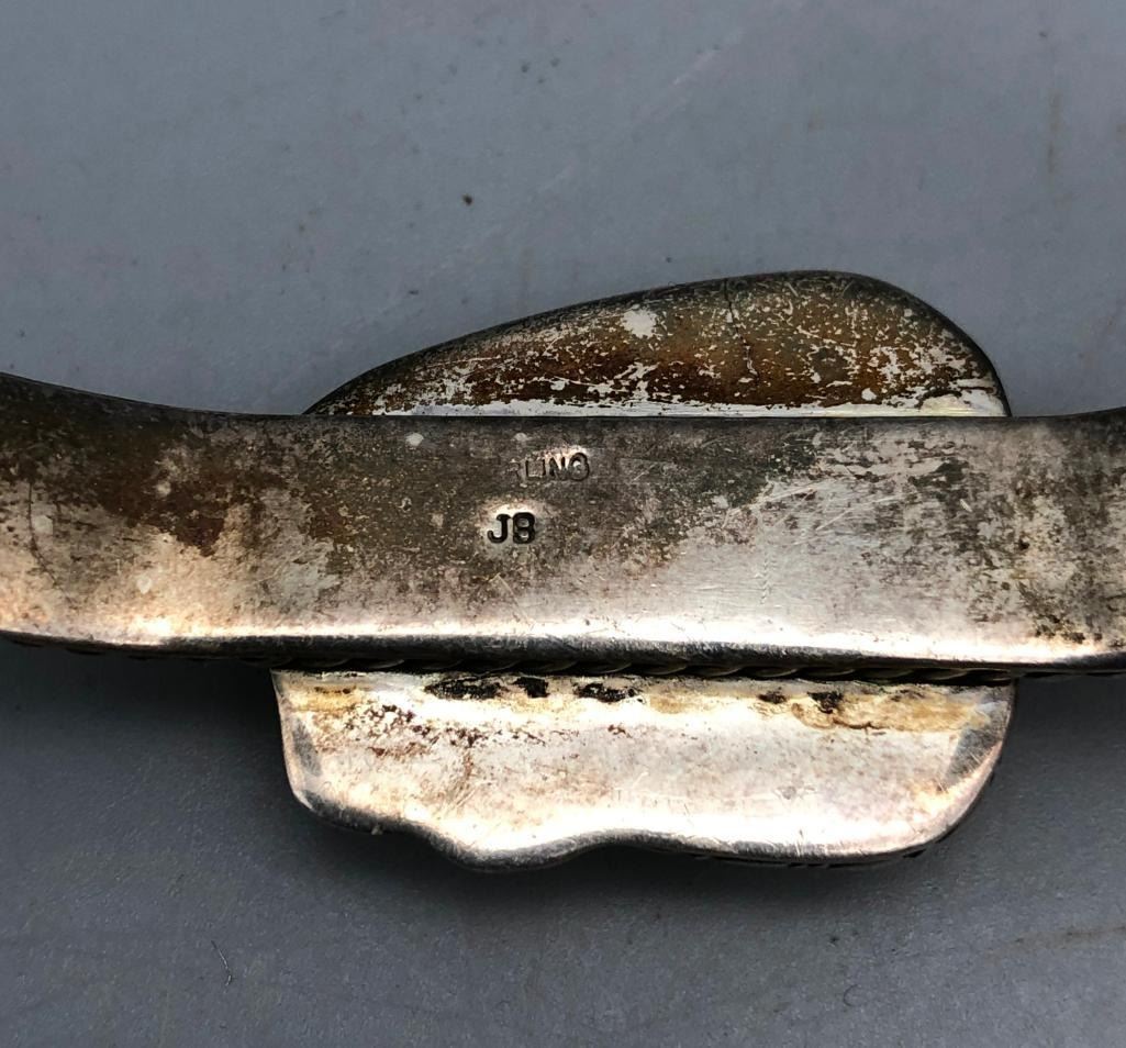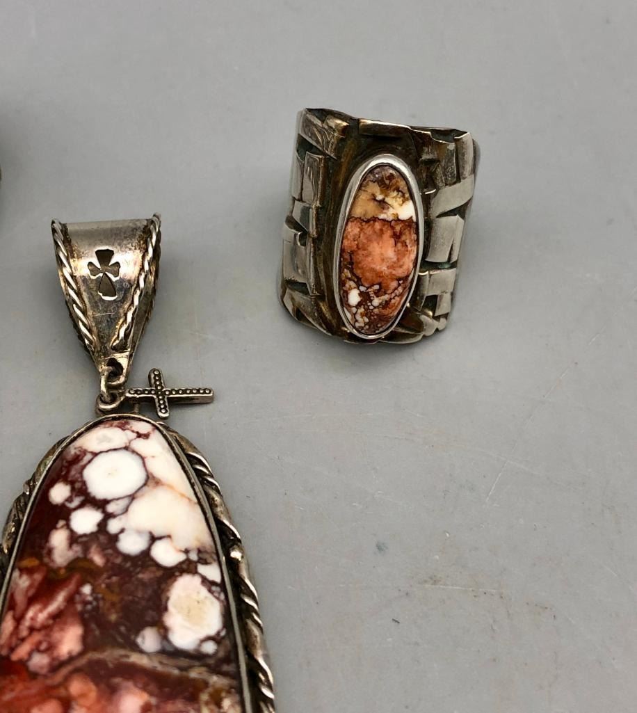 Offered for sale in this lot is a sterling silver and wild-horse four piece set. This set includes a bracelet, ring, earrings, and a pendant that all go very nicely together. Wild Horse is white magnesite with brown mottling and is a semiprecious stone. All are stamped as sterling. Maker: Hallmarked JB on all. Approx. Age: Fairly Modern. Size: Bracelet is 5-1/4 inches, opening is an additional 1-1/2 inch, fitting a 6-3/4 inch wrist. Pendant is 3 inches long X 1 inch wide. Ring is a size 8. Earrings are 7/8 inches long X 5/8 inch wide. Weighs 76.7 grams. Condition: Good for their age, normal wear expected. Please look closely at the pictures - they are an important part of our description. Shipping: There will be a $5 handling / packaging fee for shipping this lot. The actual cost of postage will be added on top of that. BUY IT NOW: If you would like to buy this item now without waiting for the auction to end (this option is only available up to 48 hours before the auction starts to close), the “Buy it Now” price is the high estimate of this lot. If you would like to end the auction early and pay the high estimate (plus applicable fees), please contact us by phone or email and reference this lot number.