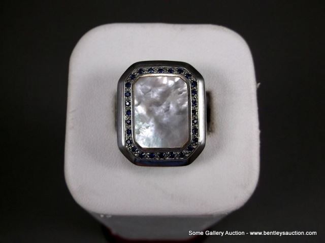 Sterling Silver w/ Mother of Pearl & Sapphires Marked with Double Loop, Size 7 1/8 Weight: 17.6 Gram
