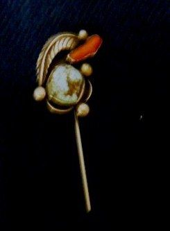 This stick pin has a large turquoise stone and a coral stone. The stick pin is 3 inches long. The stones are surrounded with large carved leaf. Shipping $14.50 Condition Good