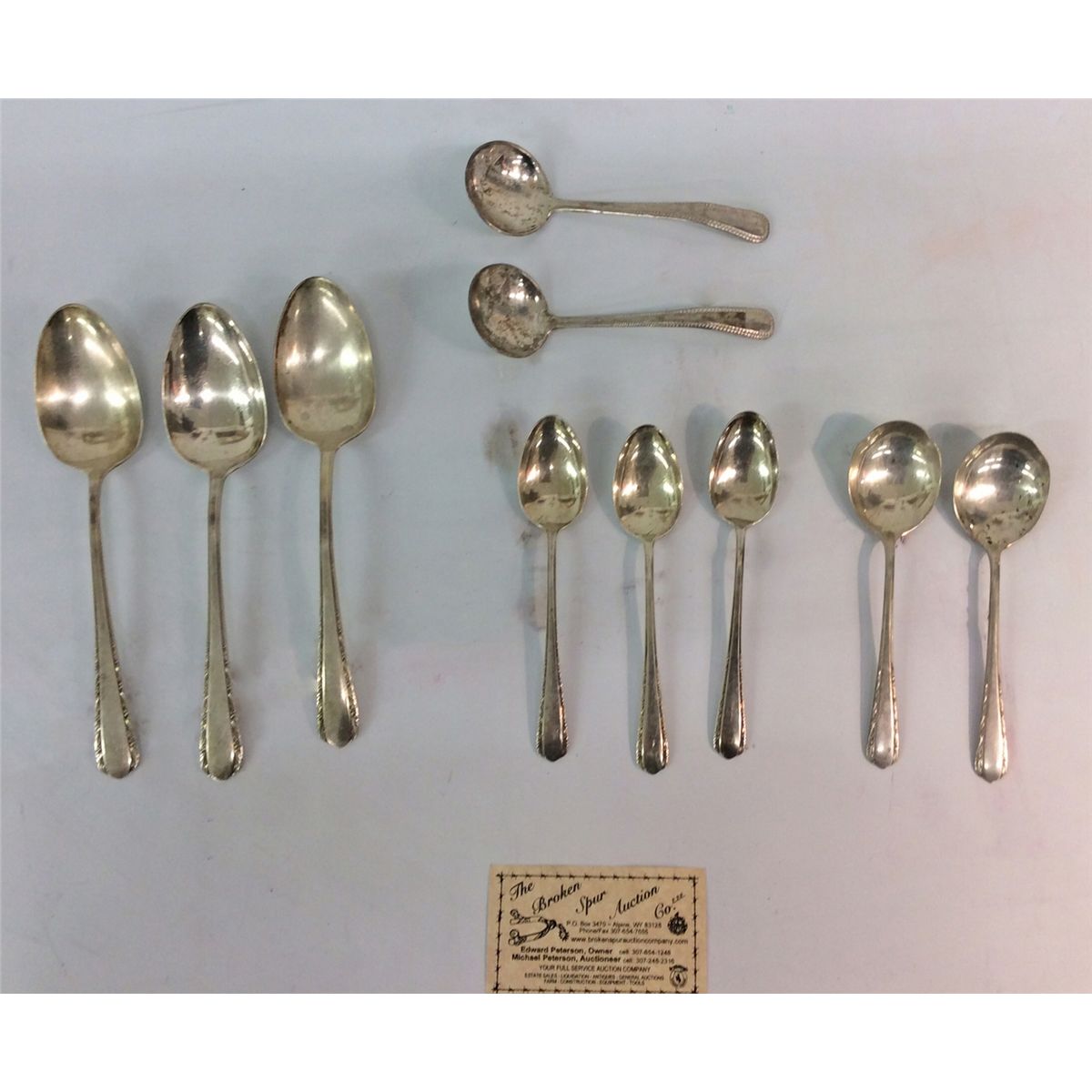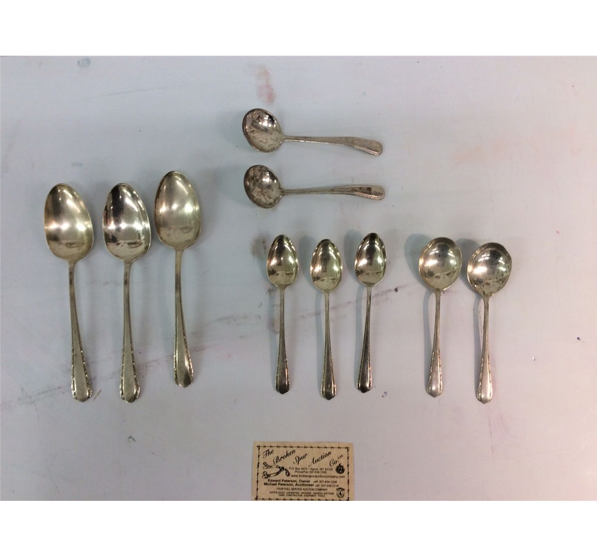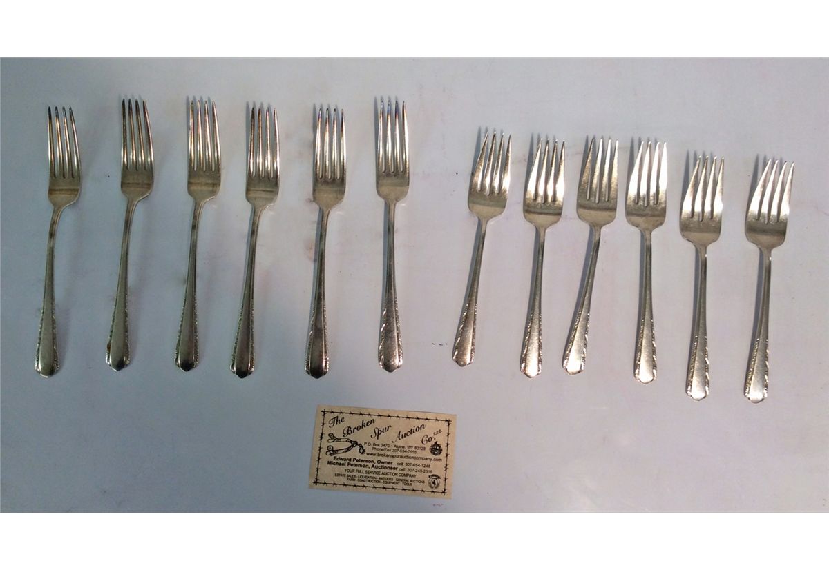 11 sterling silver Salad forks, 11 sterling silver dinner forks - 5 sterling silver large spoons, 2 sterling silver soup spoons, 17 sterling silver dinner spoons - 12 sterling silver handled stainless steel ends butter knives - Assorted plated silver teaspoons, lg. fork & lg. spoon late 1800’s early 1900’s