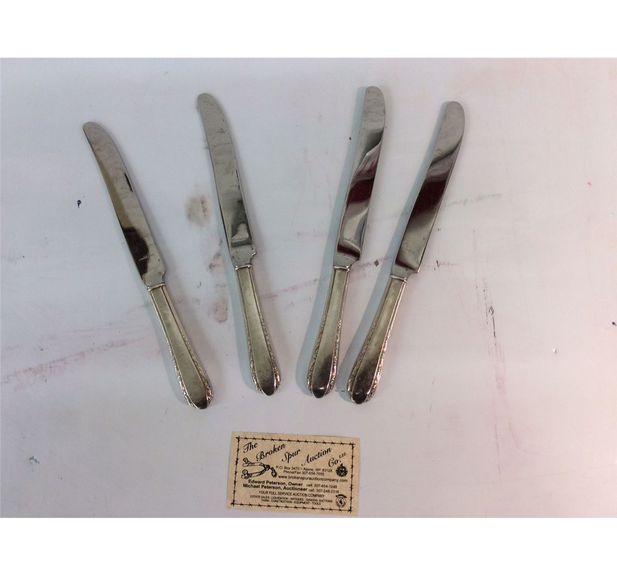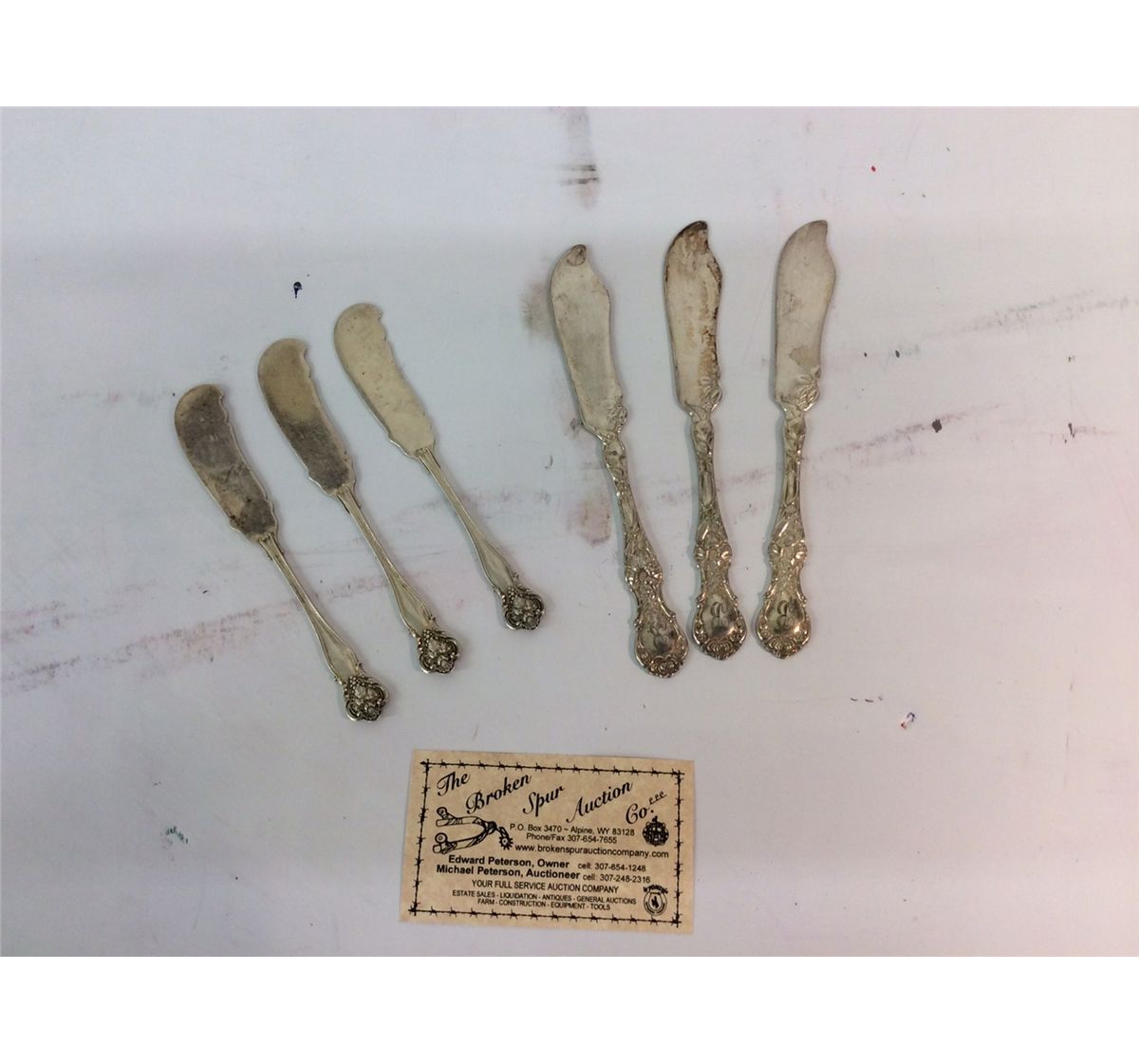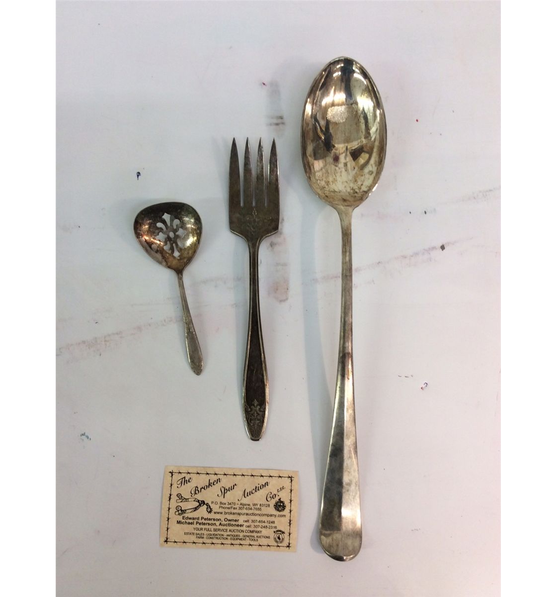 11 sterling silver Salad forks, 11 sterling silver dinner forks - 5 sterling silver large spoons, 2 sterling silver soup spoons, 17 sterling silver dinner spoons - 12 sterling silver handled stainless steel ends butter knives - Assorted plated silver teaspoons, lg. fork & lg. spoon late 1800’s early 1900’s